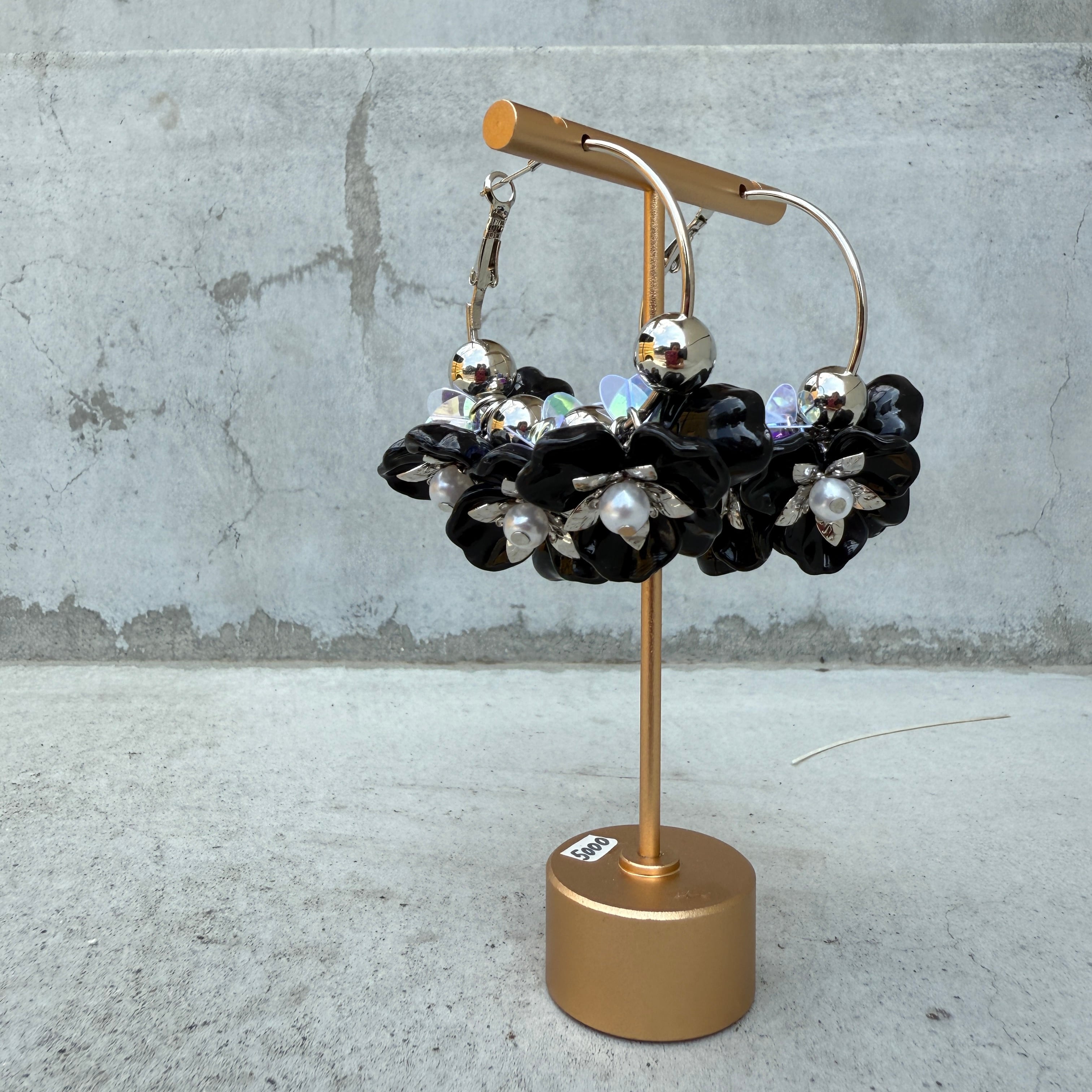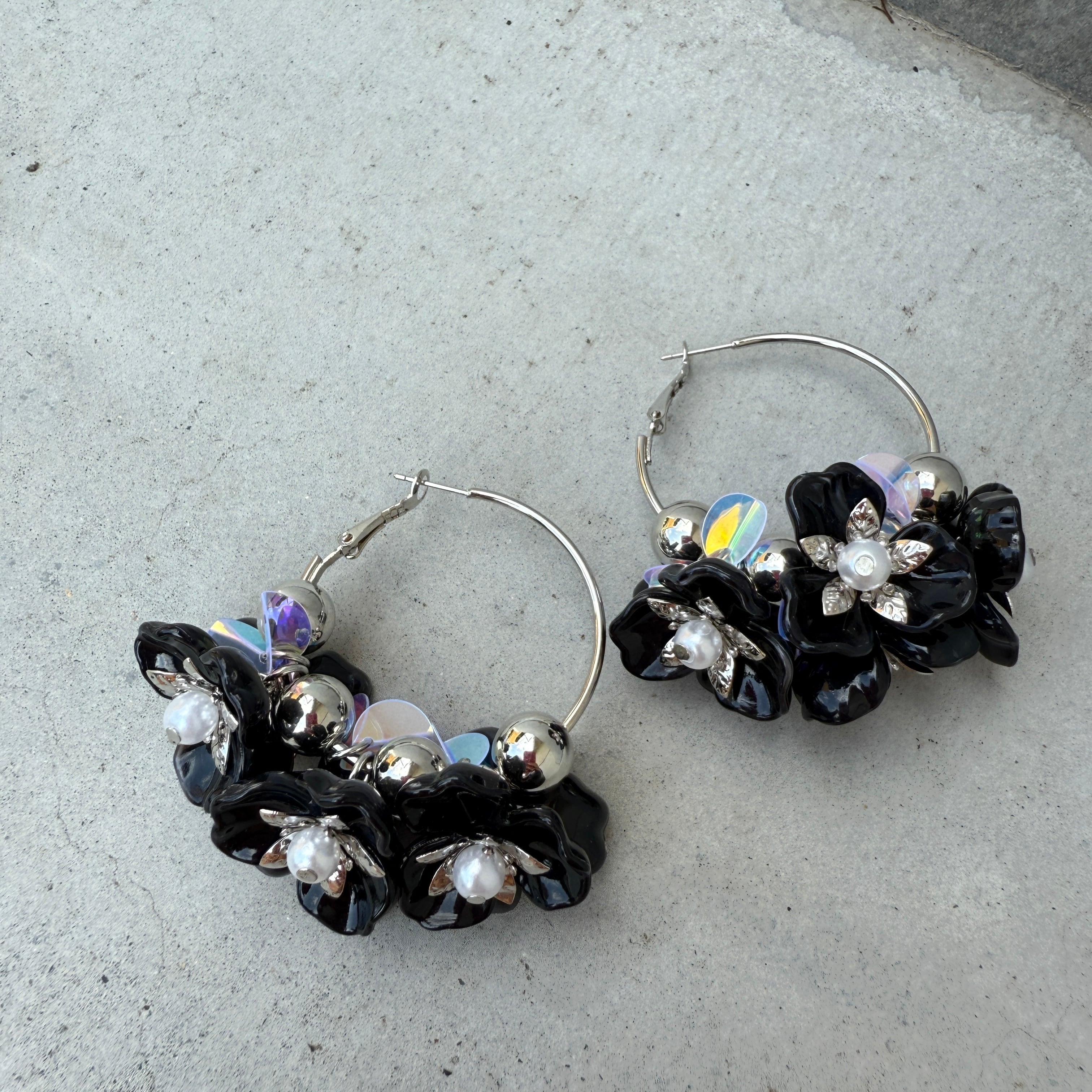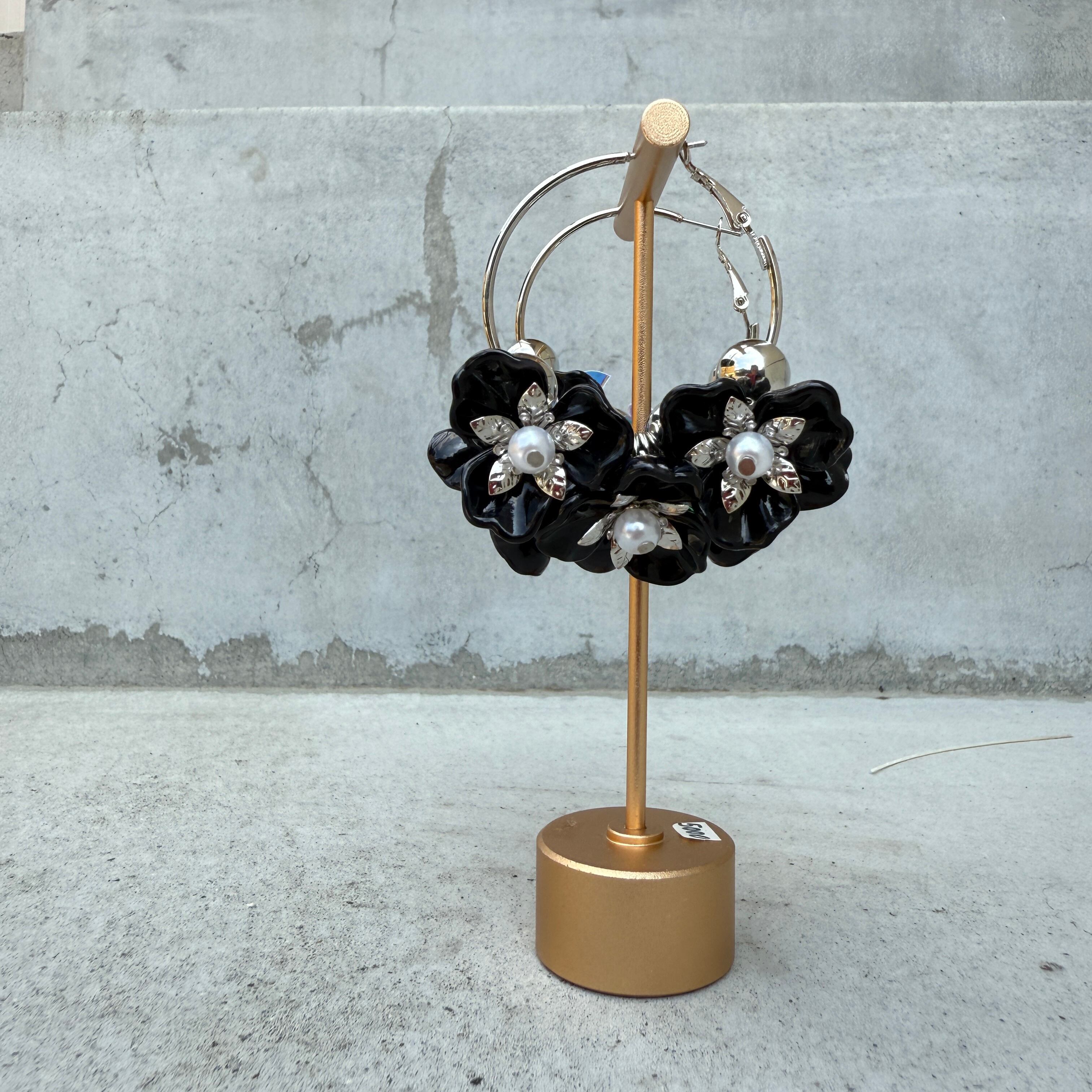 ボリュームフラワーフープピアス★Black × Silver✨NO.856