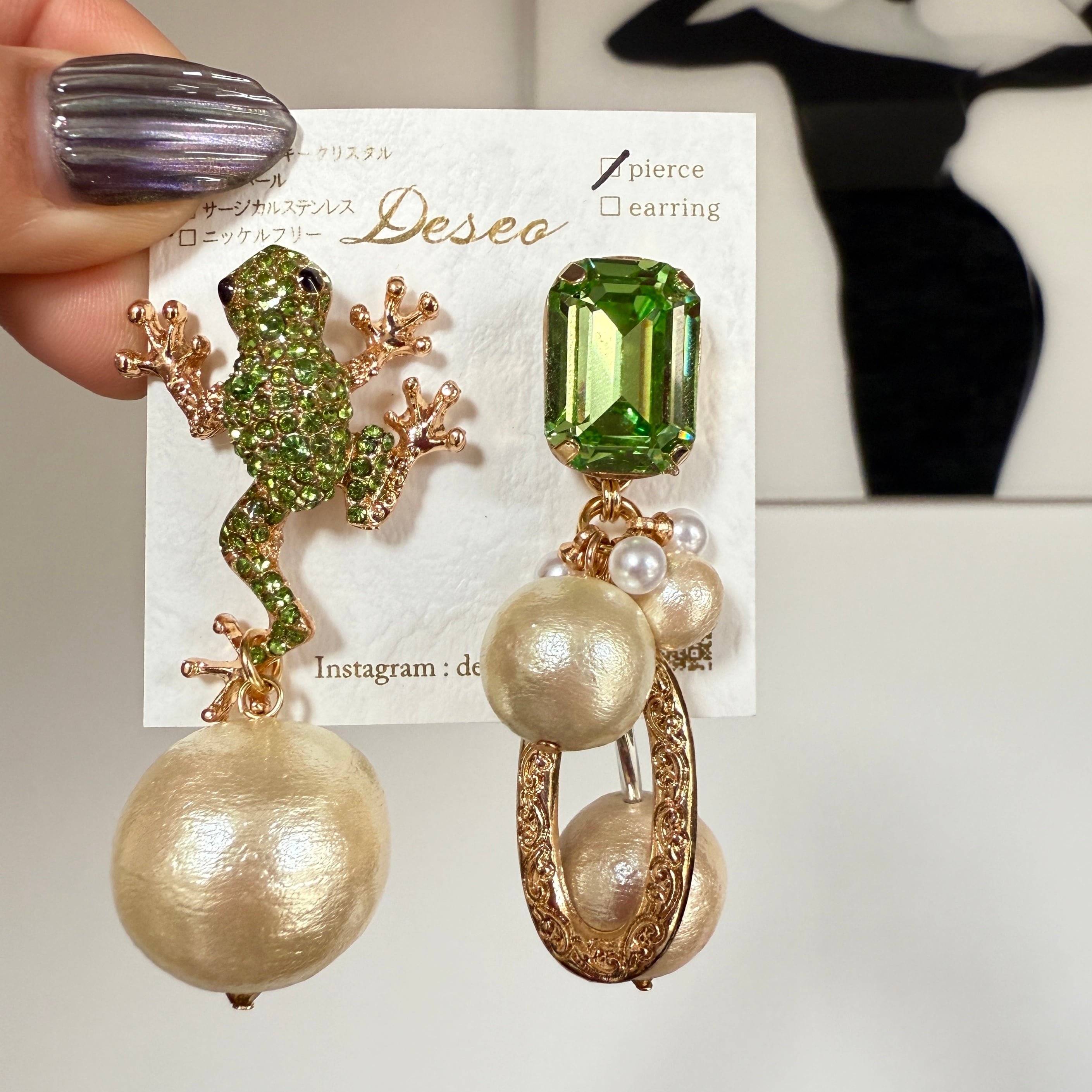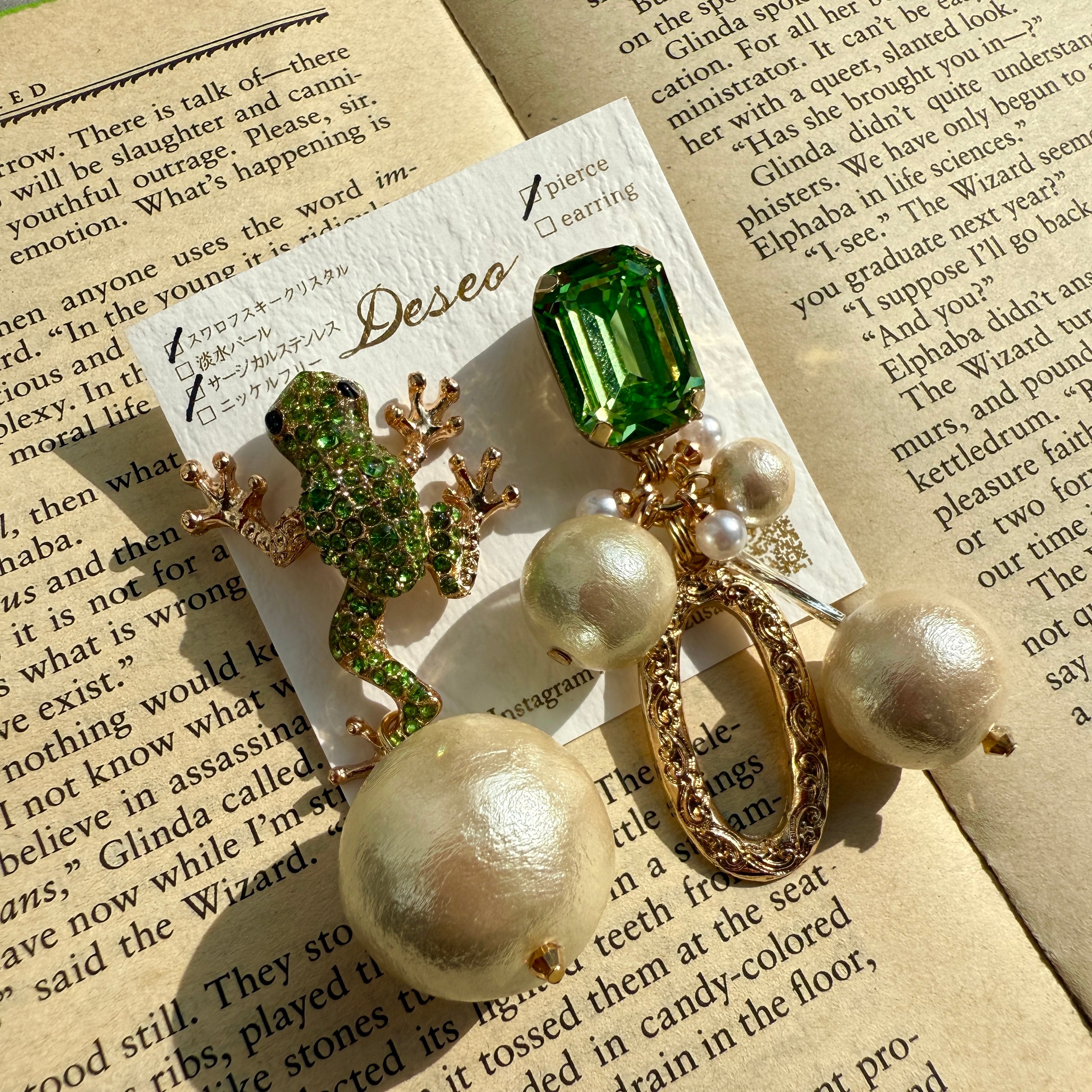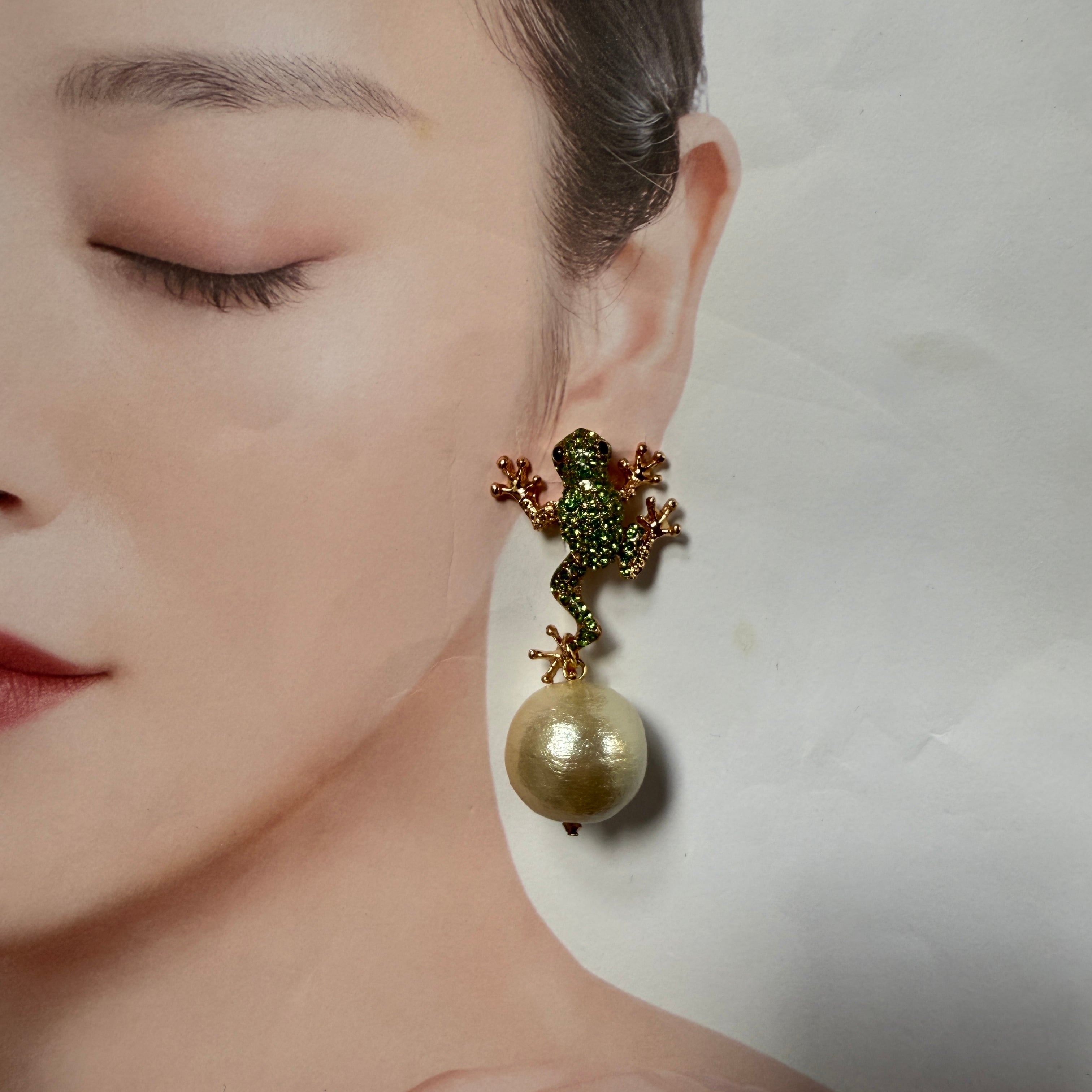 イヤリングはカエルが小さめで、どうしてもクリップ金具が付けられず、カエルの方だけネジバネ金具になってます!