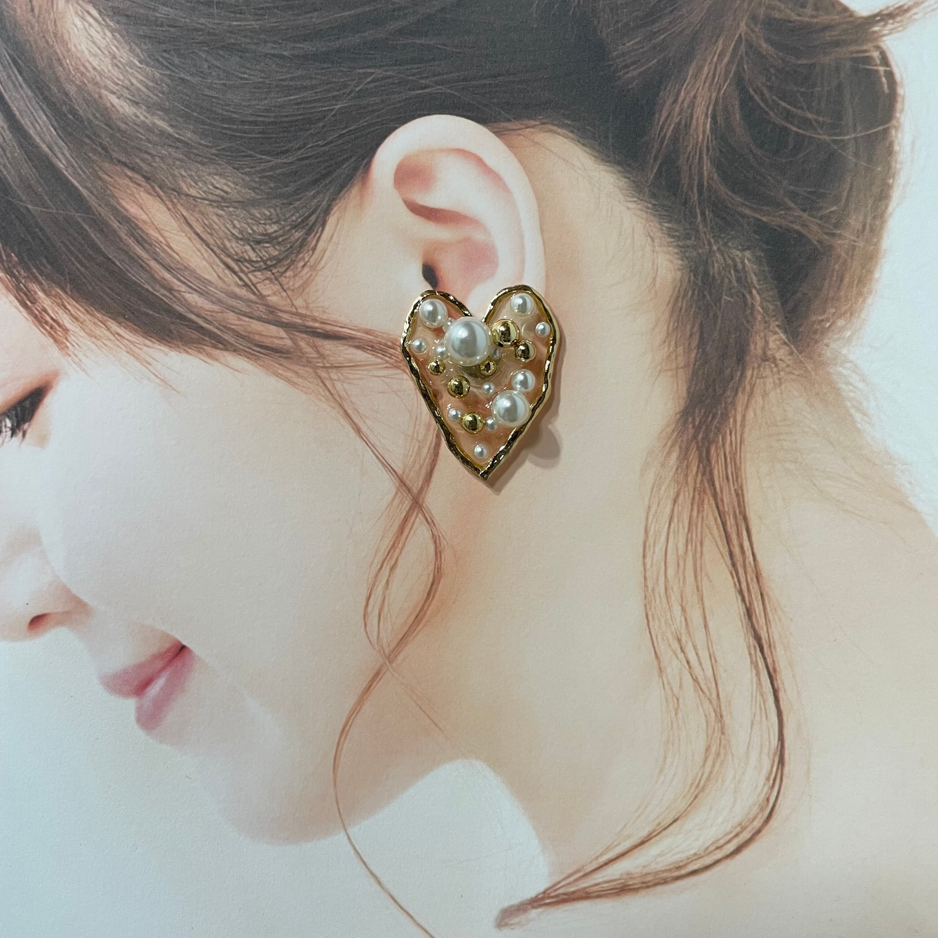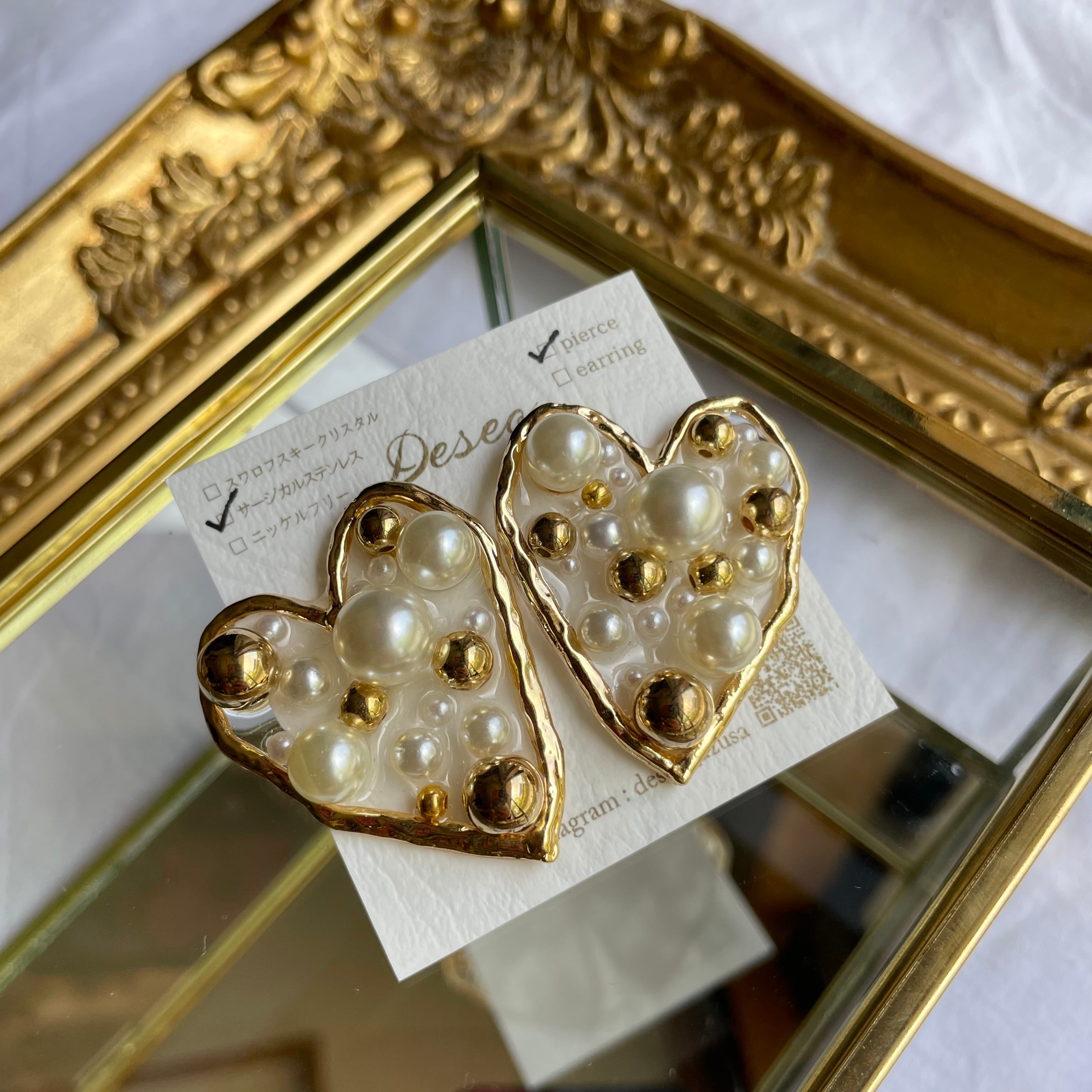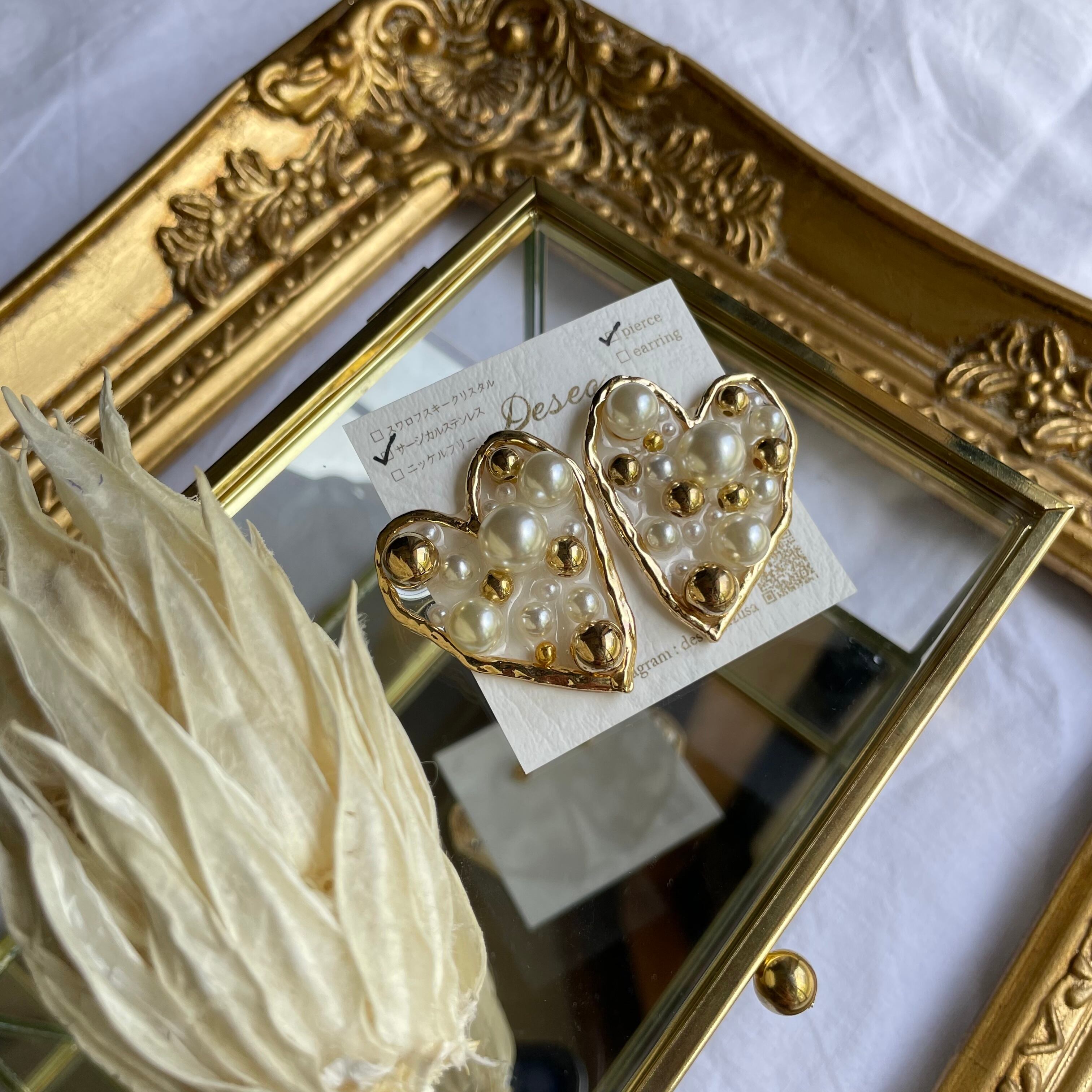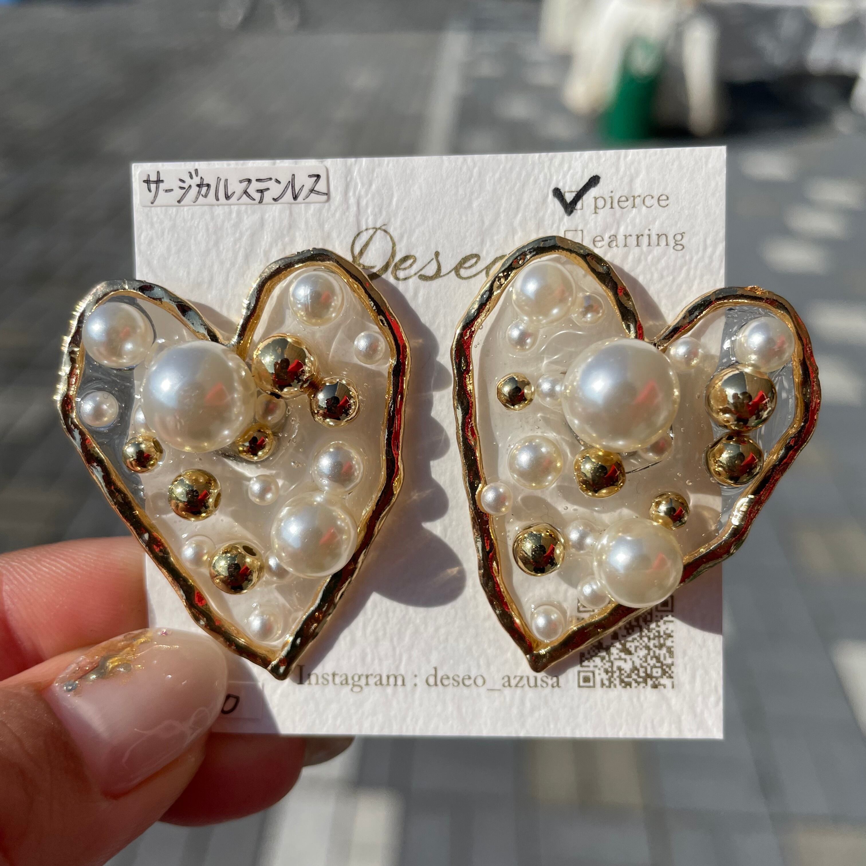 パールたっぷり♡ハート耳アクセ✨ハートピアス.ハートイヤリング♡パールピアス.パールイヤリング♡レジンハート耳アクセ✨NO.49