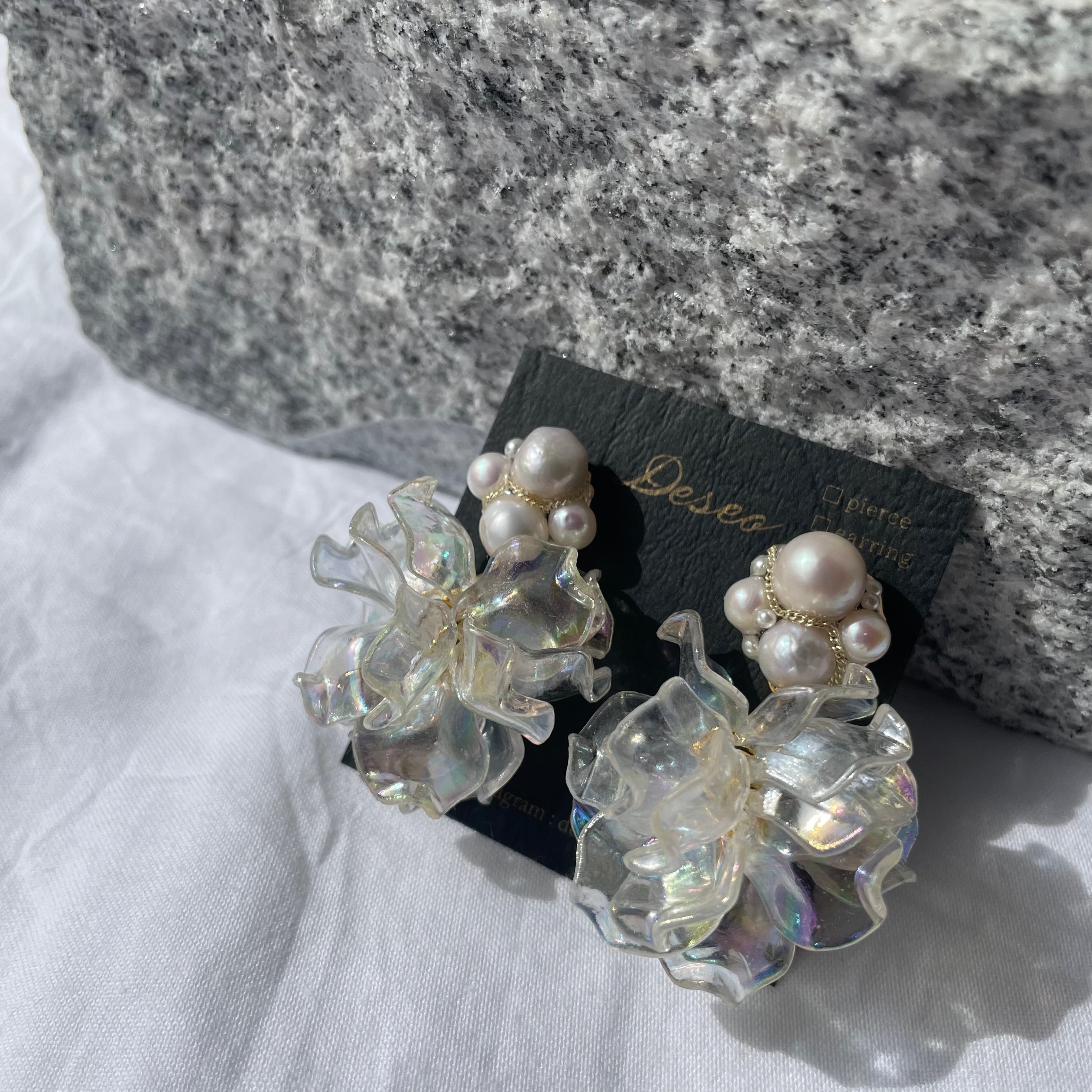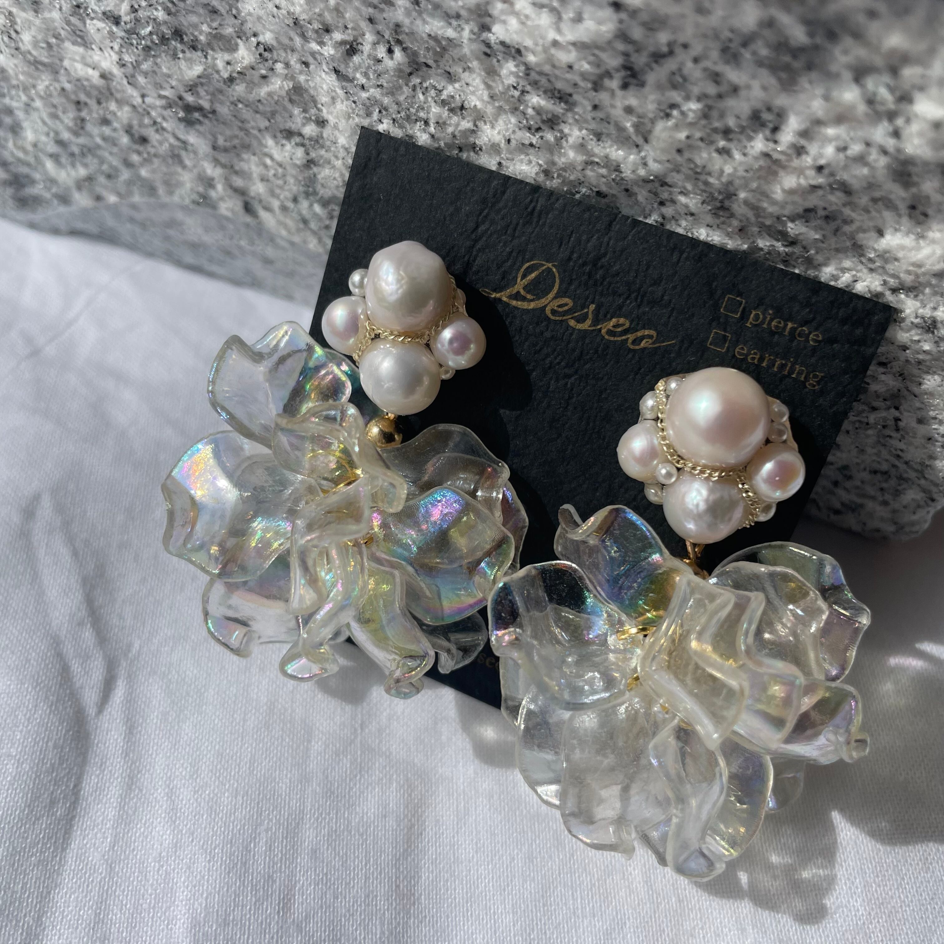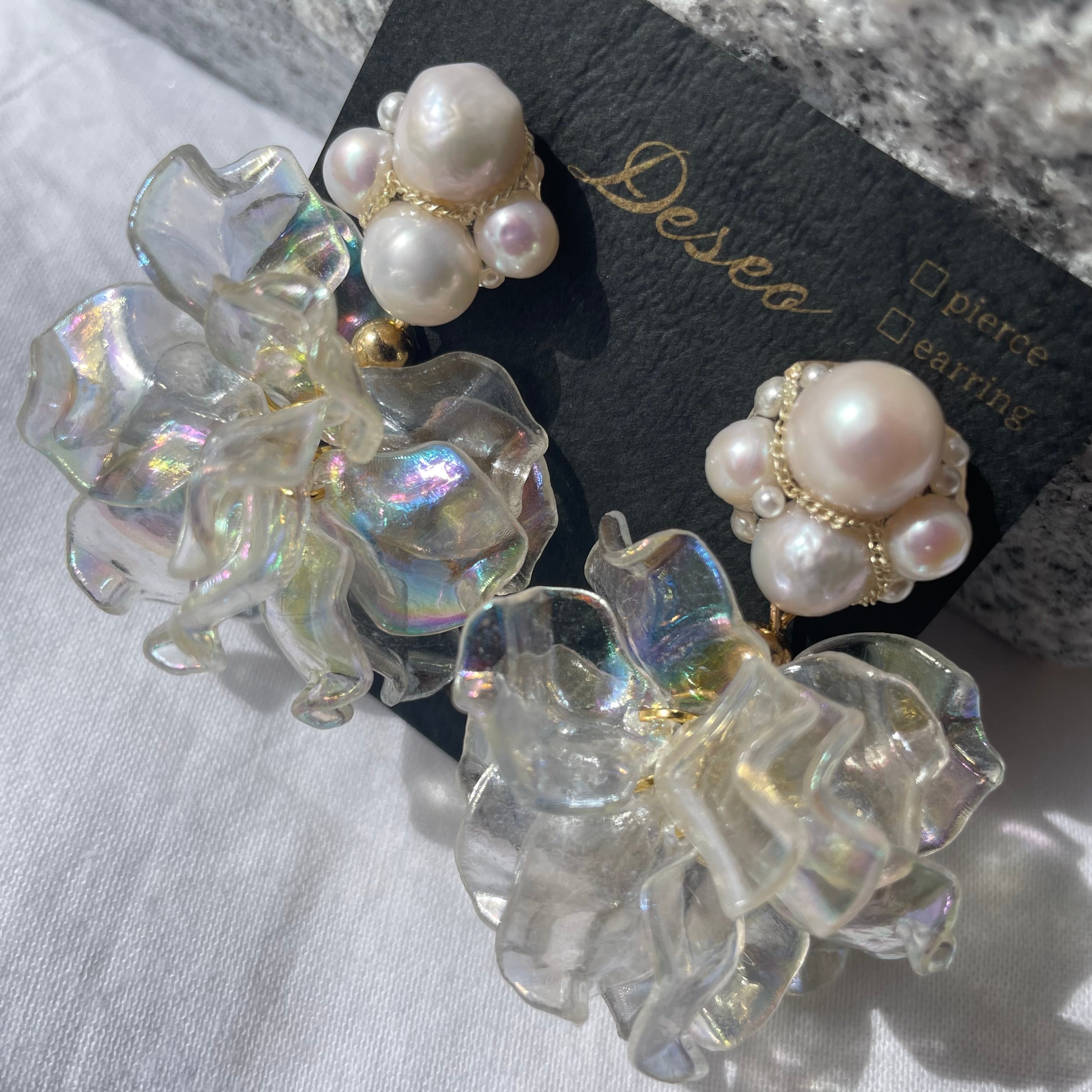 たっぷり淡水パール✨オーロラボリューム花びら♡耳アクセサリー✨淡水パールピアス.淡水パールイヤリング♡お花ピアス.お花イヤリング♡NO.83