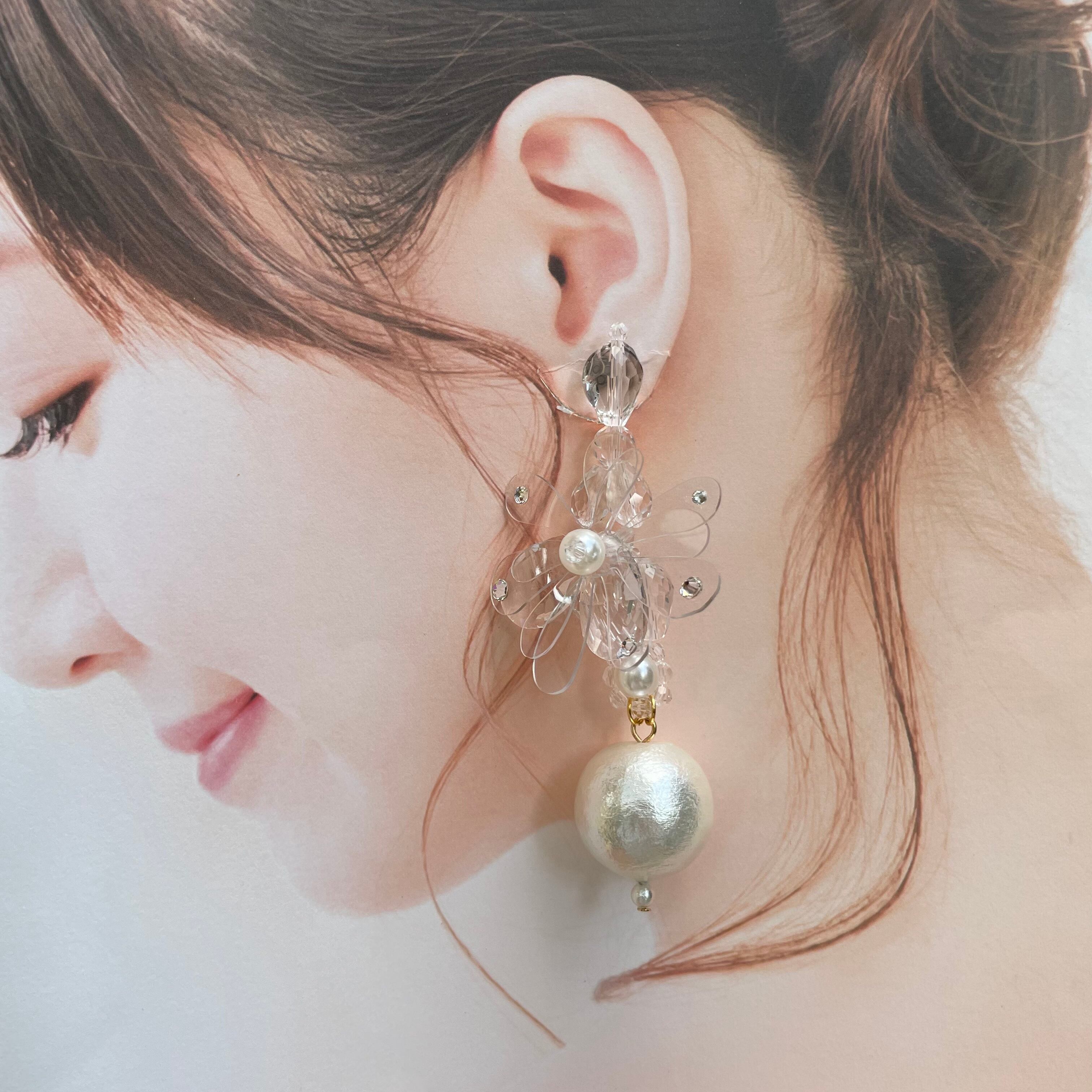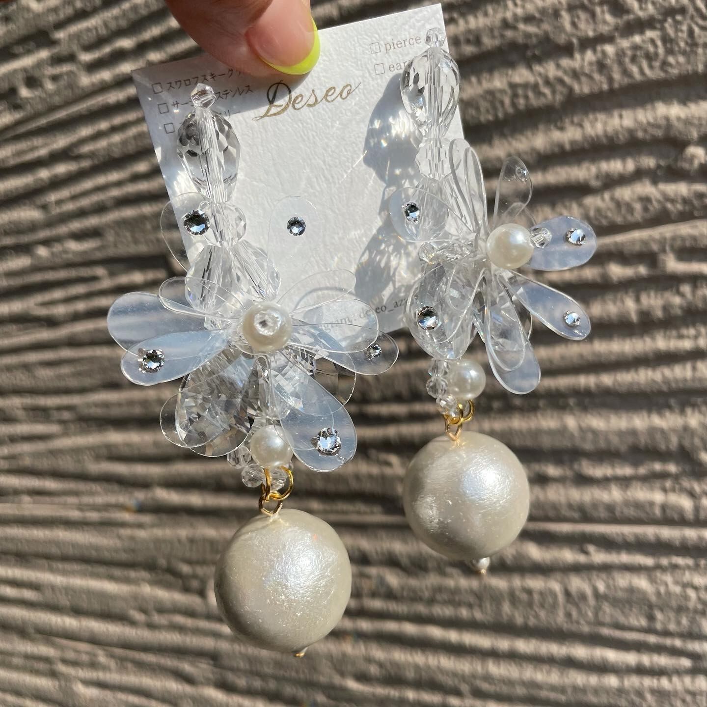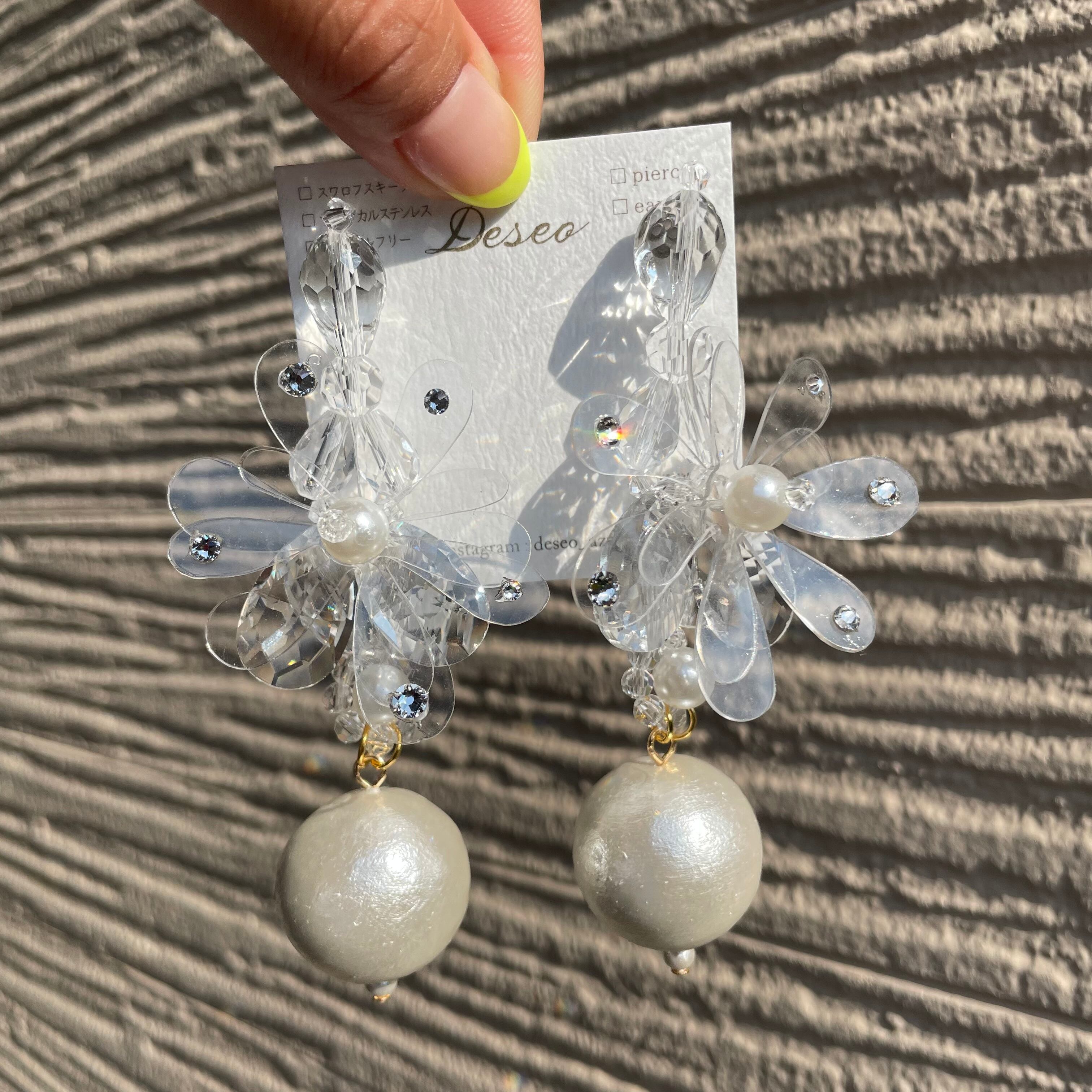 クリアビーズ× Flower × スワロフスキー✨大ぶりピアス.大ぶりイヤリング♡お花ピアス.お花イヤリング♡BIGパールピアス.BIGパールイヤリング✨NO.96