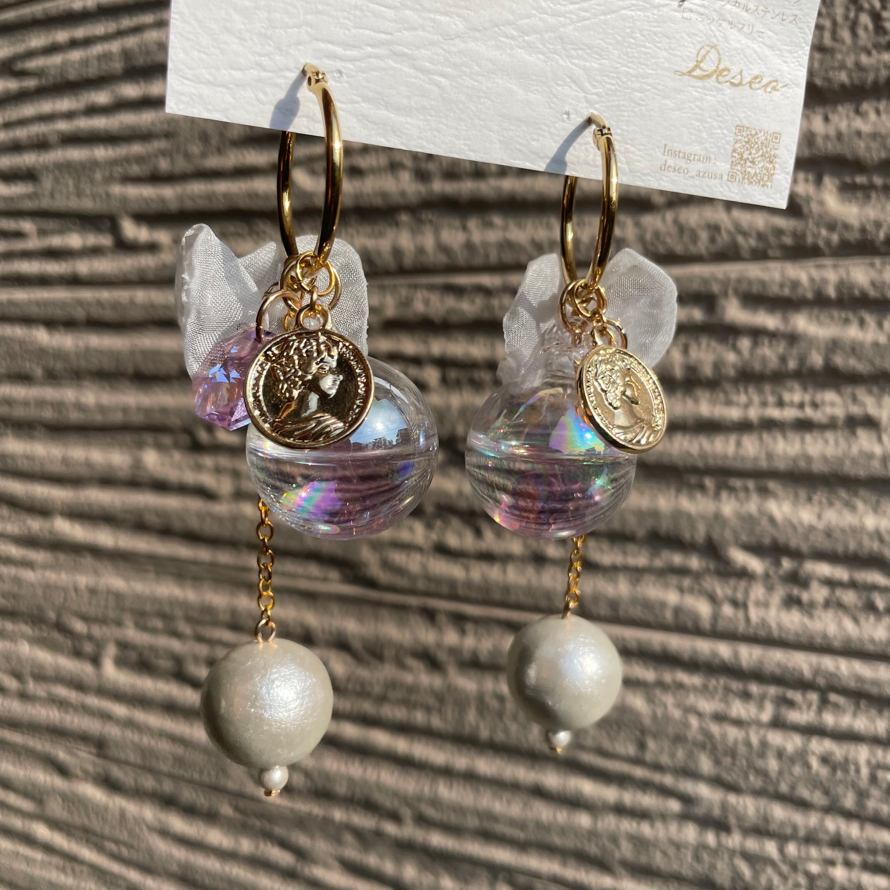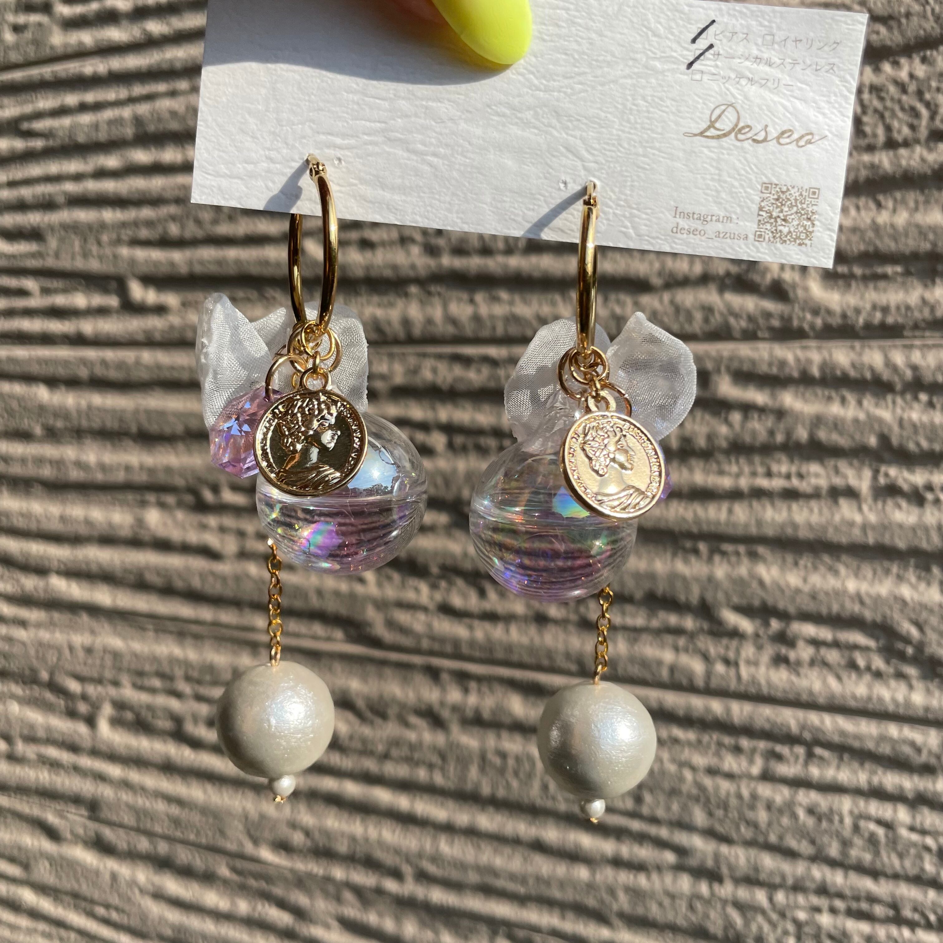 パープルのオーロラガラスボールにパープルのスワロフスキー、ふわっとシフォンを合わせ、仕上げは、揺れるコットンパール❤️
