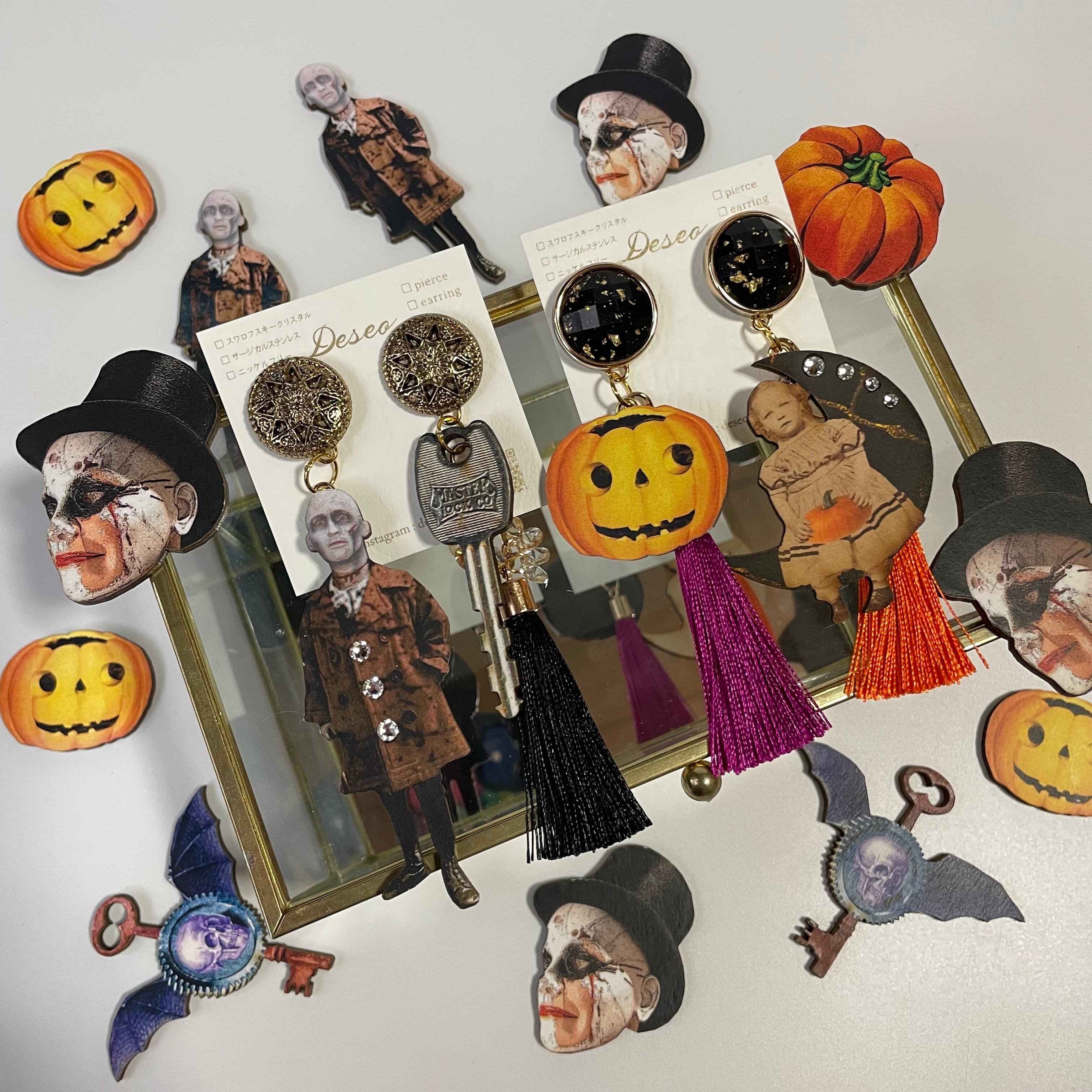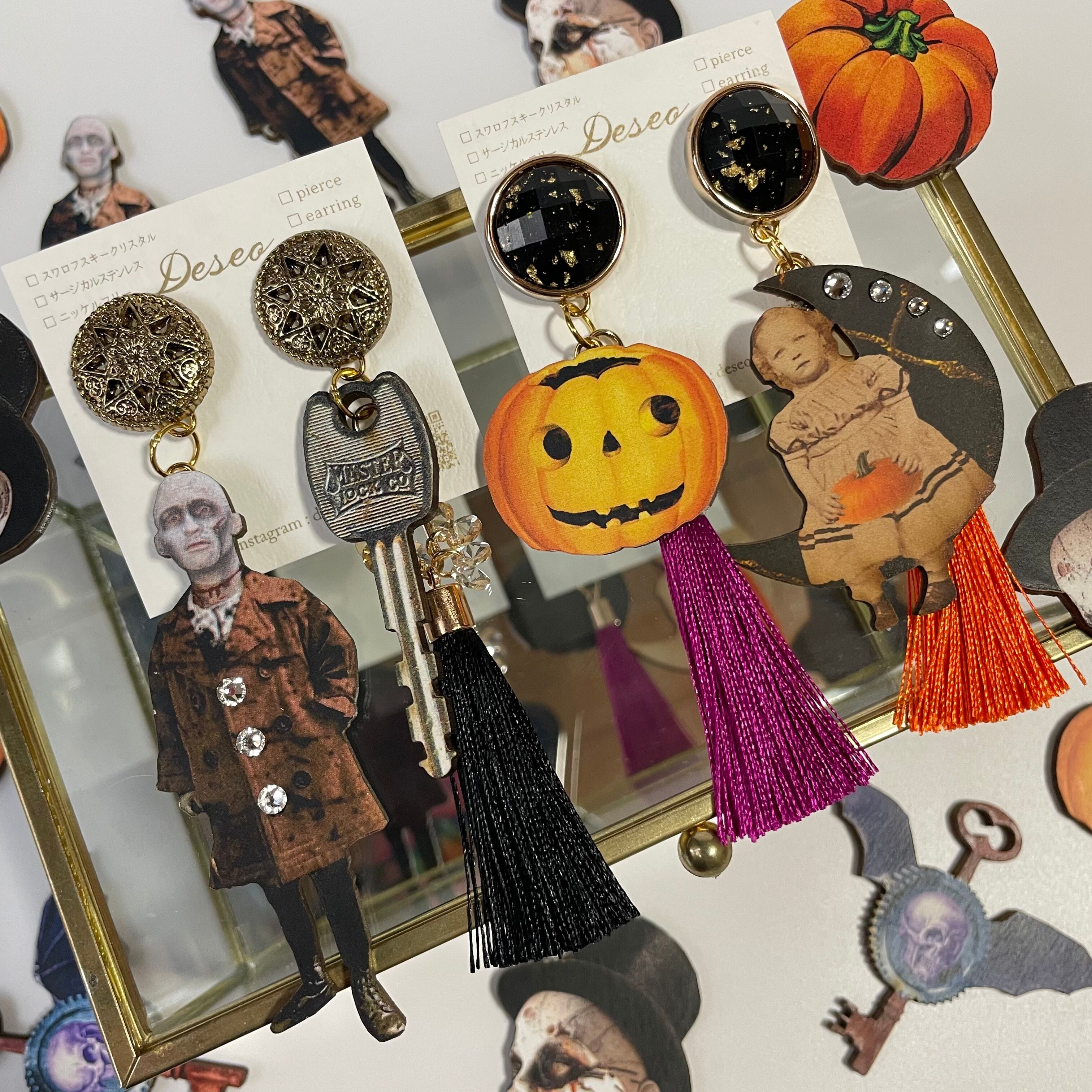 アンティークボタンのようなトップに、Halloweenらしいパーツを合わせ、大ぶりに仕上がってます