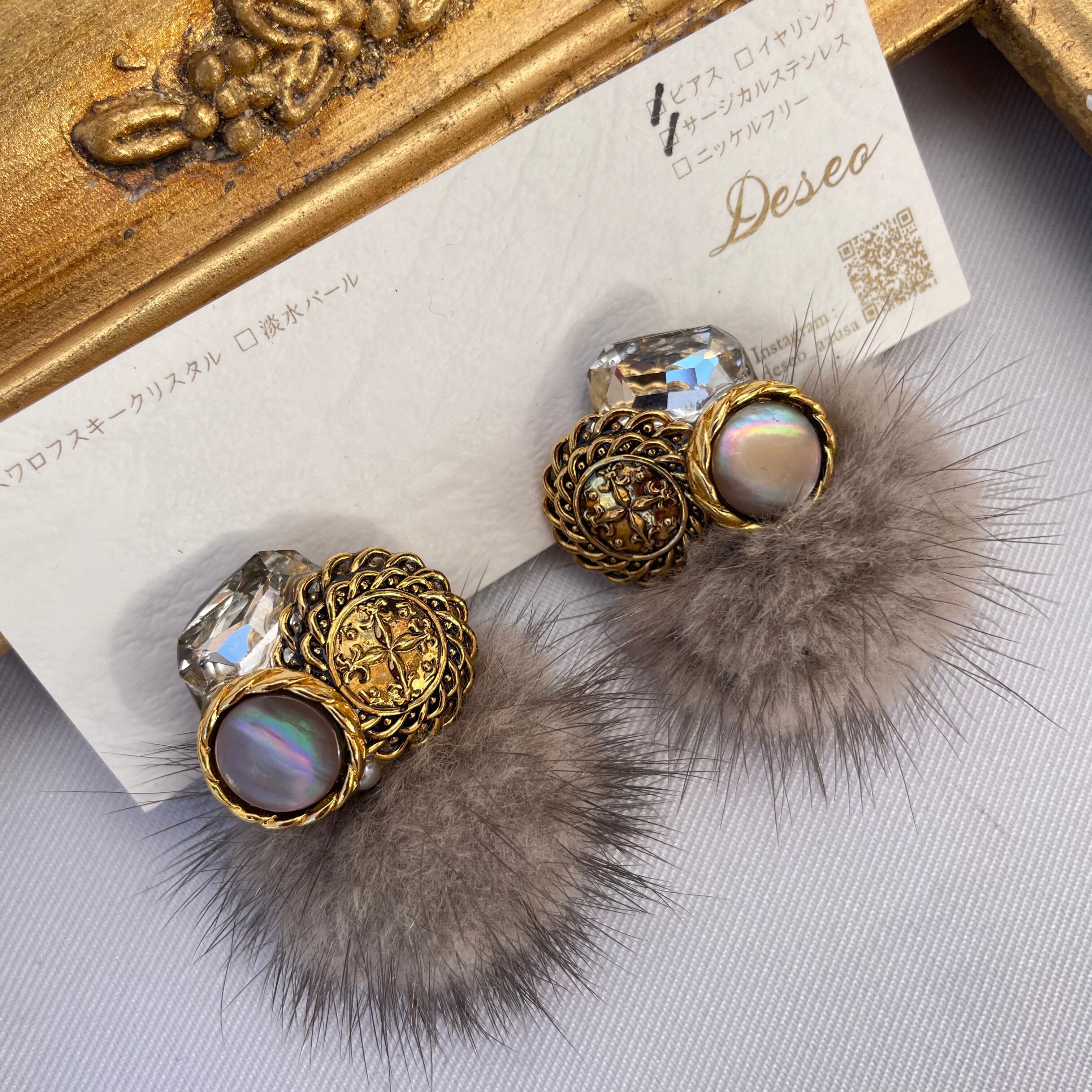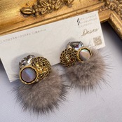 黒蝶貝シェルボタン★ボタンビジュー×グレージュミンクファーピアス ミンクファーイヤリング ボタンピアス ボタンイヤリング NO.193