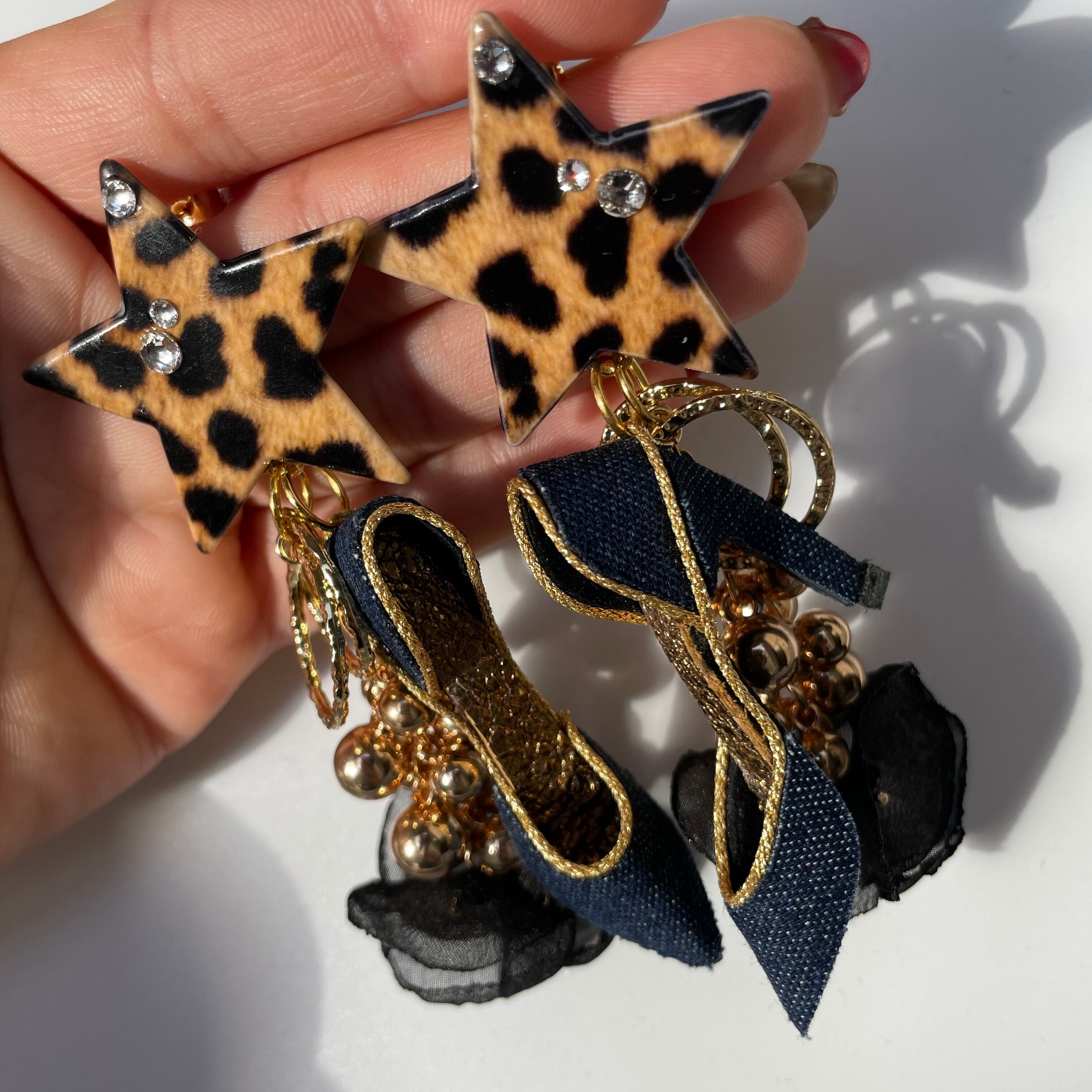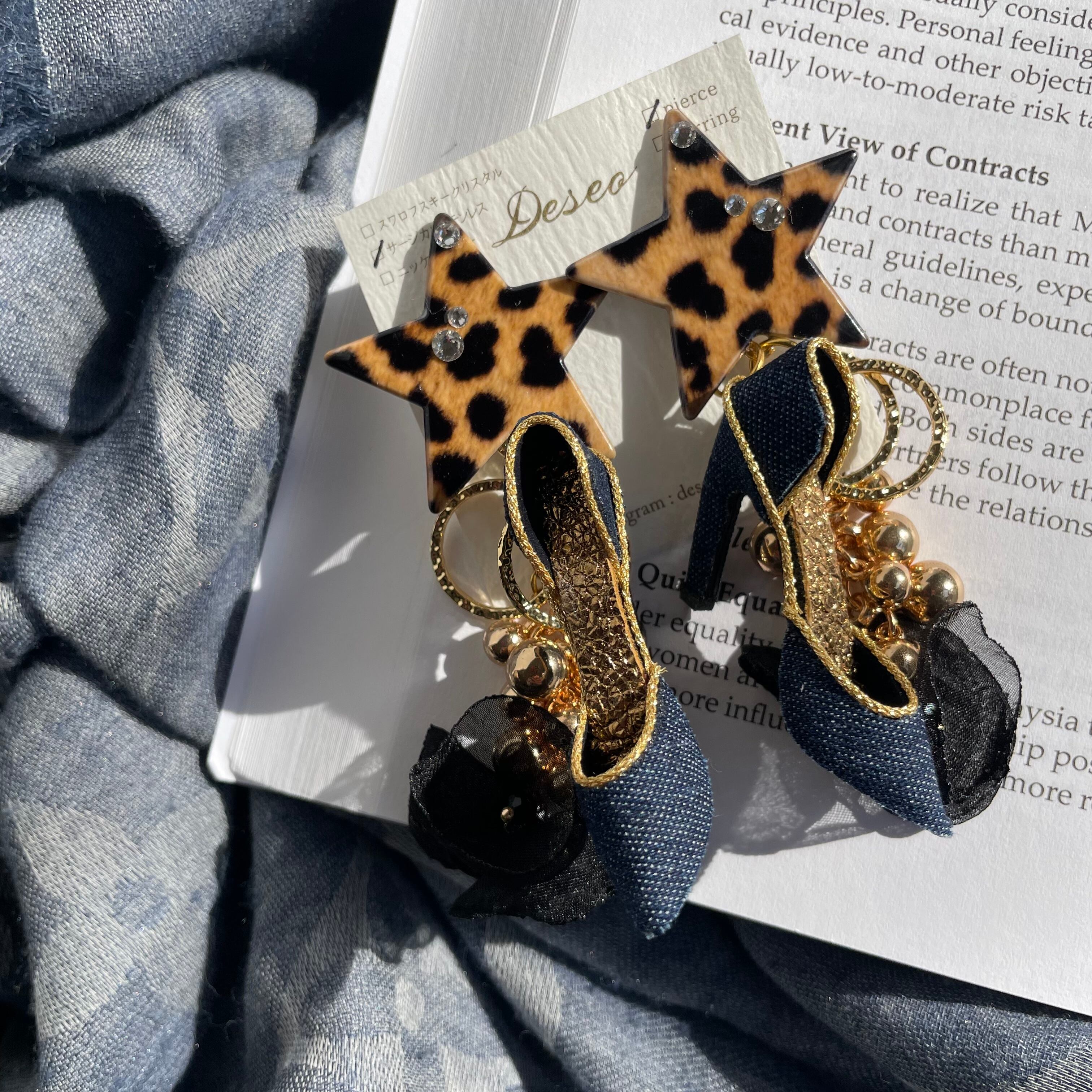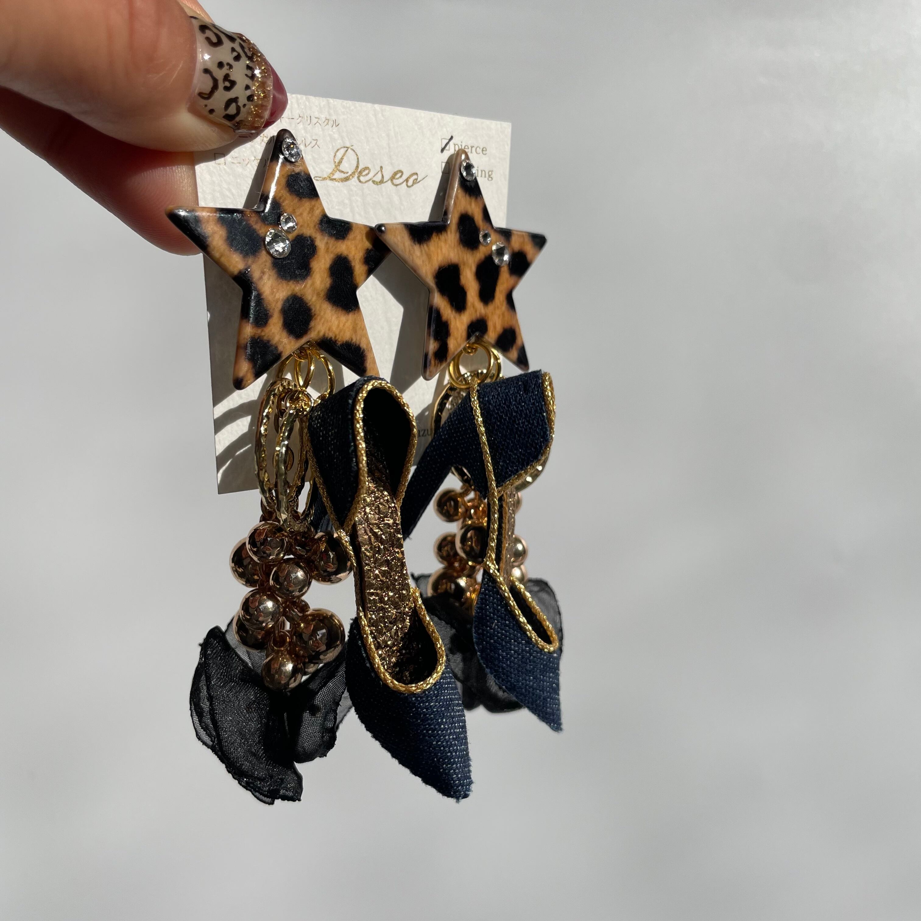 デニムハイヒール❤️星レオパードピアス レオパードイヤリング ハイヒールピアス ハイヒールイヤリング ヒョウ柄ピアス ヒョウ柄イヤリング NO.225