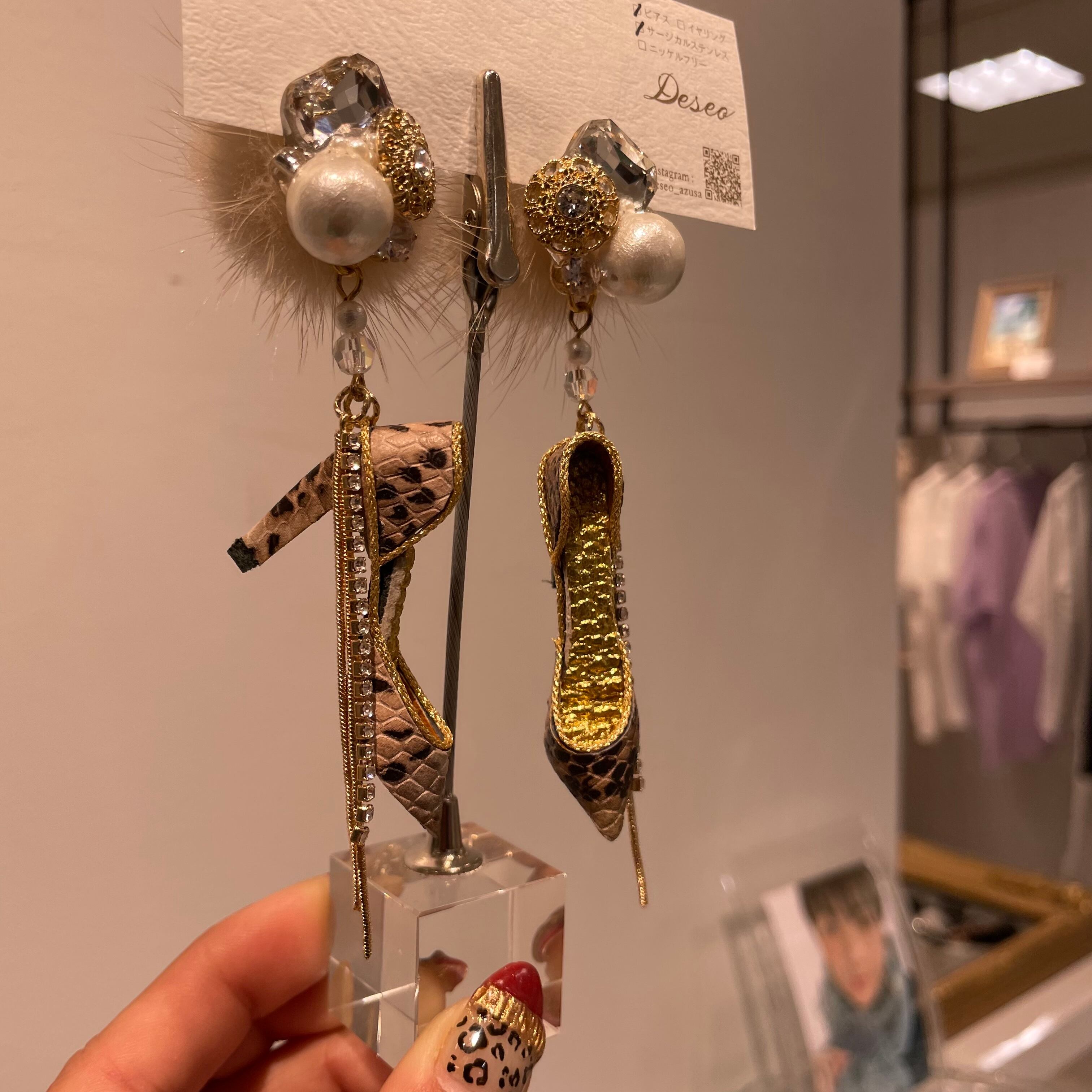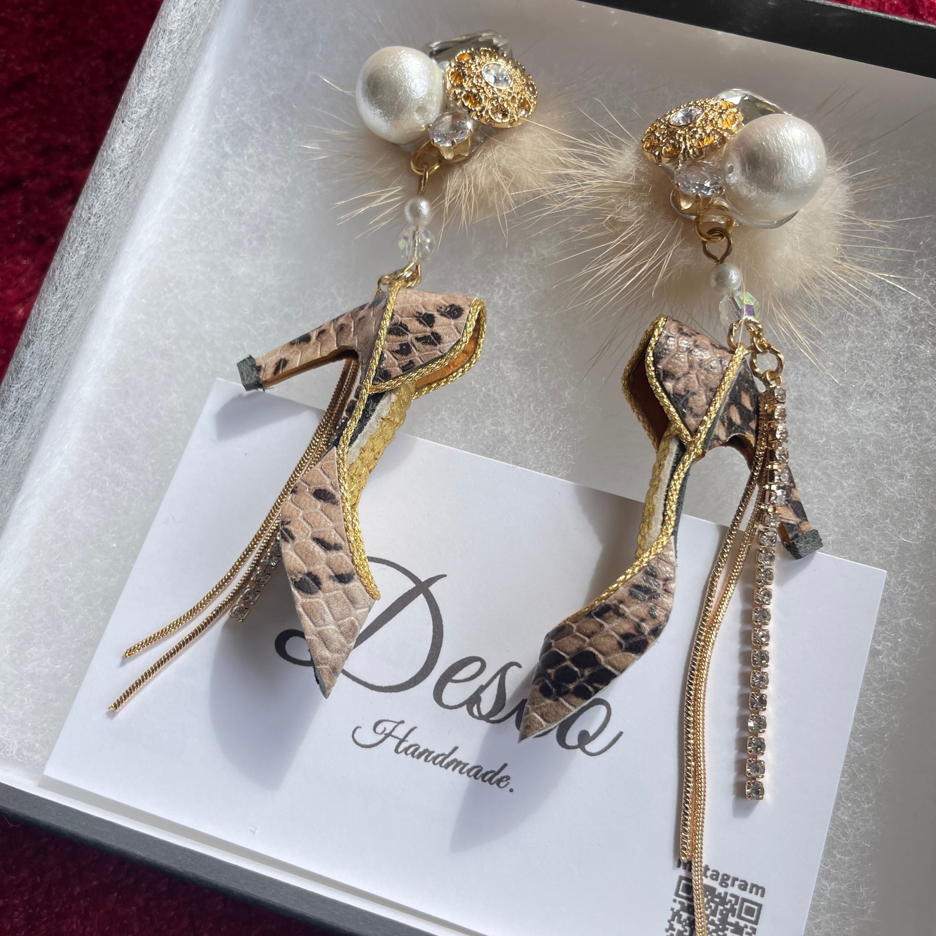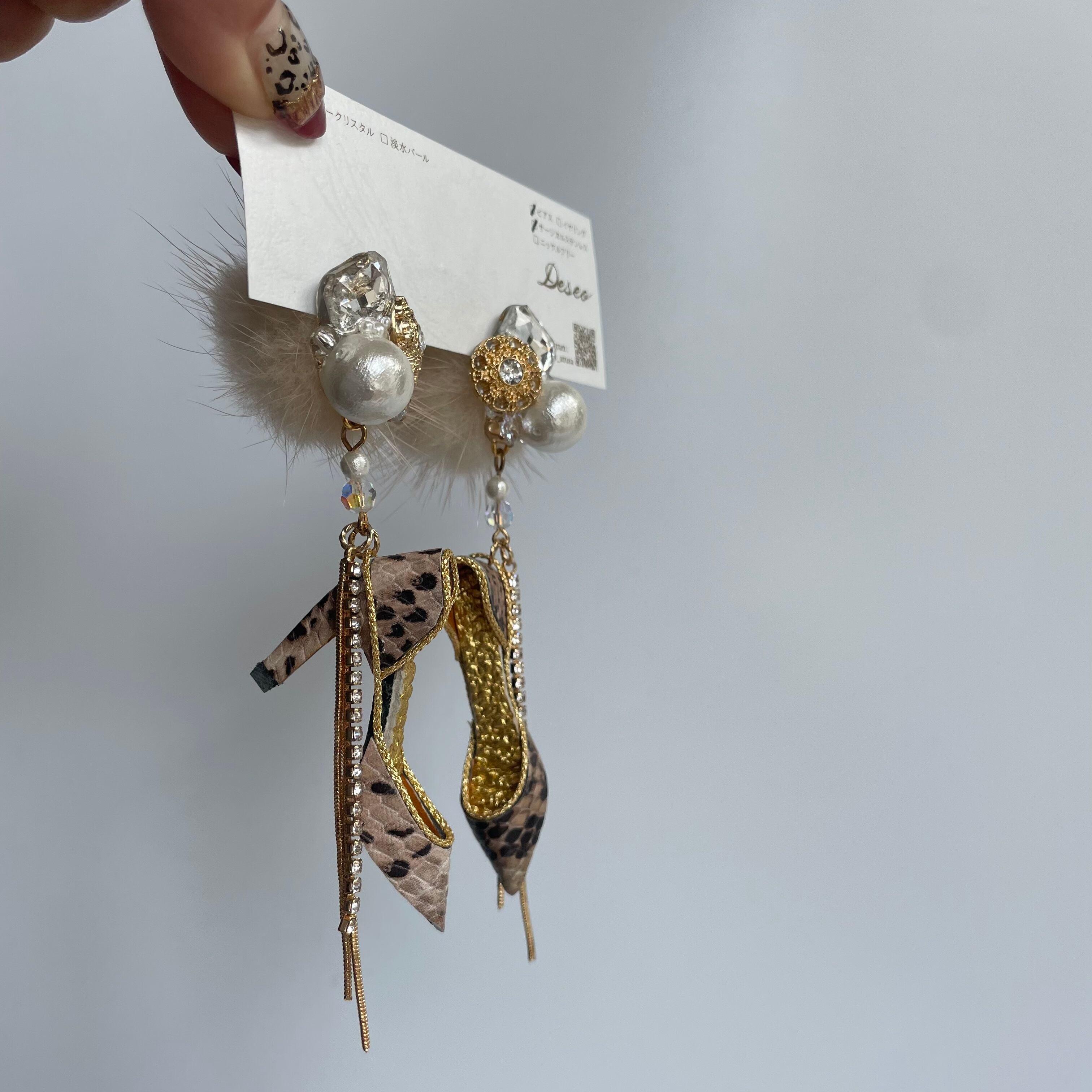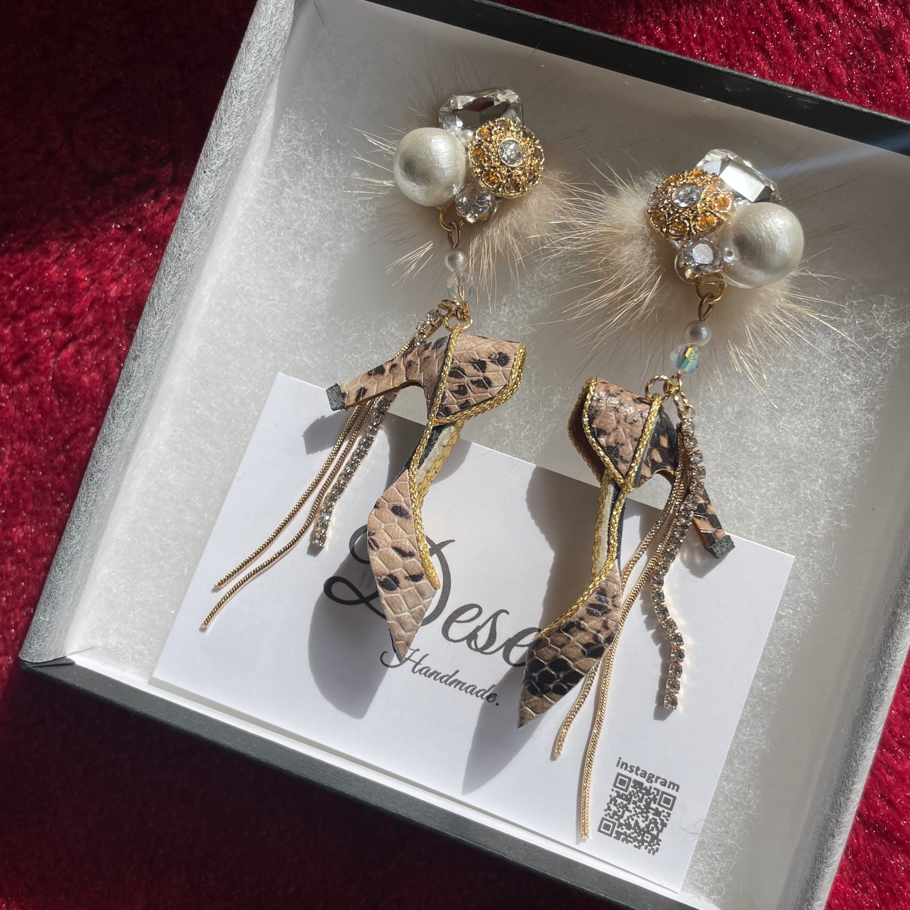 パイソン本革ハイヒール❤️ミンクファーキャッチ ビジューピアス ビジューイヤリング ハイヒールピアス ハイヒールイヤリング NO.229