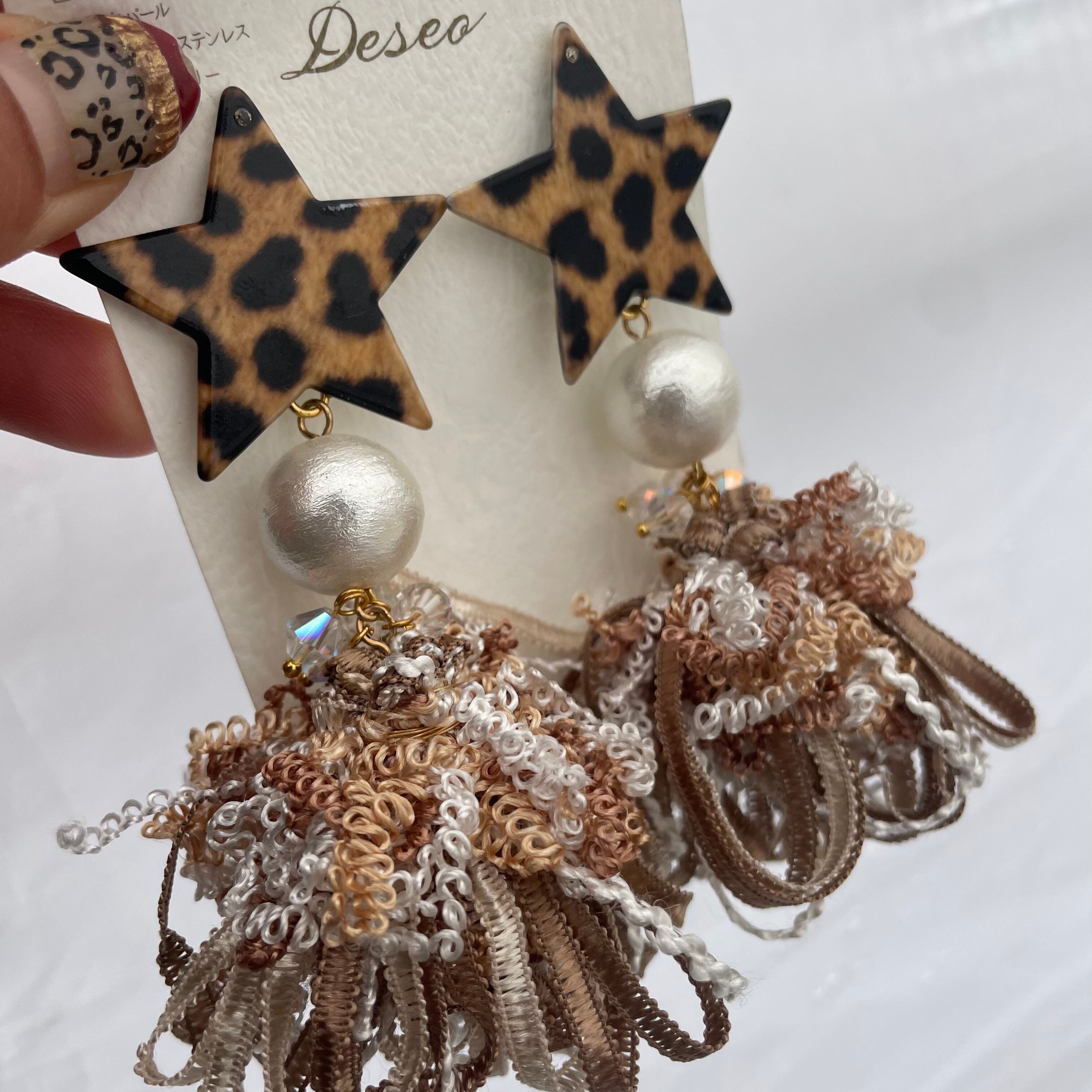 レオパ星×ベージュMOJA★星ピアス 星イヤリング タッセルピアス タッセルイヤリング NO.241
