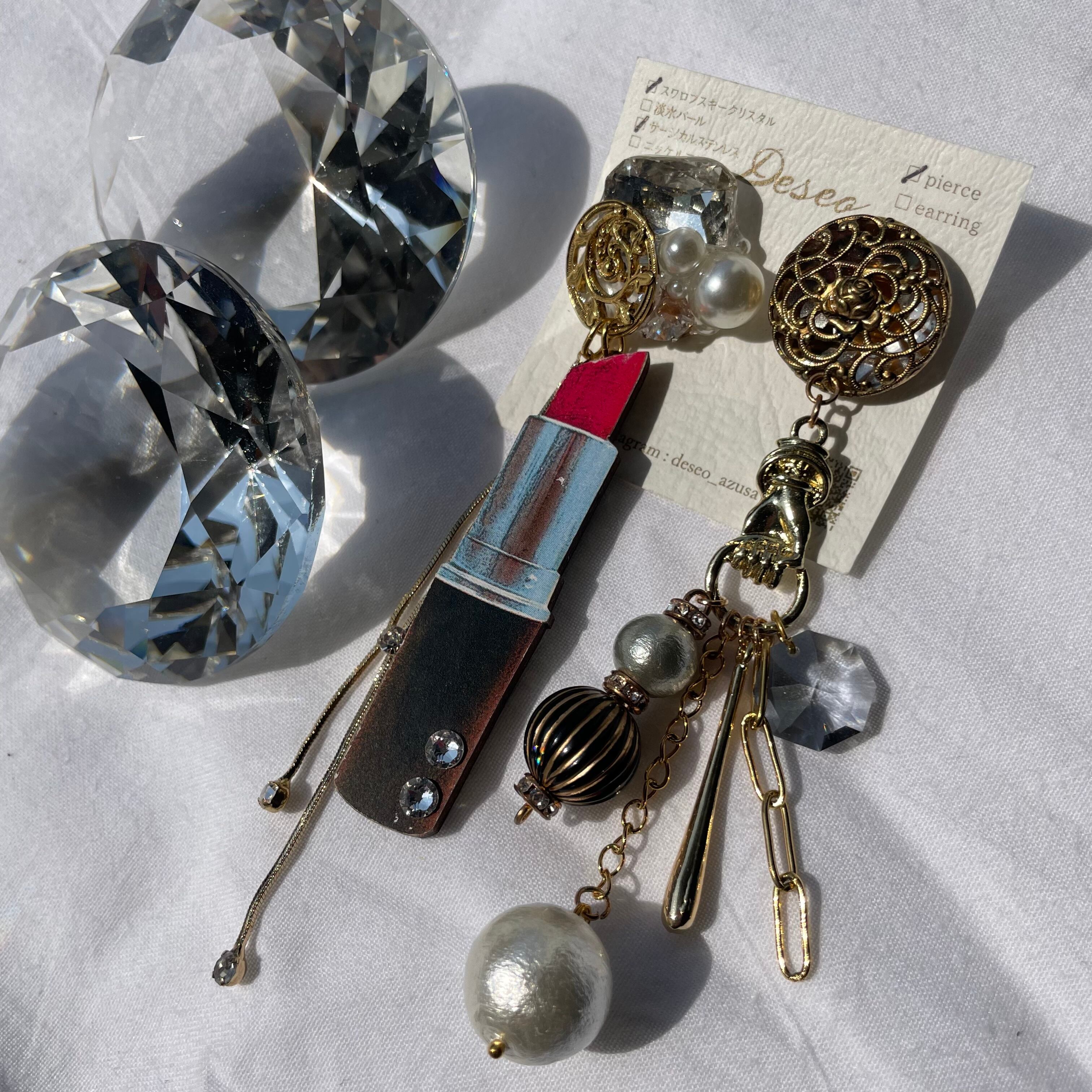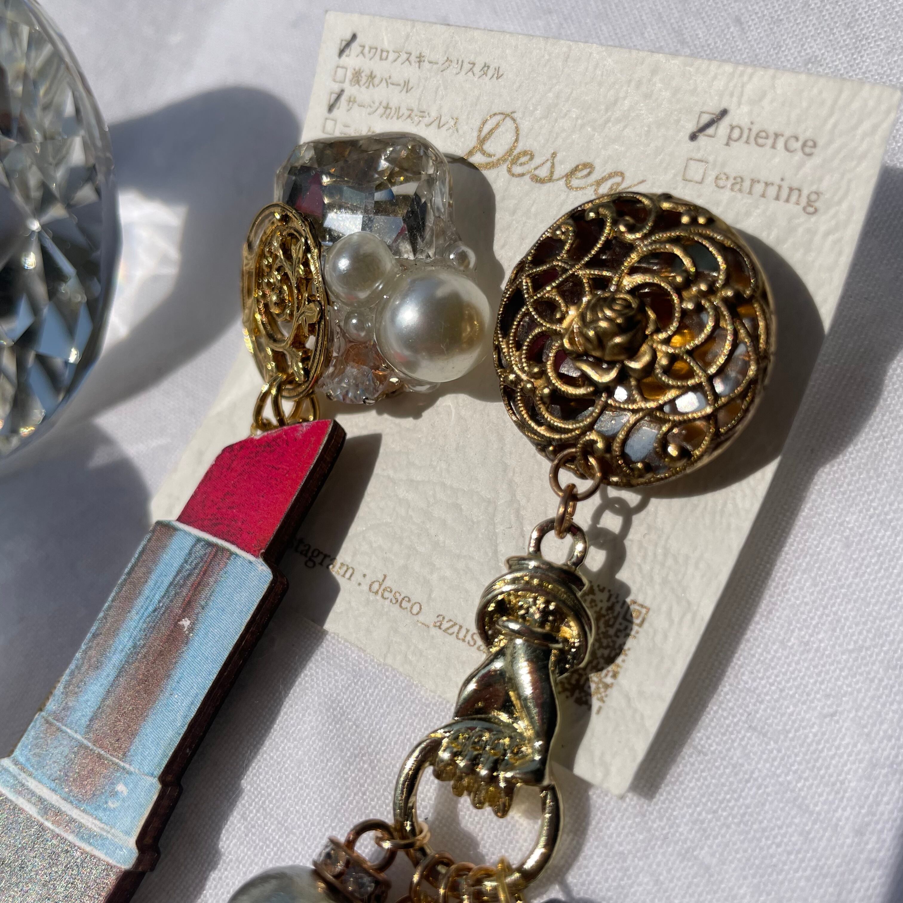 口紅 × チェコヴィンテージボタン❤️スワロフスキー 口紅ピアス ヴィンテージボタンピアス NO.248
