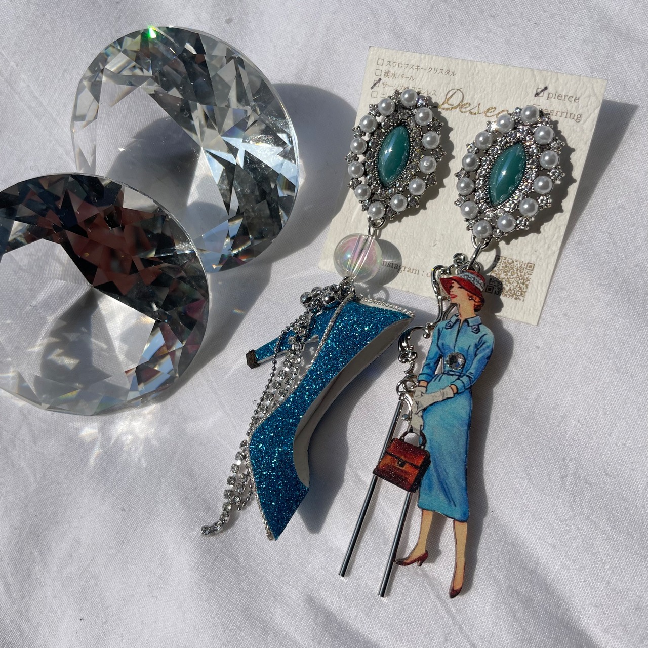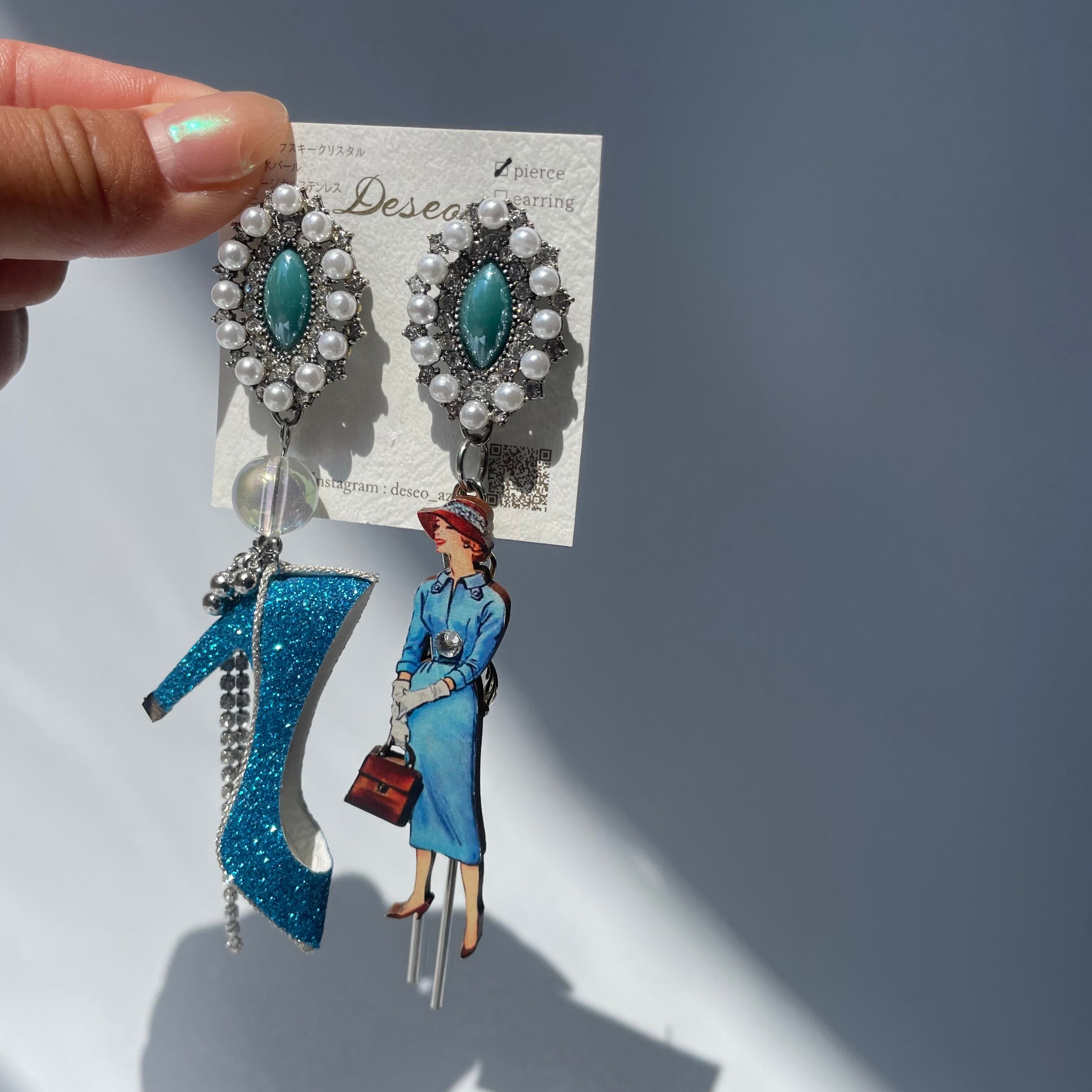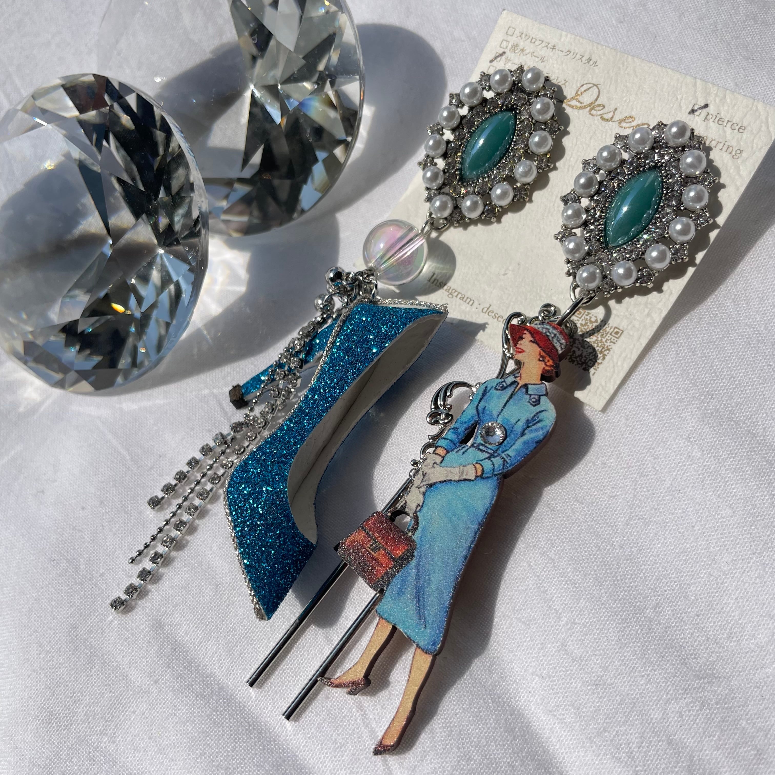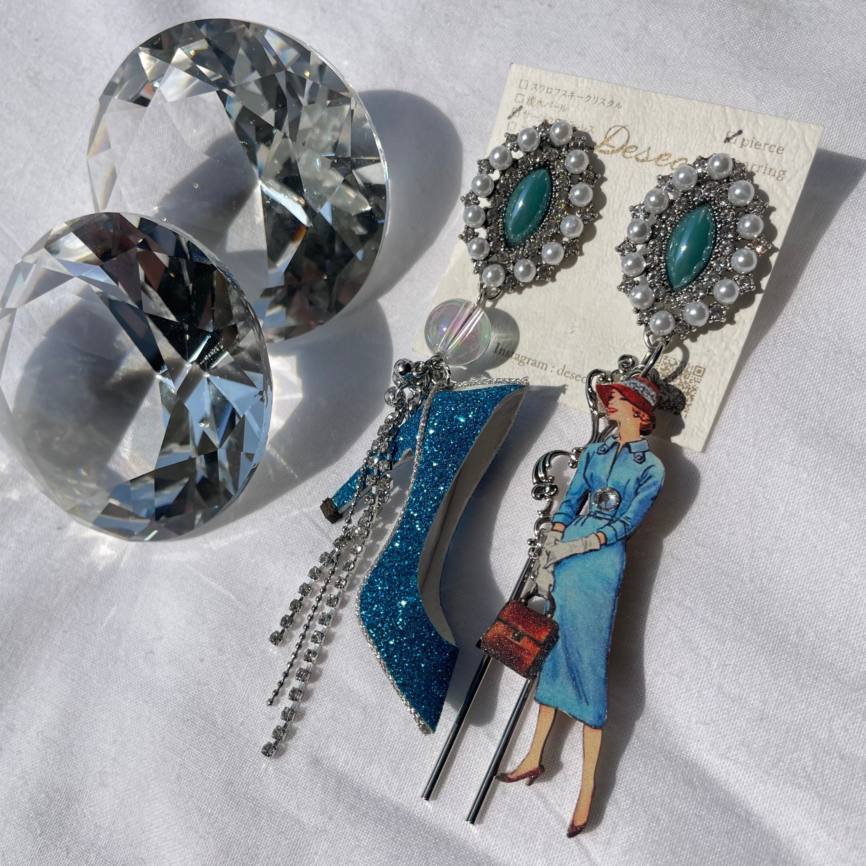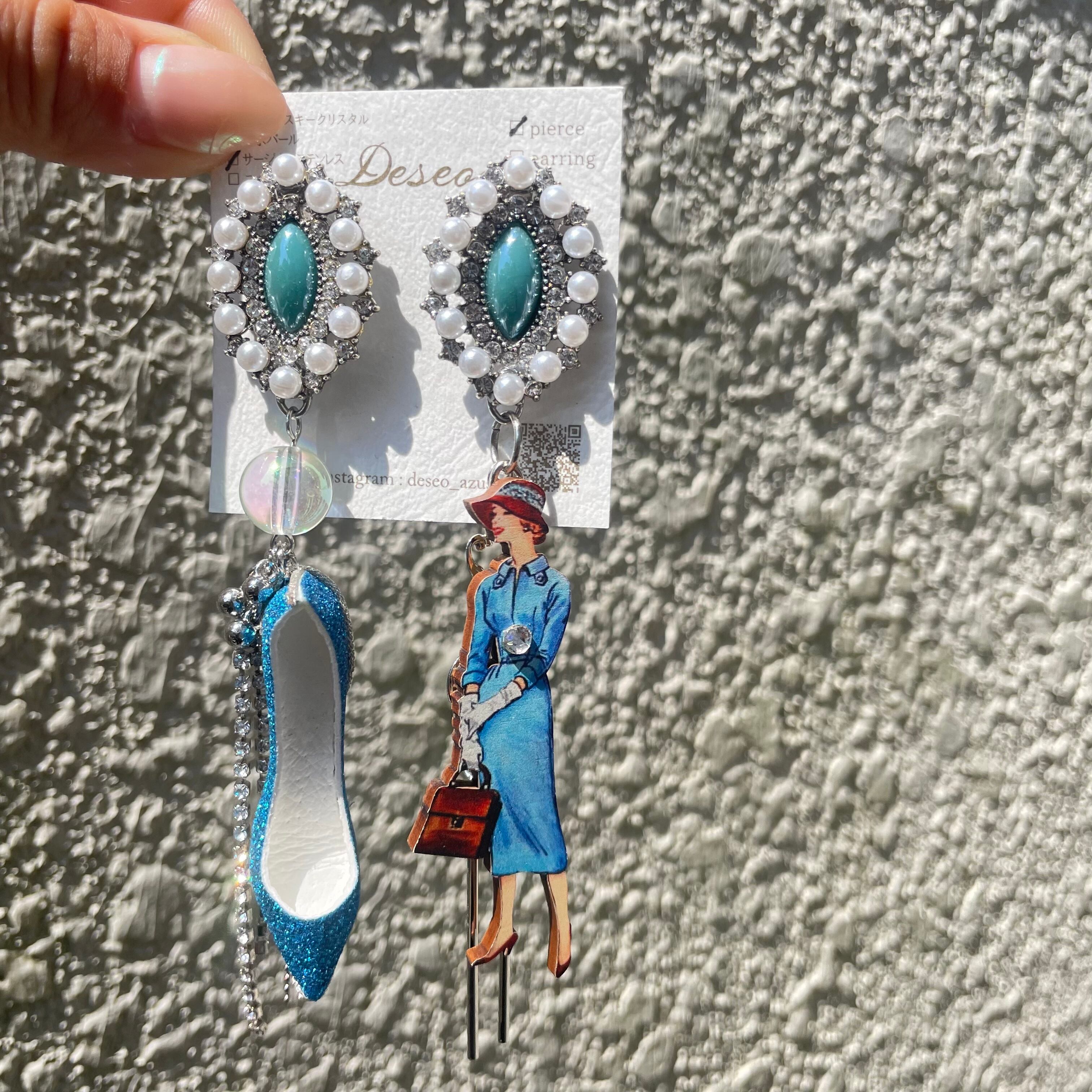 Sophia❤️ブルーラメハイヒール × ブルーワンピースの女性✨ハイヒーピアス ハイヒールイヤリング NO.249