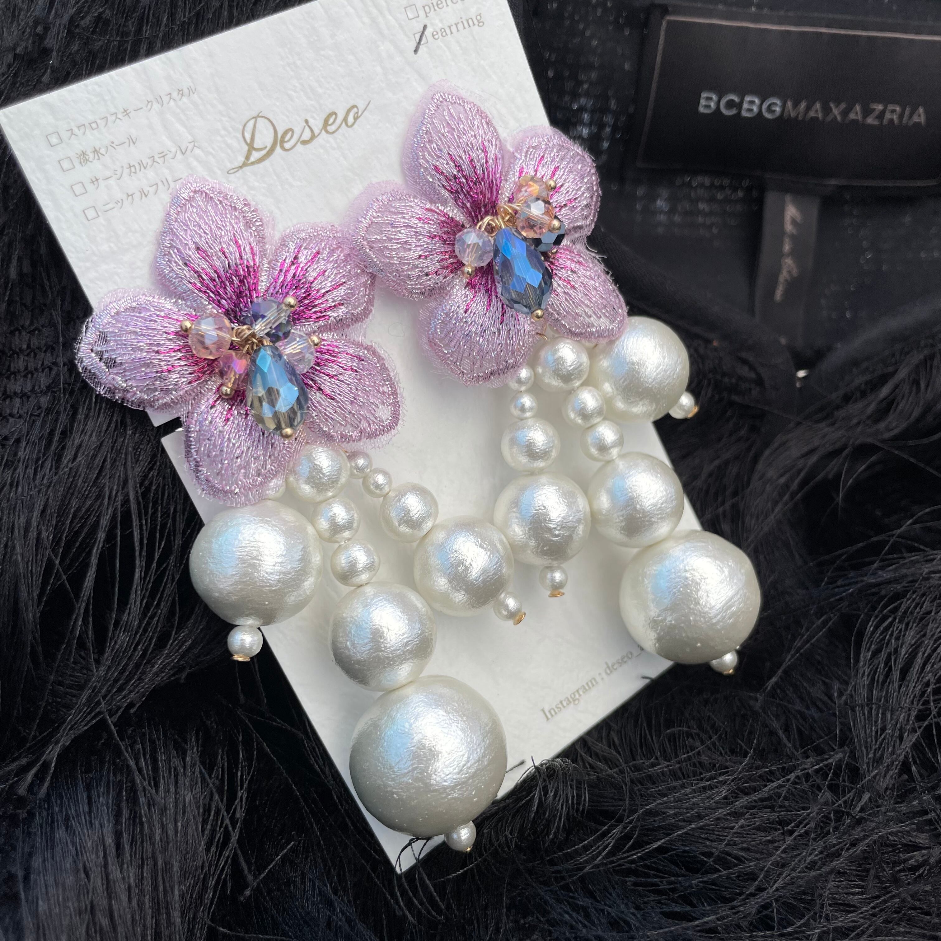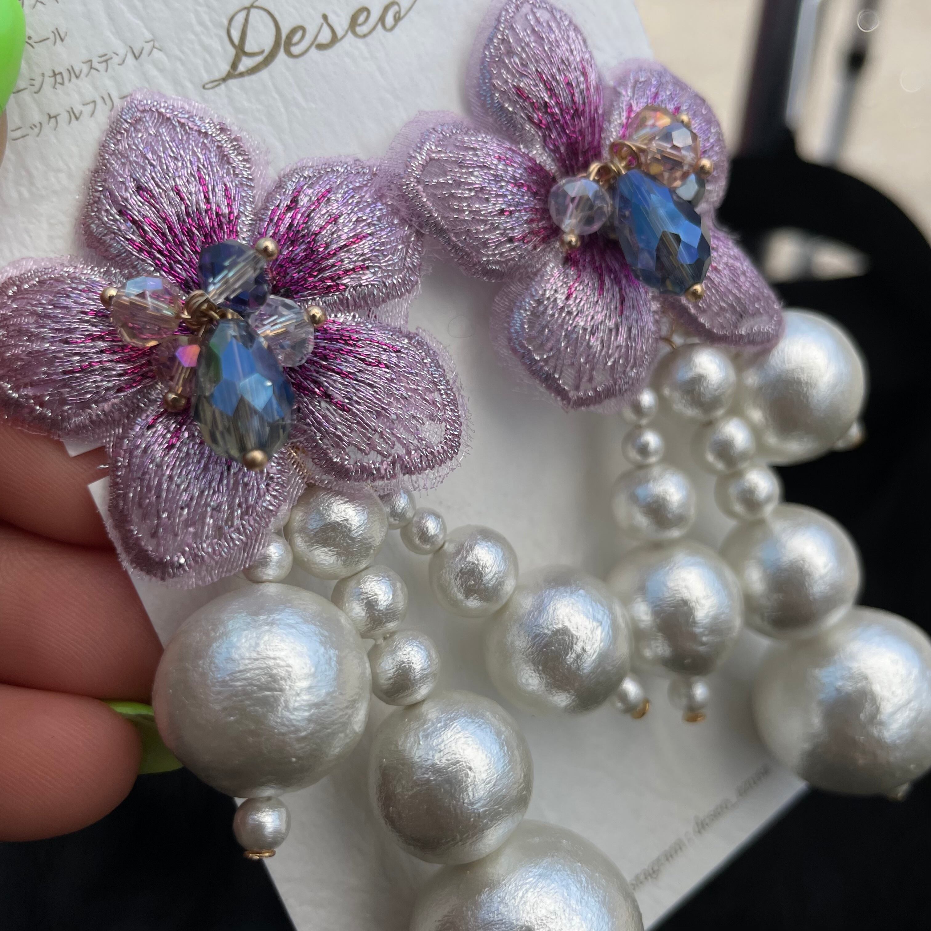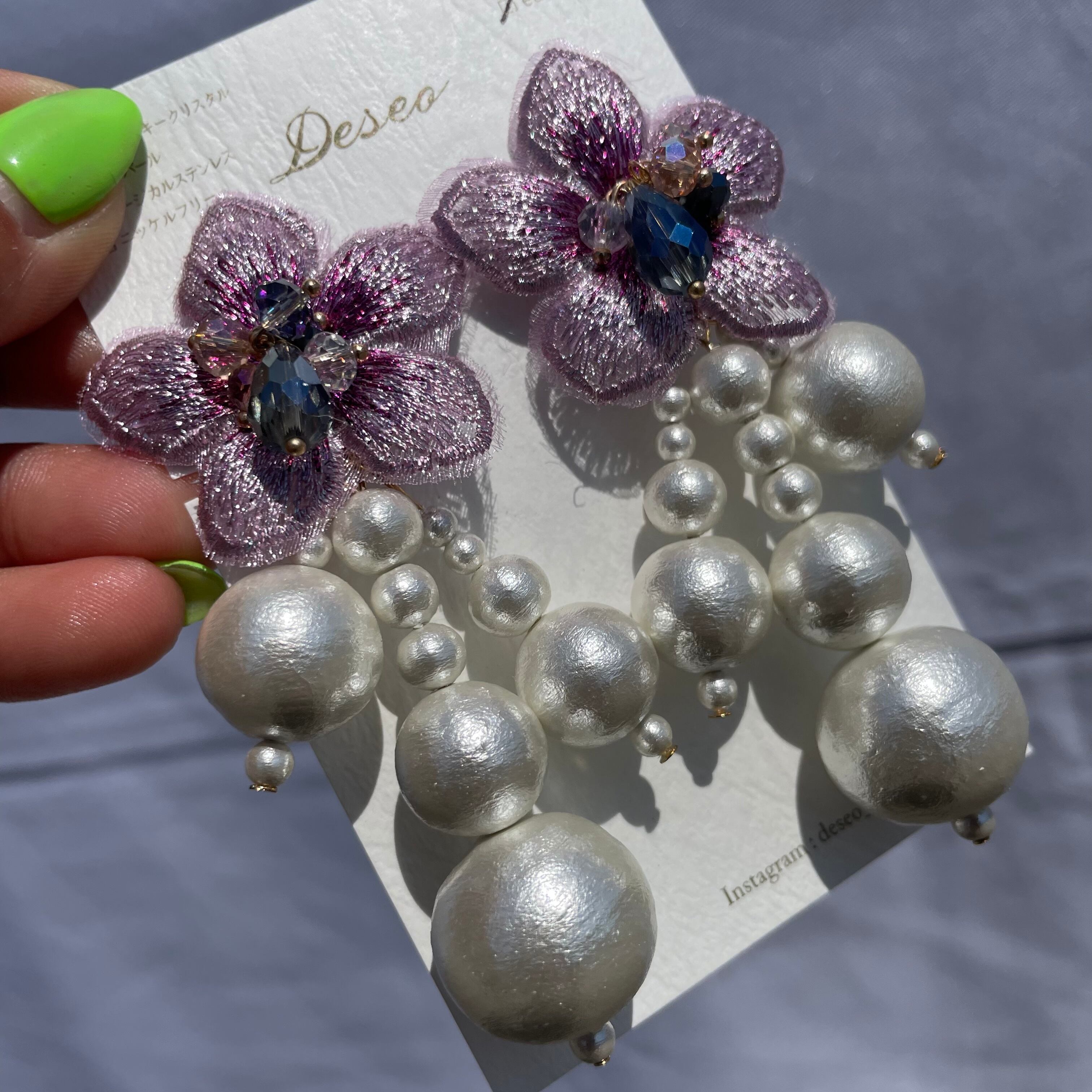 即完売商品 お色違いパープル❤️Flower × コットンパール♡お花ピアス.コットンパールピアス NO.256