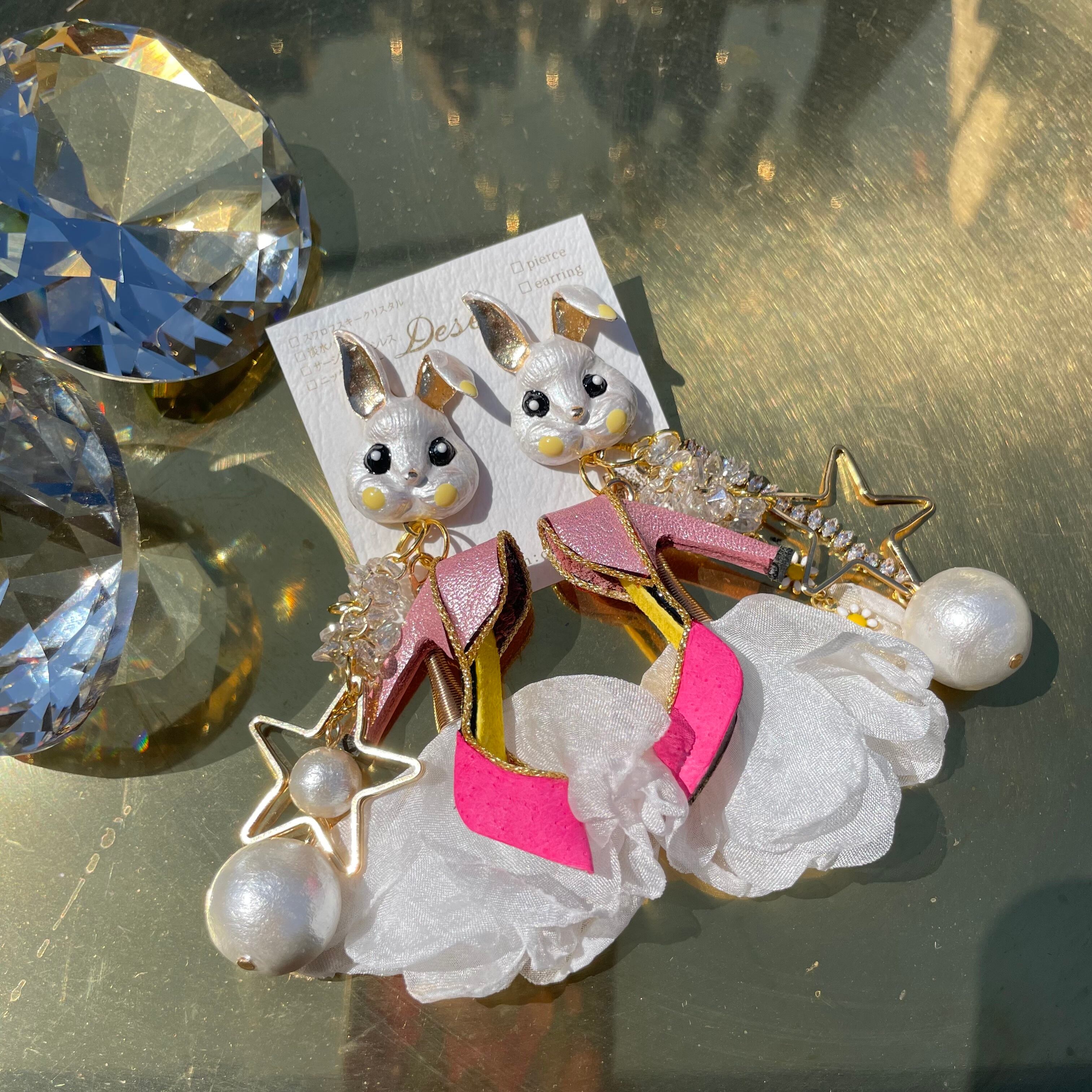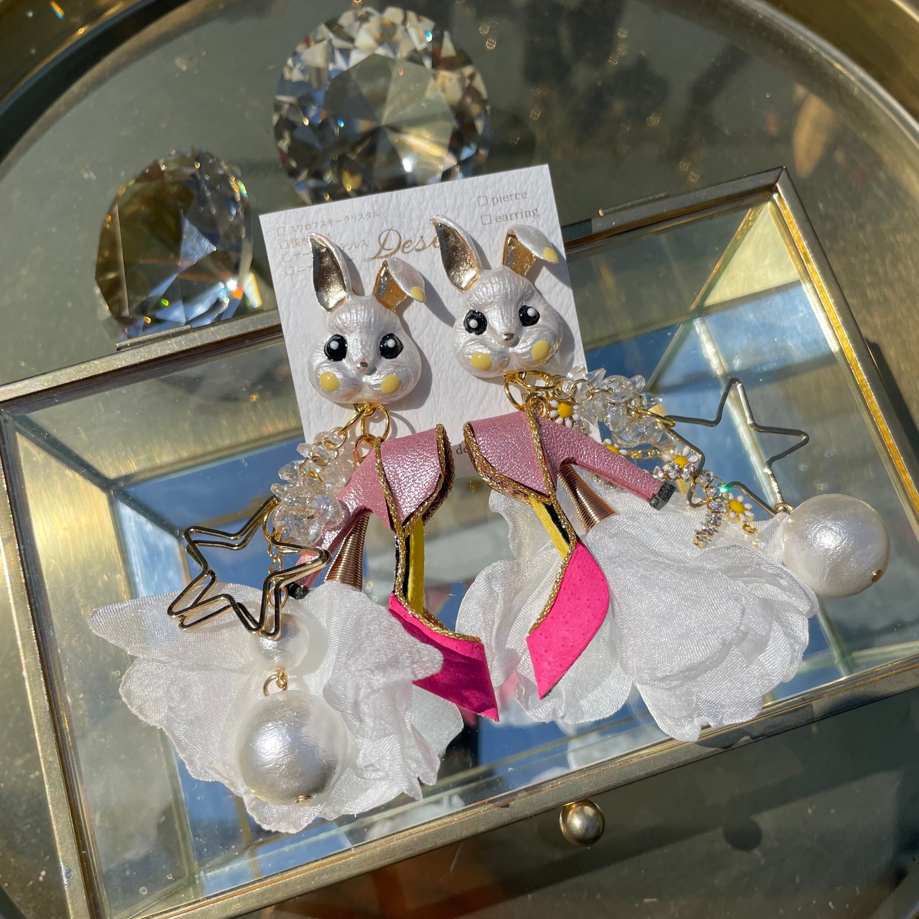 Bunny❤️ピンクハイヒール❤️ウサギ×白シフォンタッセル ハイヒールピアス ハイヒールイヤリング うさぎピアス うさぎイヤリング NO.292