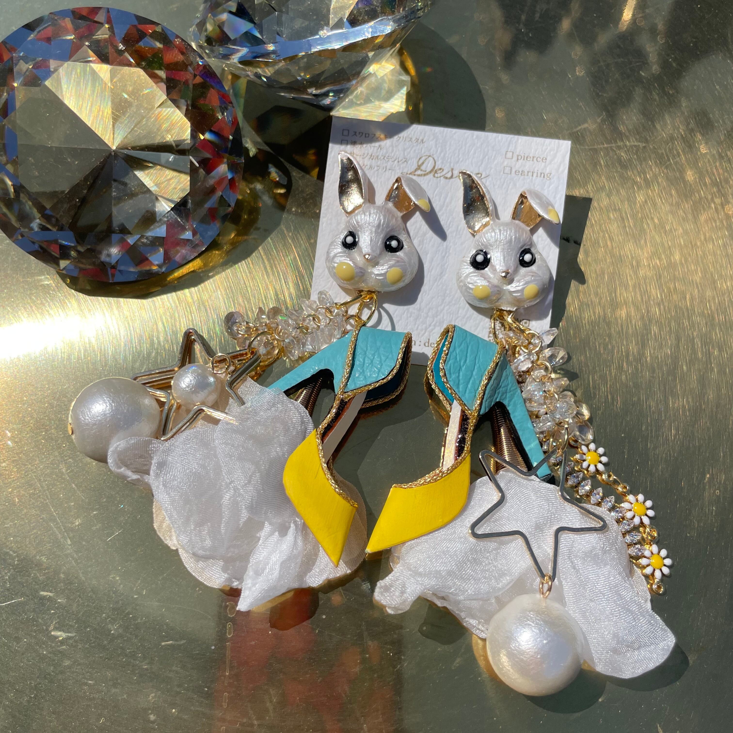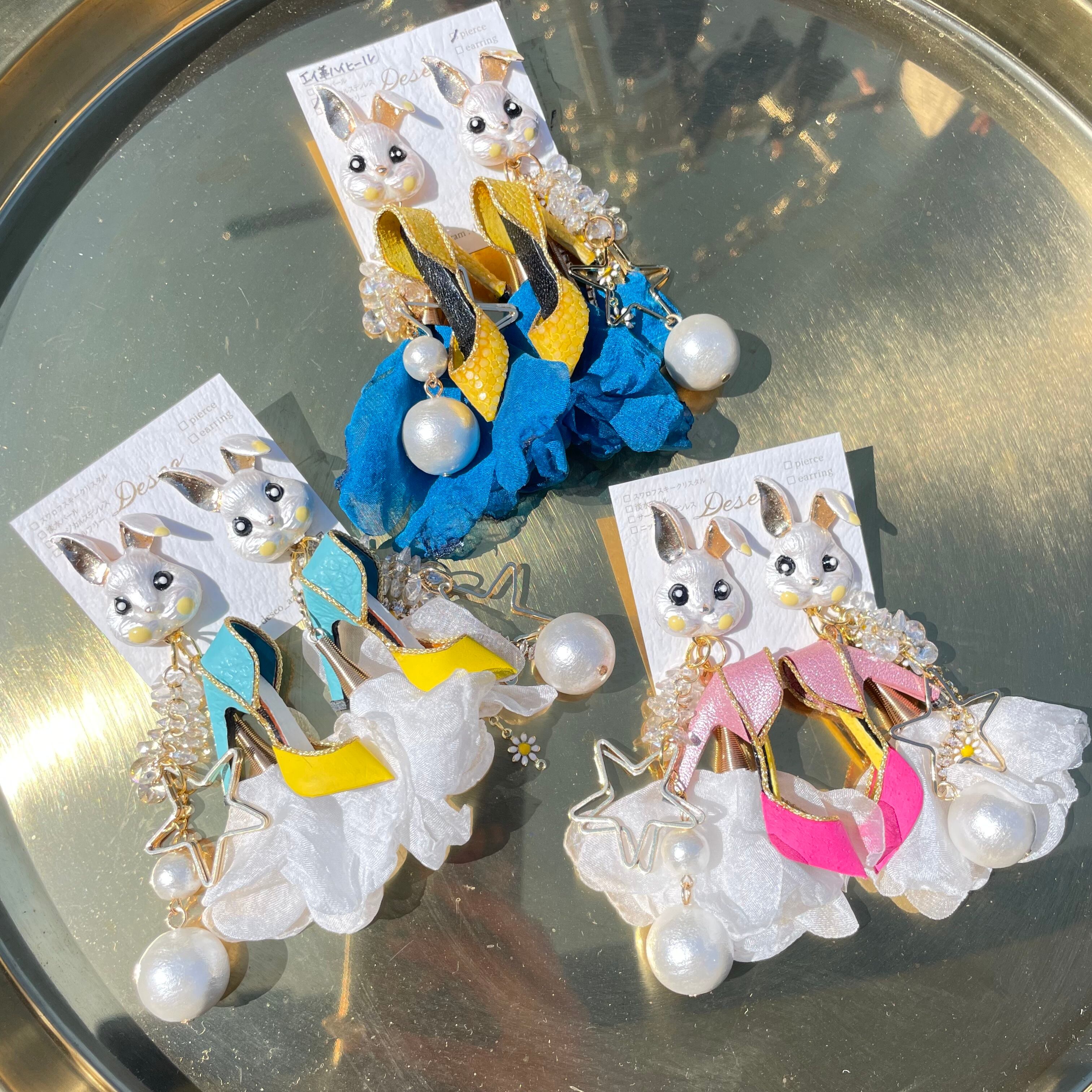 Bunny❤️イエロー×水色ハイヒール❤️ウサギ×白シフォンタッセル ハイヒールピアス ハイヒールイヤリング うさぎピアス うさぎイヤリング NO.293