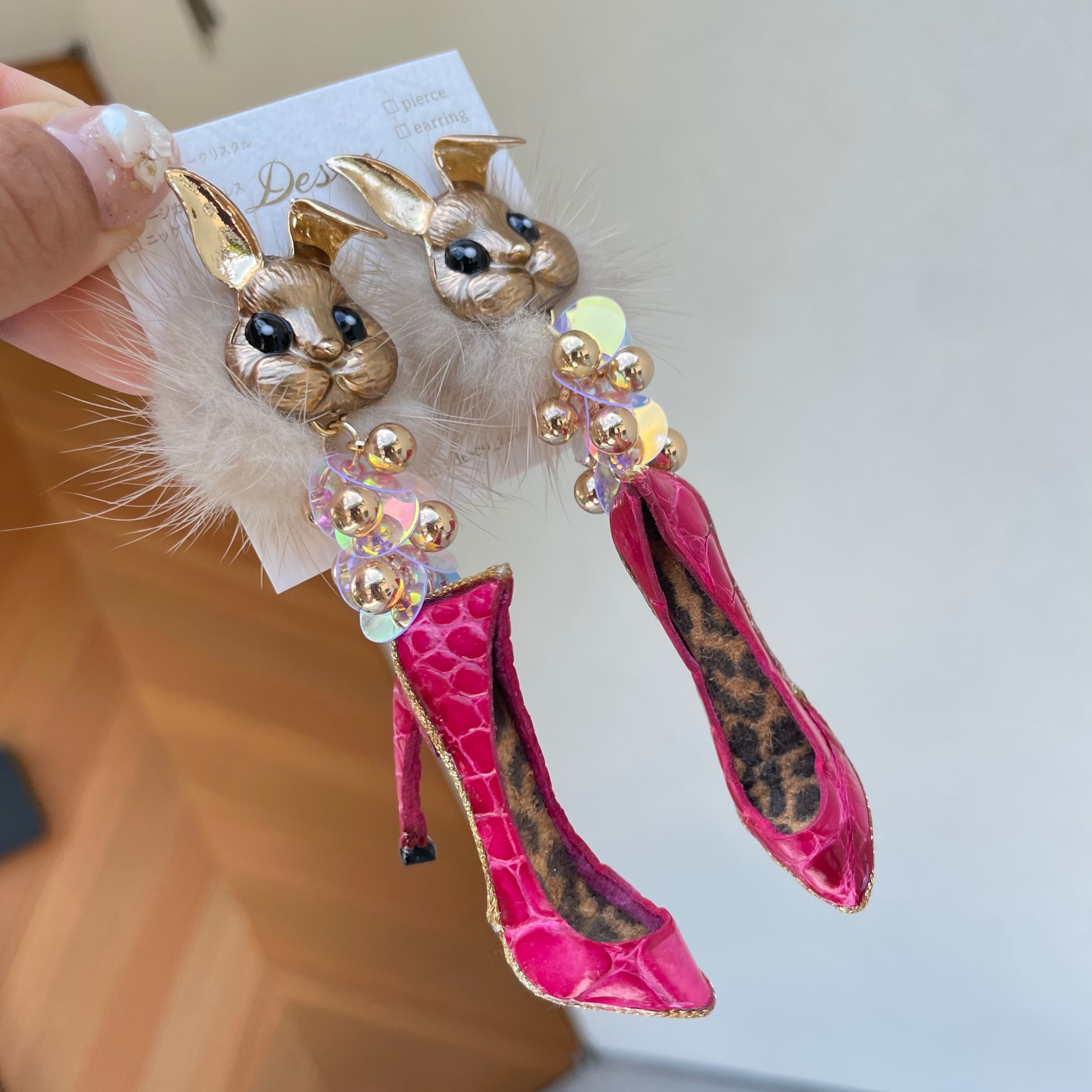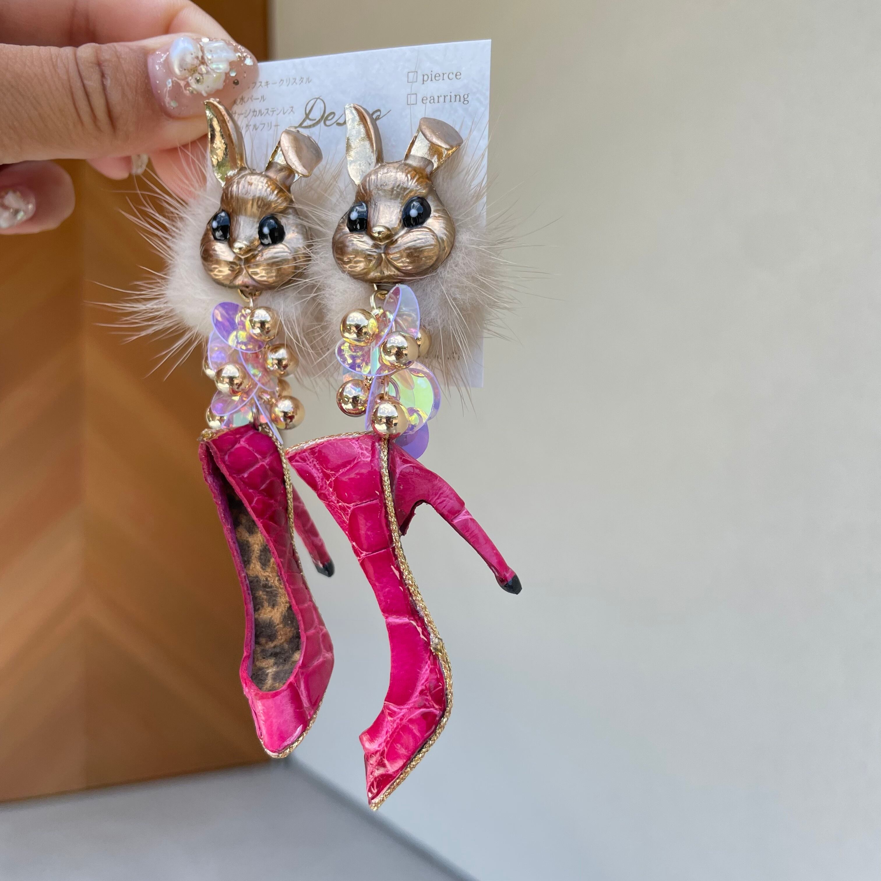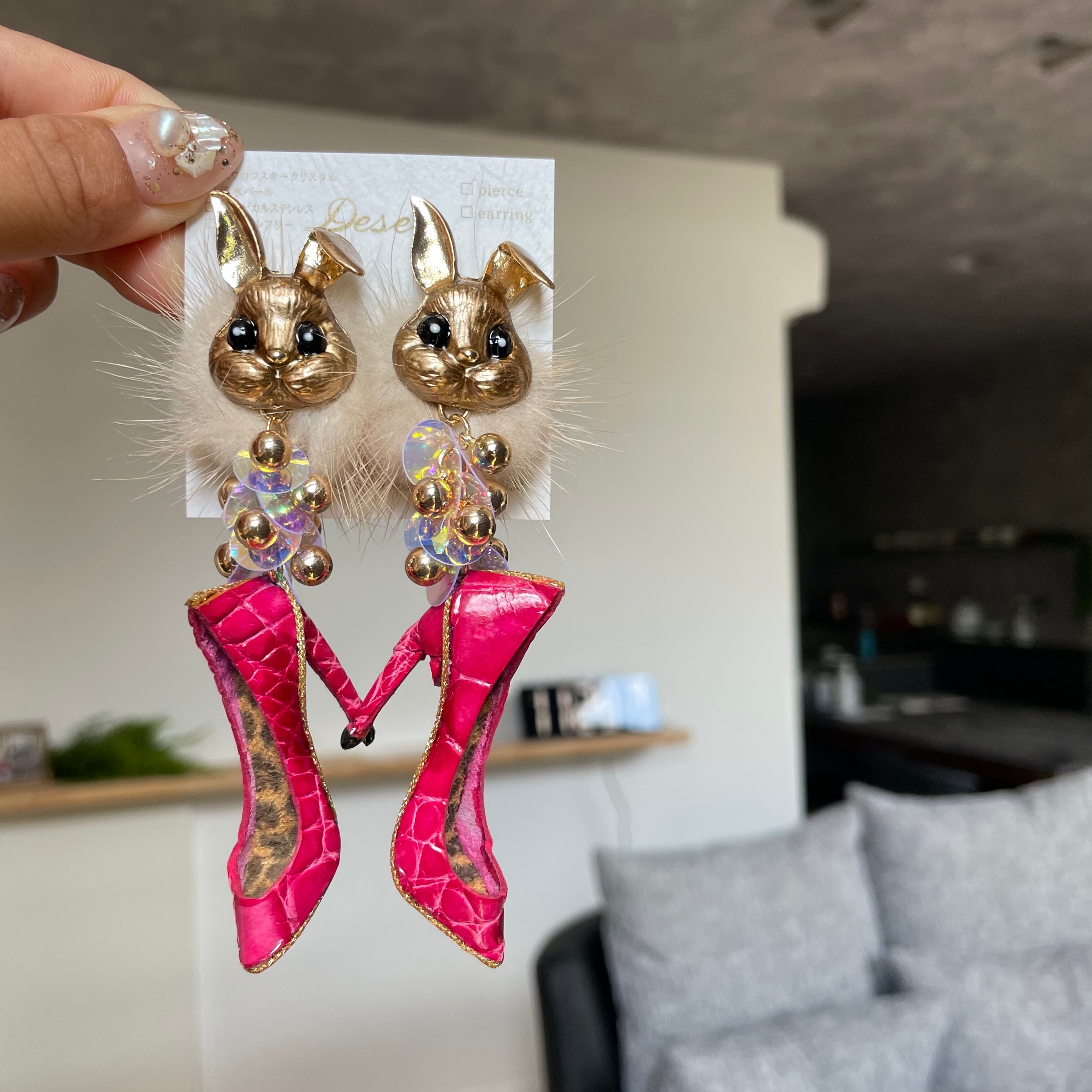 Gold Bunny❤️ワニ革クロコピンクハイヒール★ウサギ×ミンクファー✨ウサギピアス ウサギイヤリング NO.316