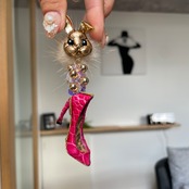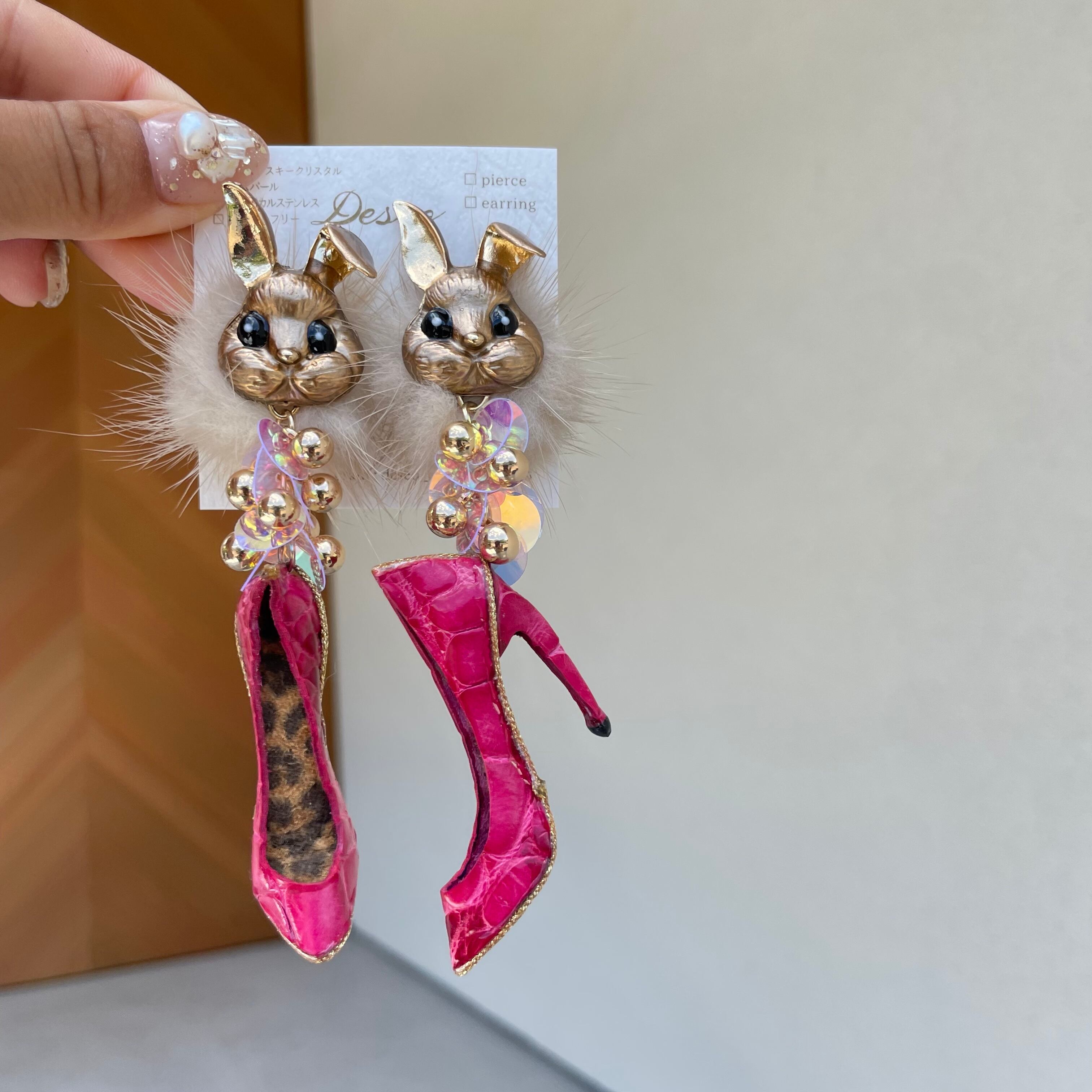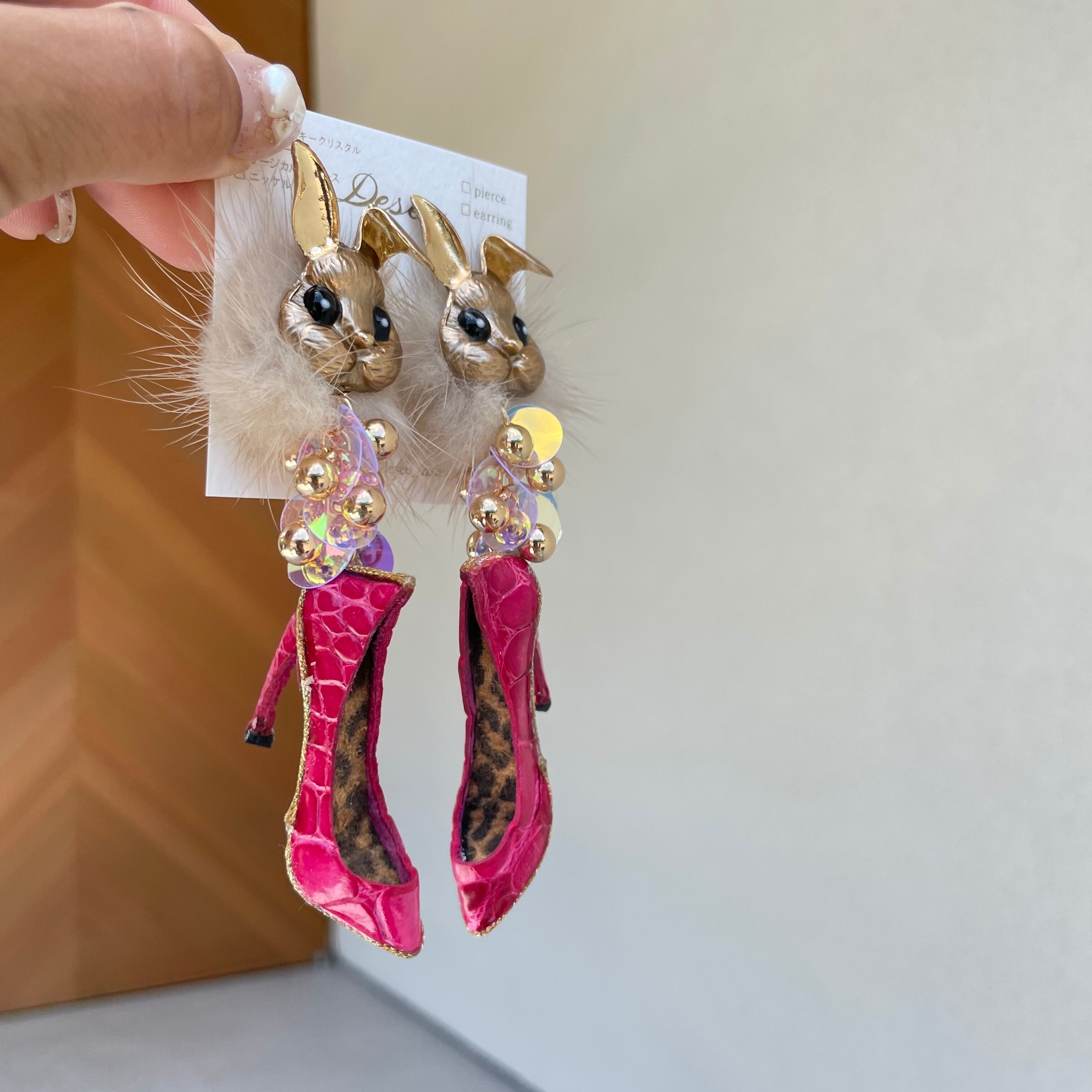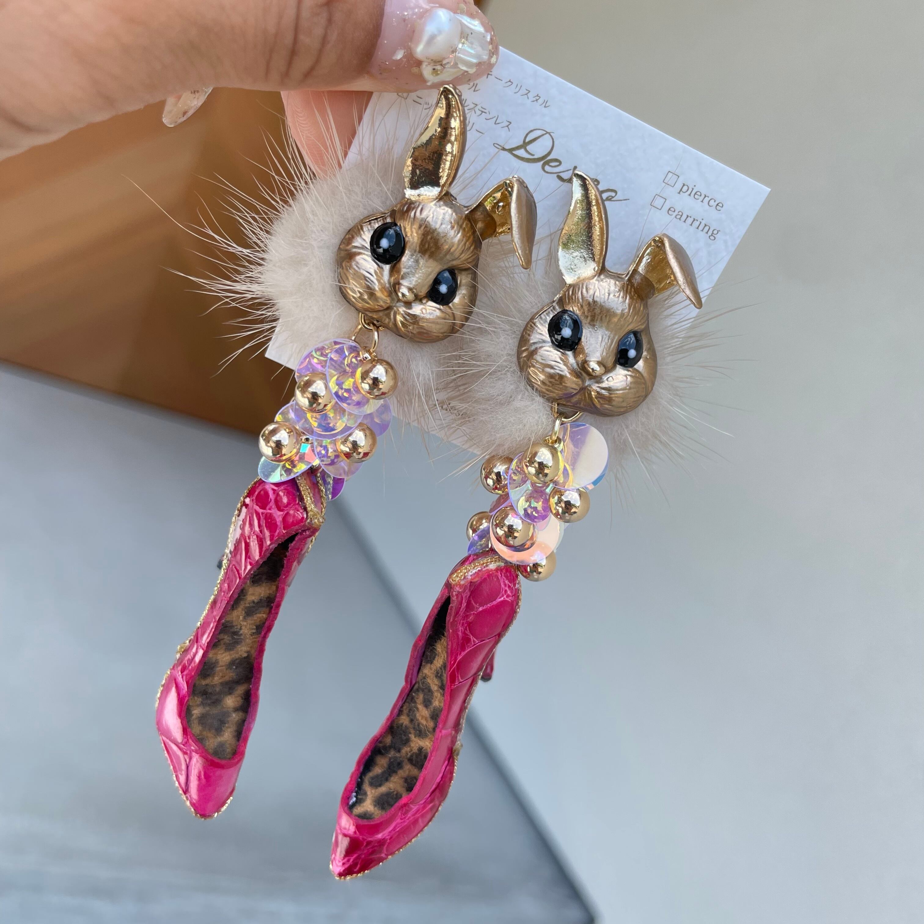 Gold Bunny❤️ワニ革クロコピンクハイヒール★ウサギ×ミンクファー✨ウサギピアス ウサギイヤリング NO.316