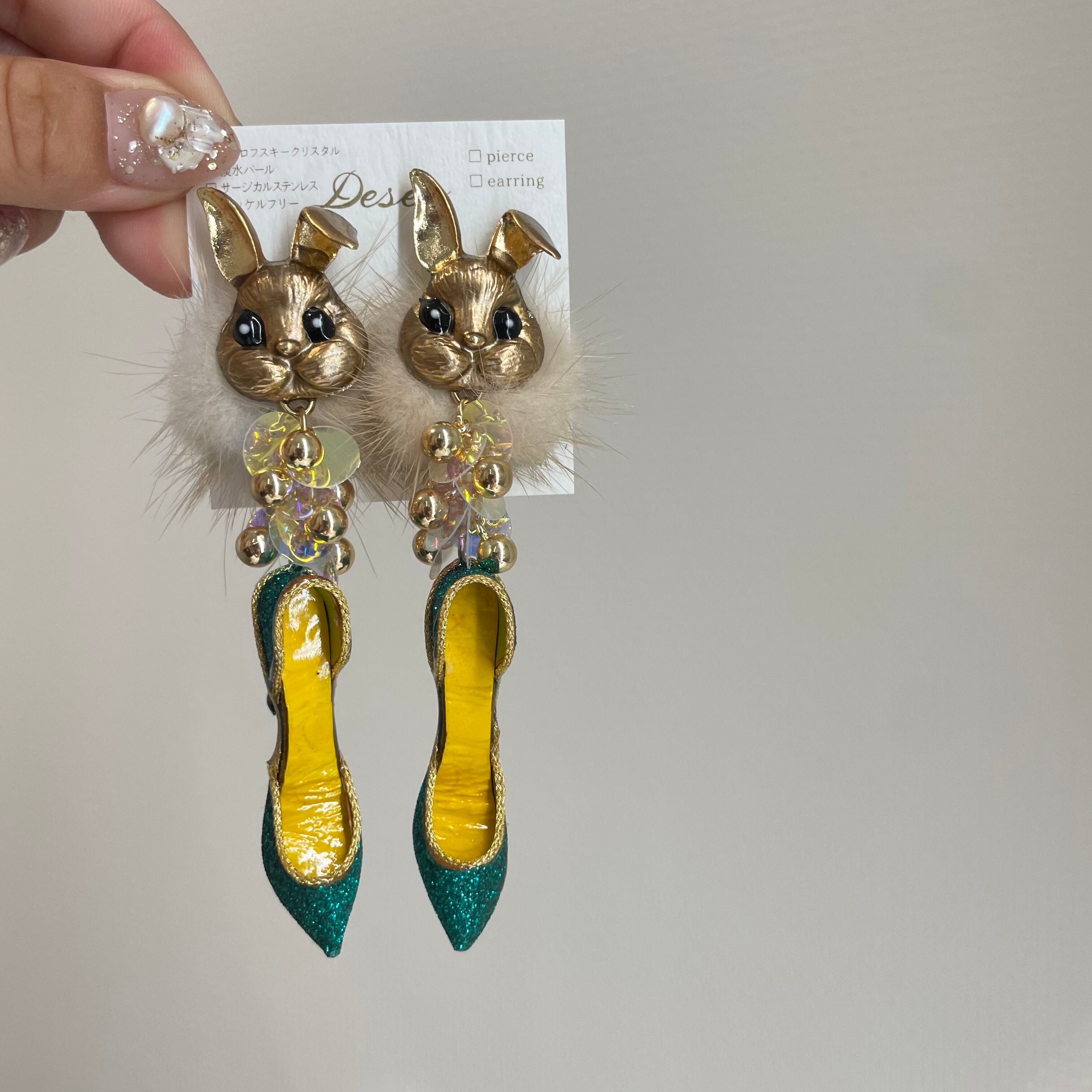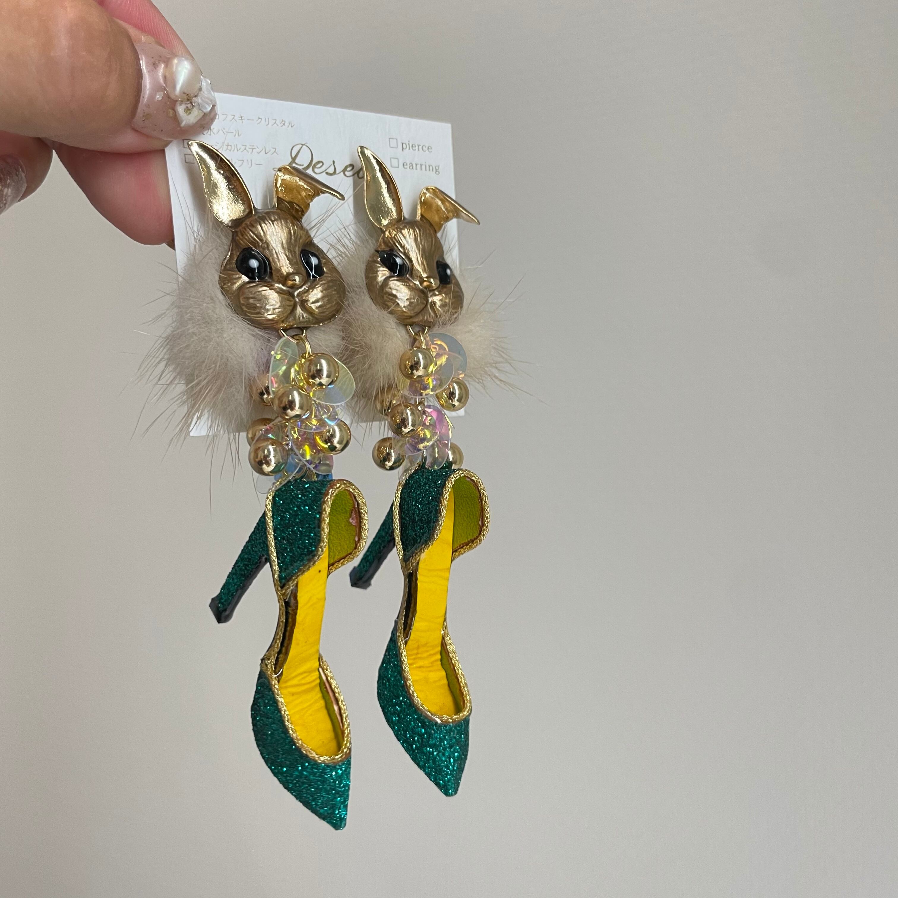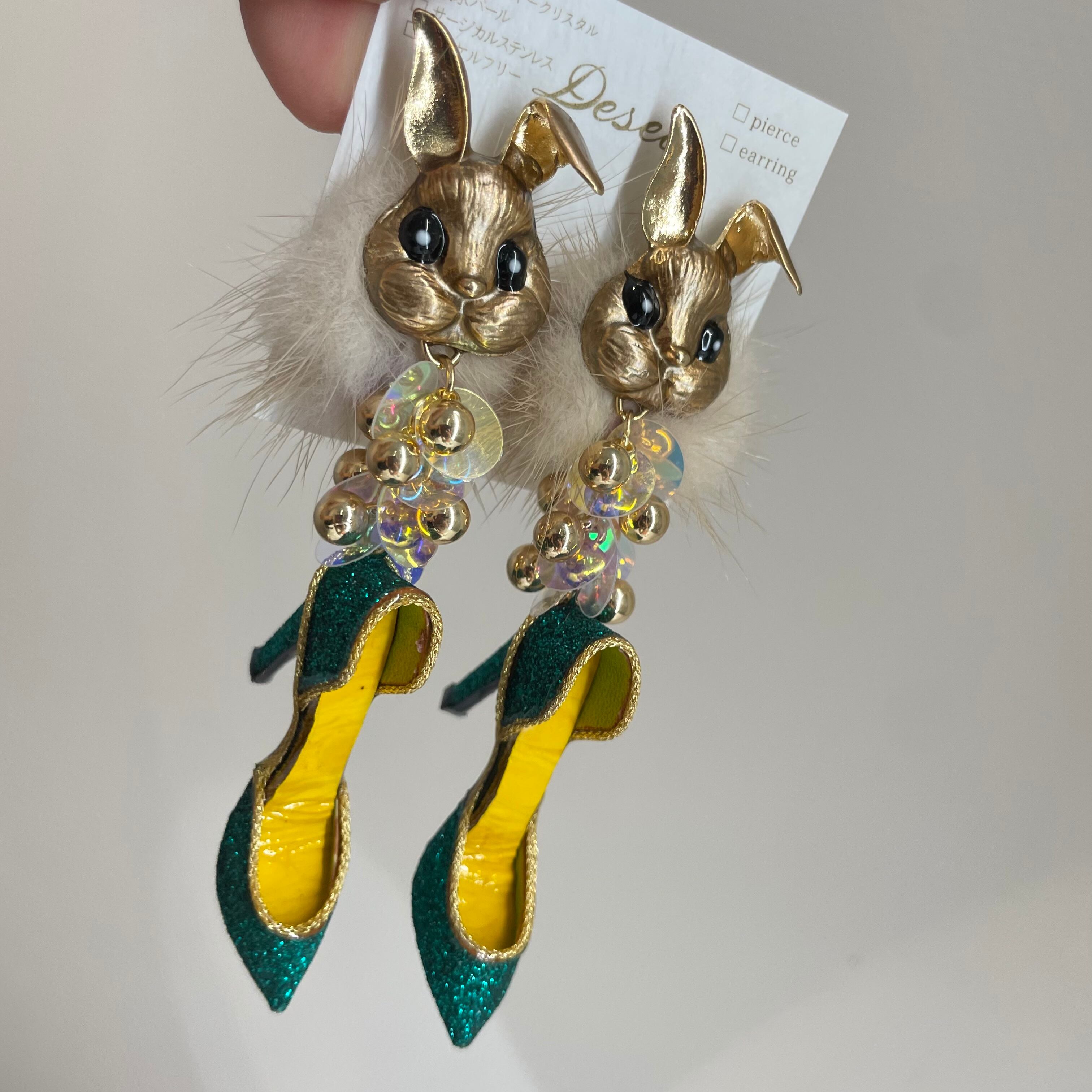 Gold Bunny❤️ラメグリーンハイヒール★ウサギ×ミンクファー✨ウサギピアス ウサギイヤリング NO.319