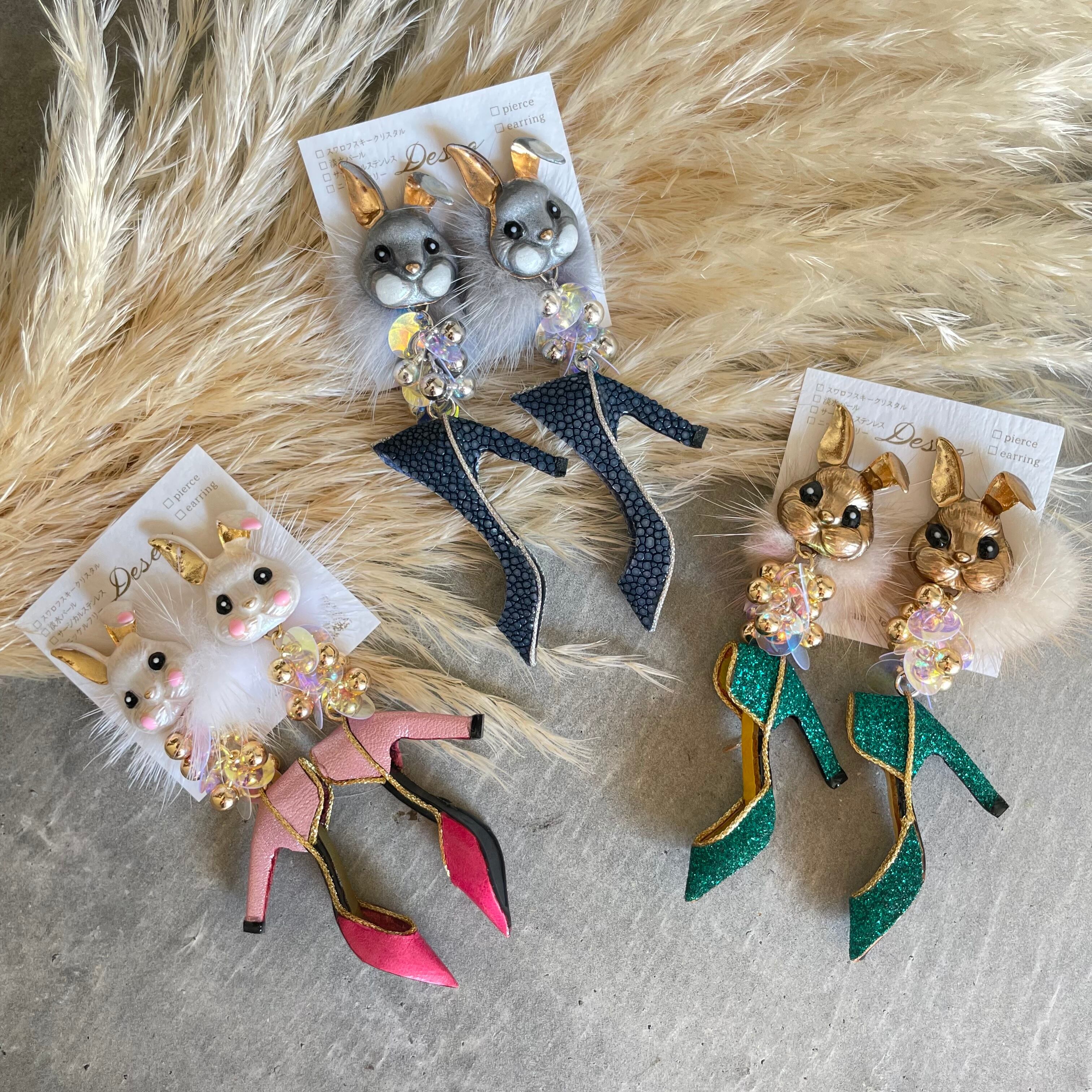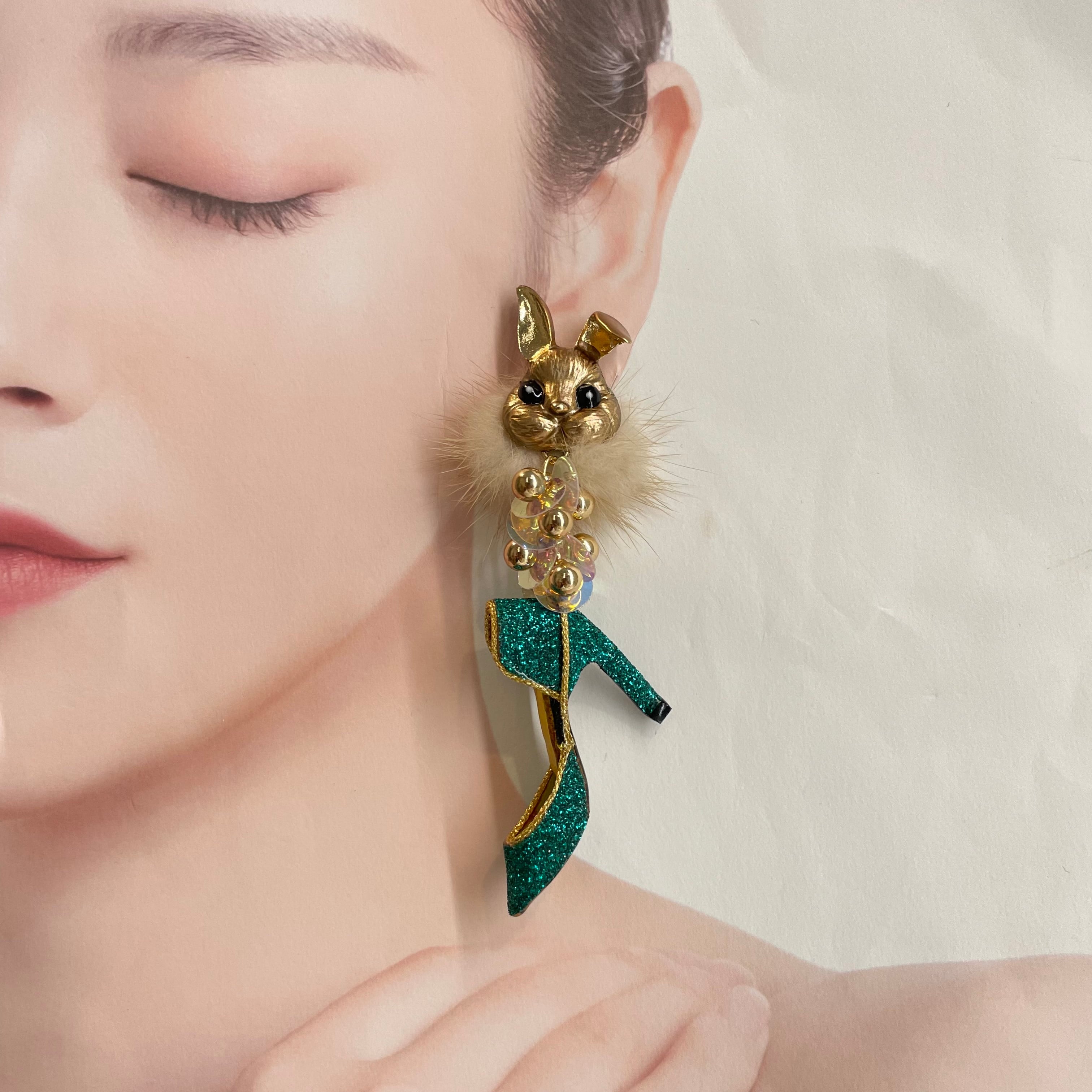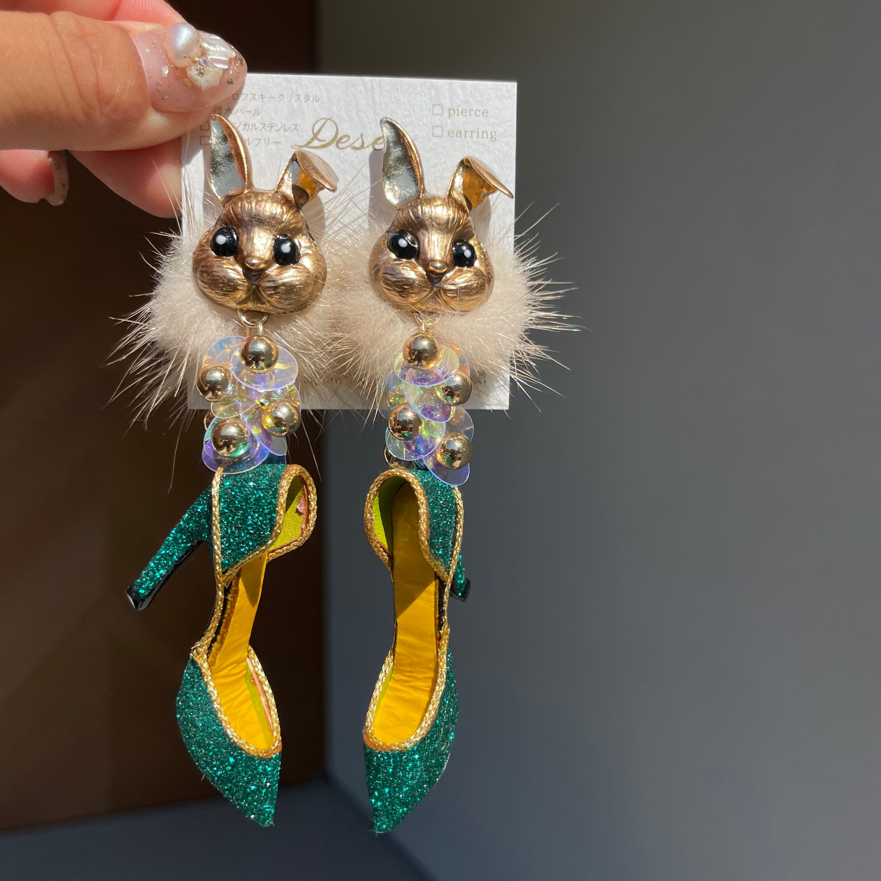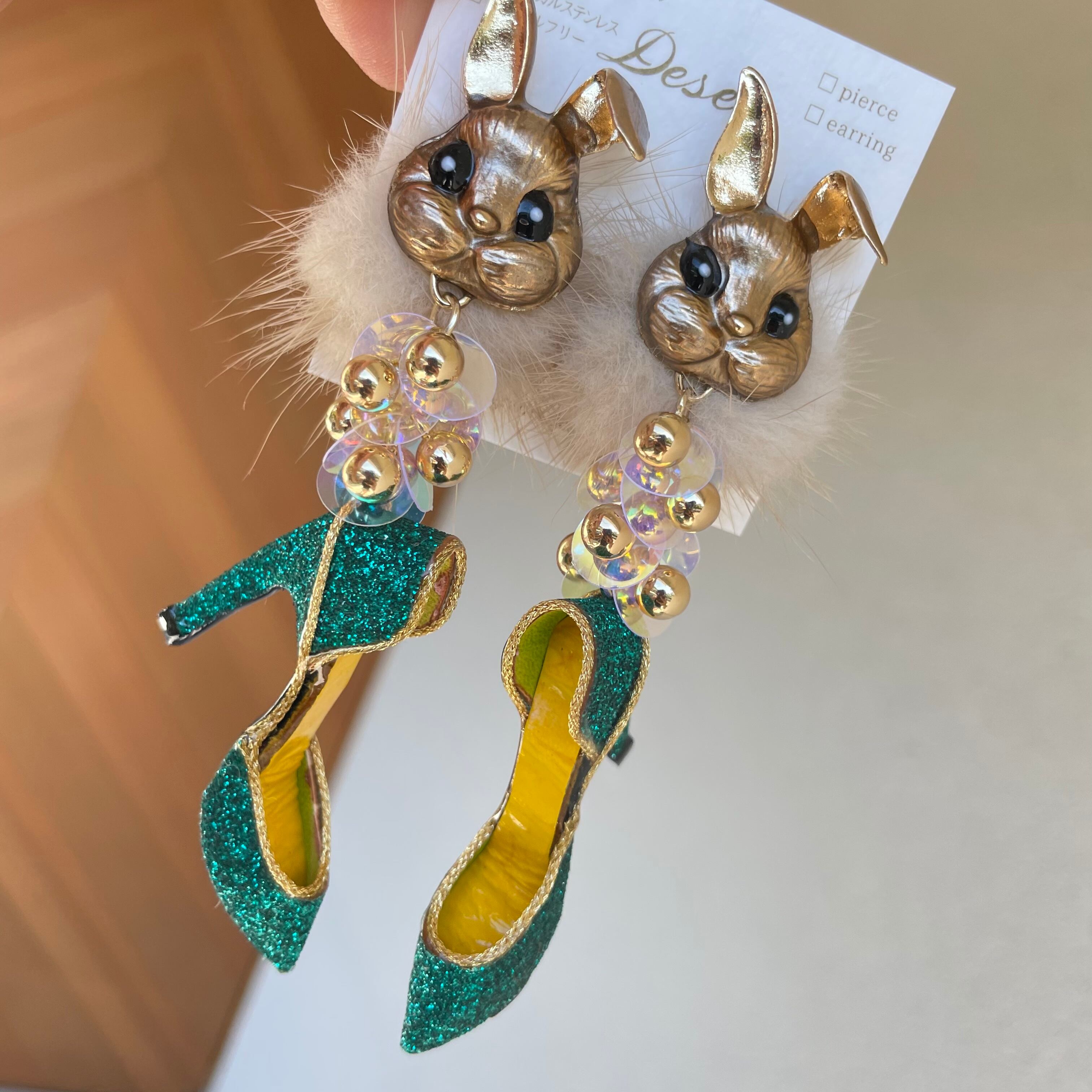 Gold Bunny❤️ラメグリーンハイヒール★ウサギ×ミンクファー✨ウサギピアス ウサギイヤリング NO.319