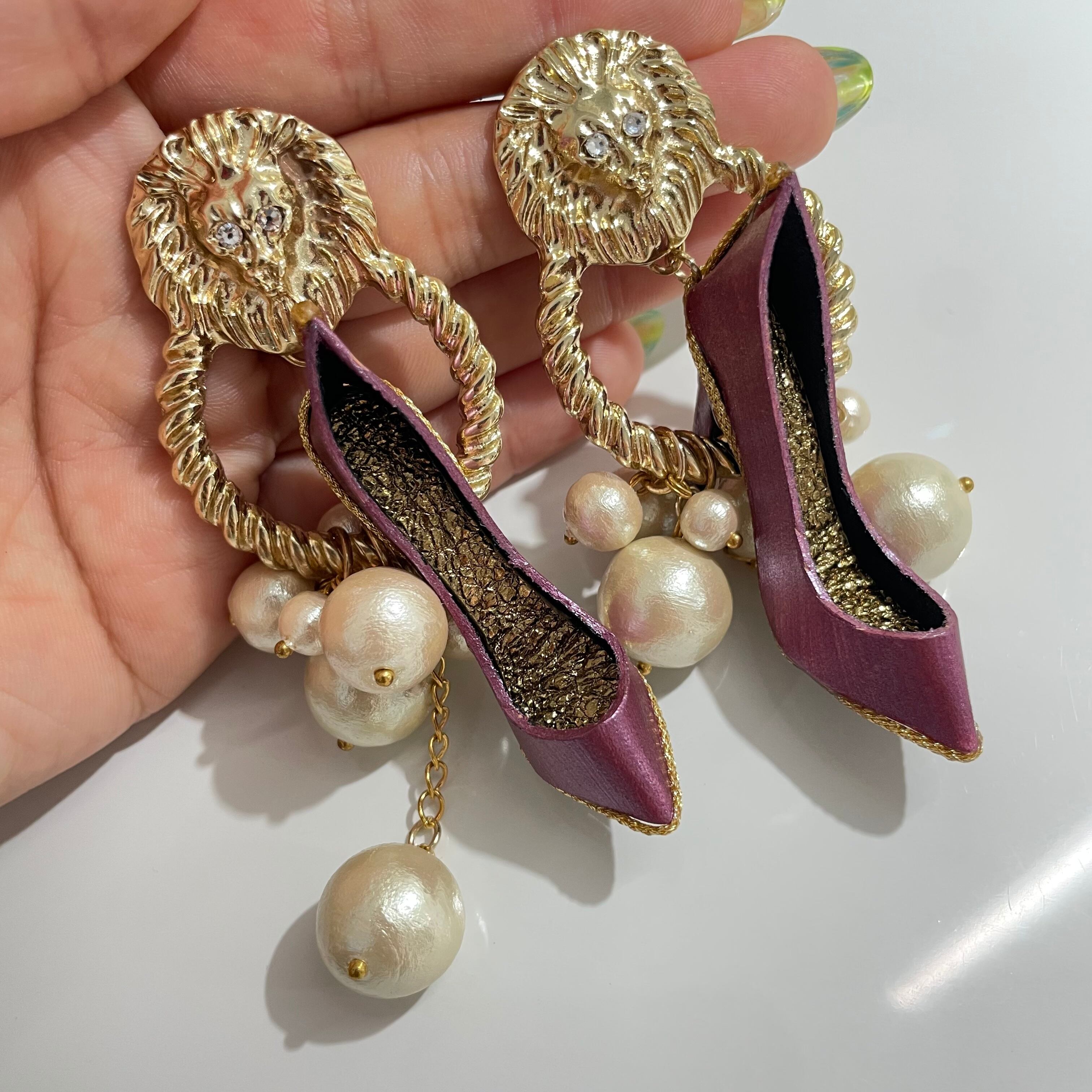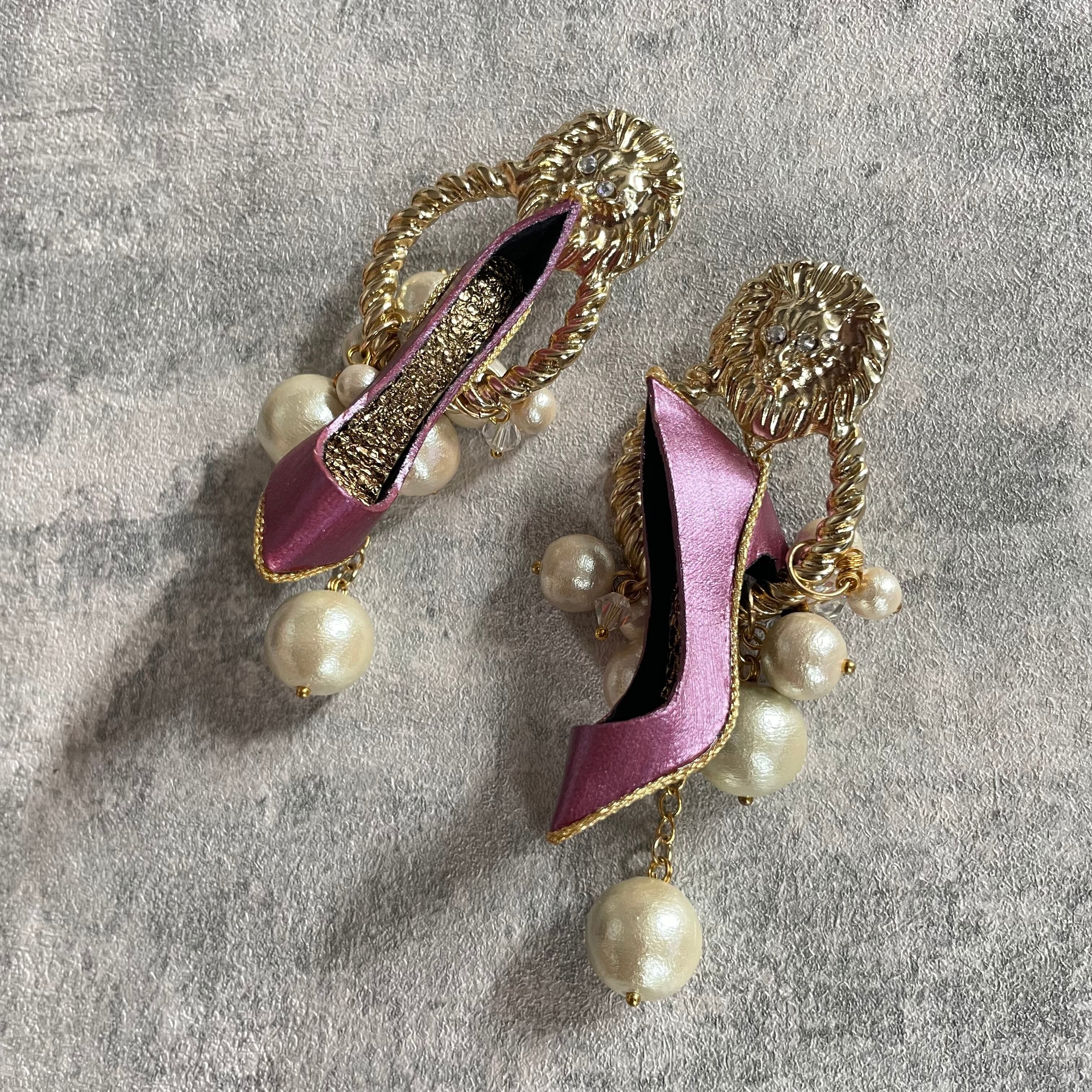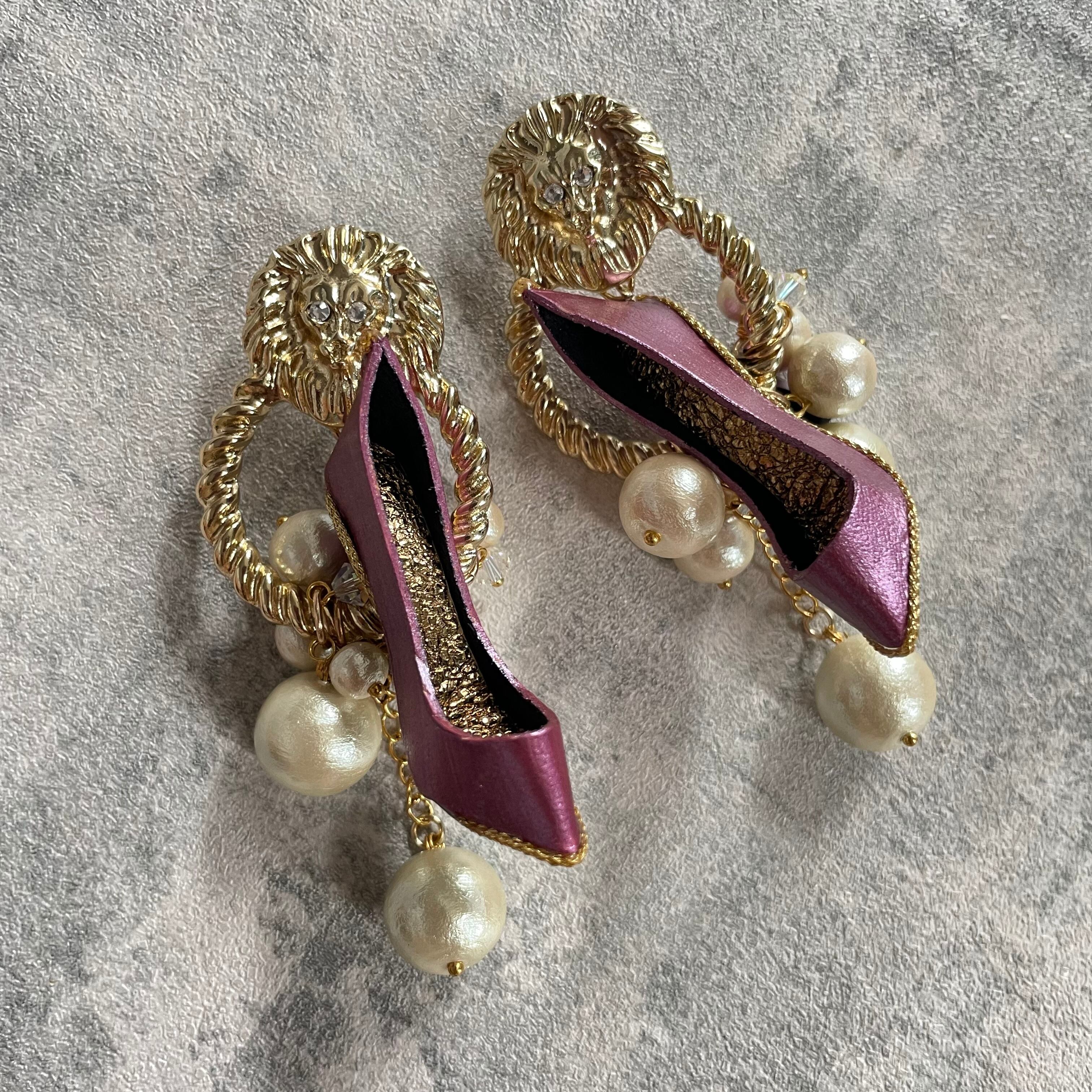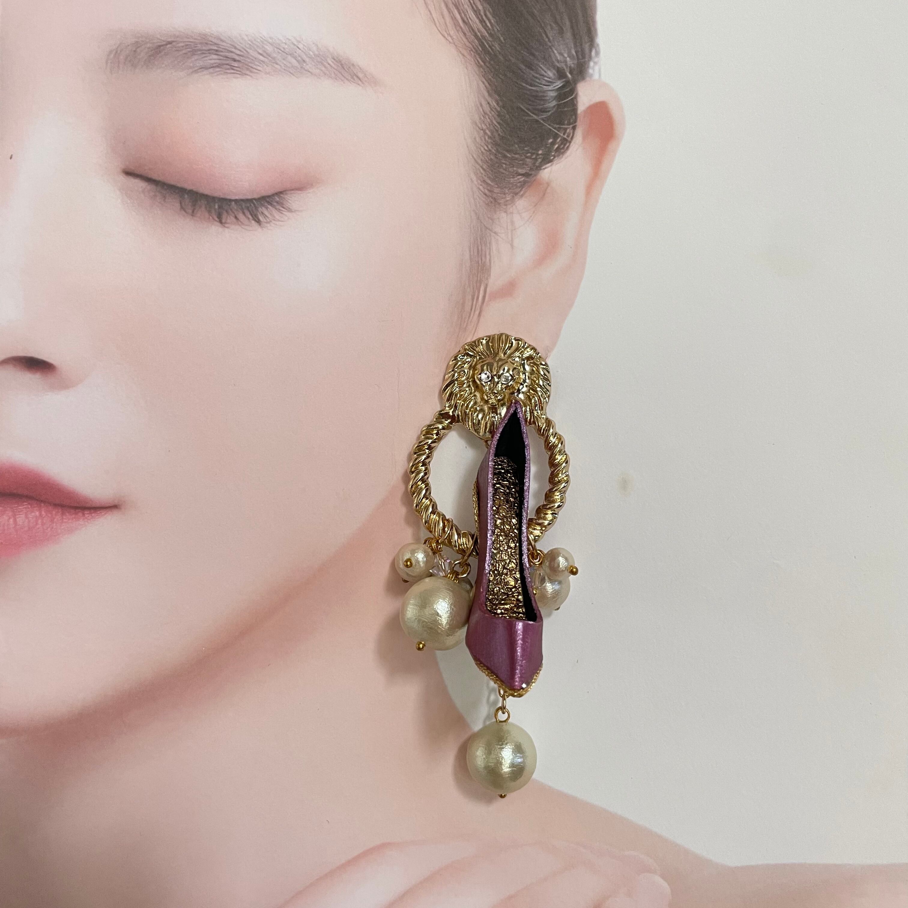 ライオン × ピンクパープルハイヒール❤️流れるパール ライオンピアス ハイヒールピアス NO.359