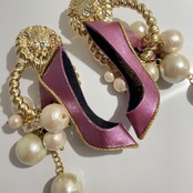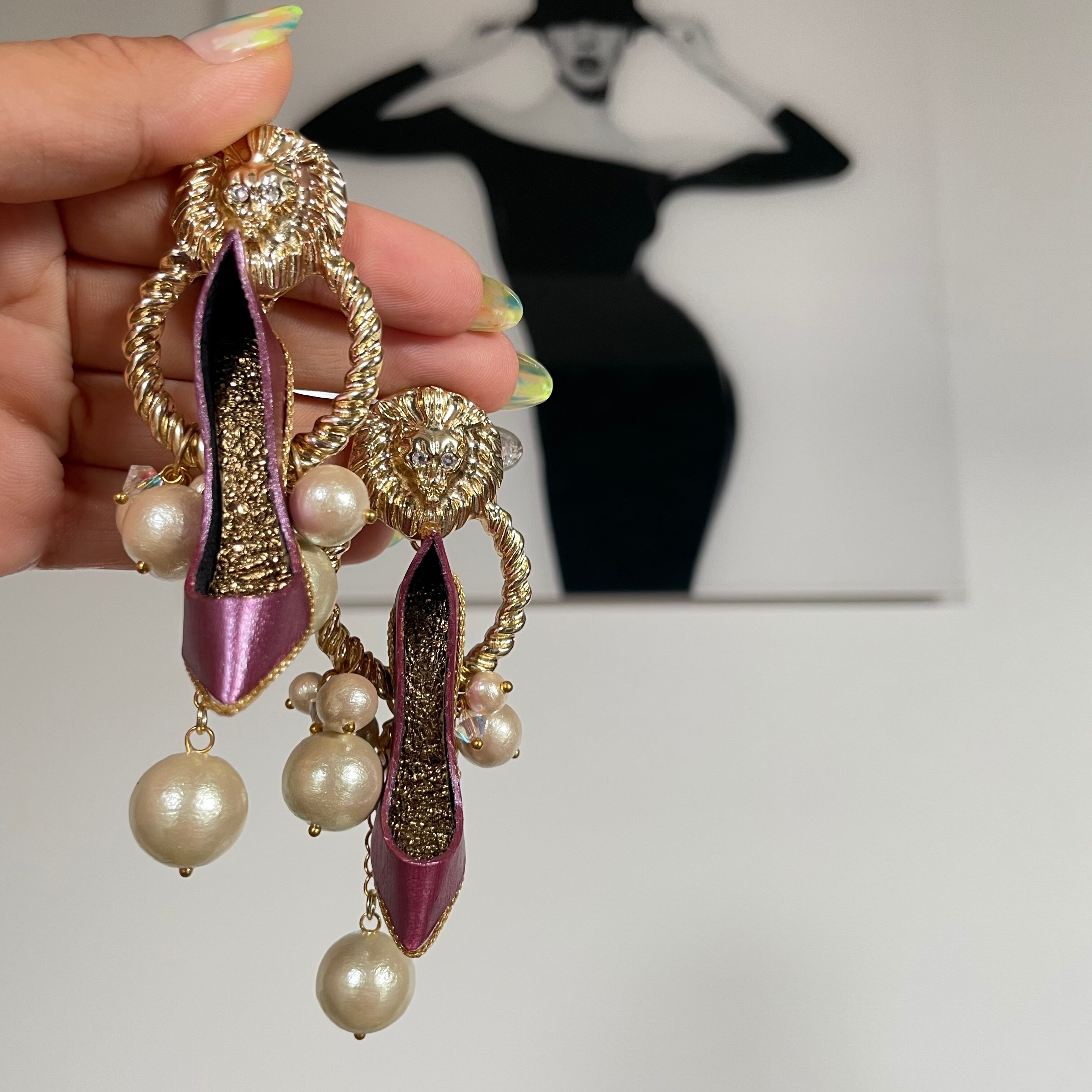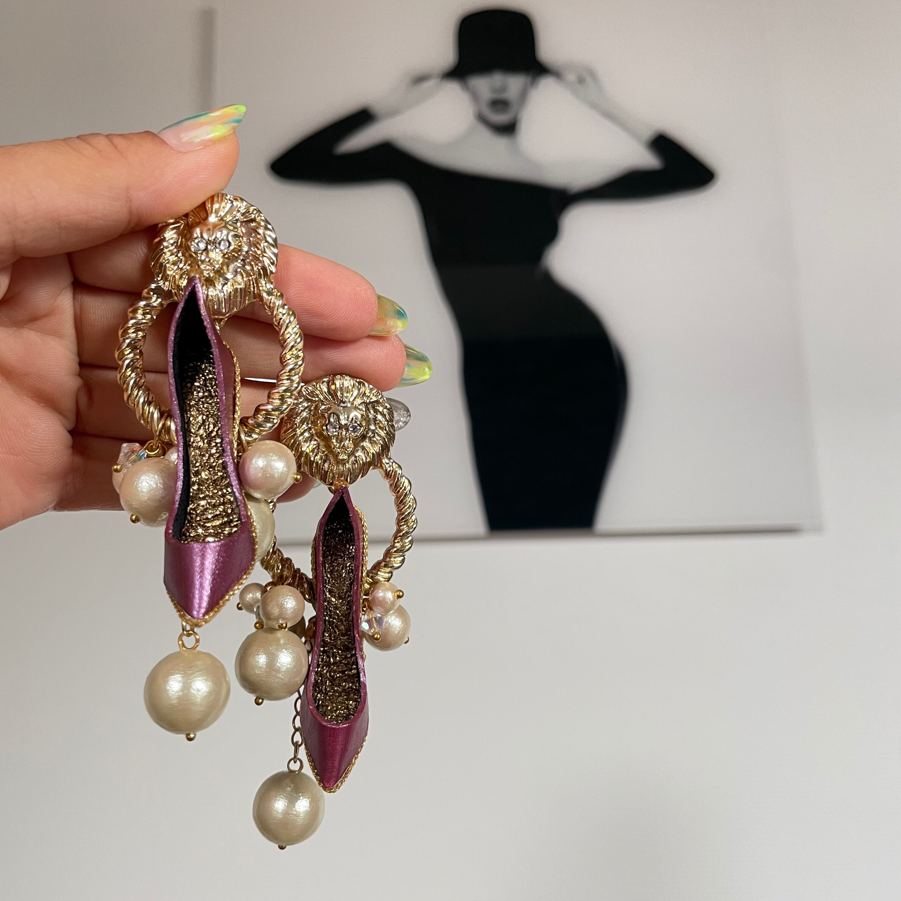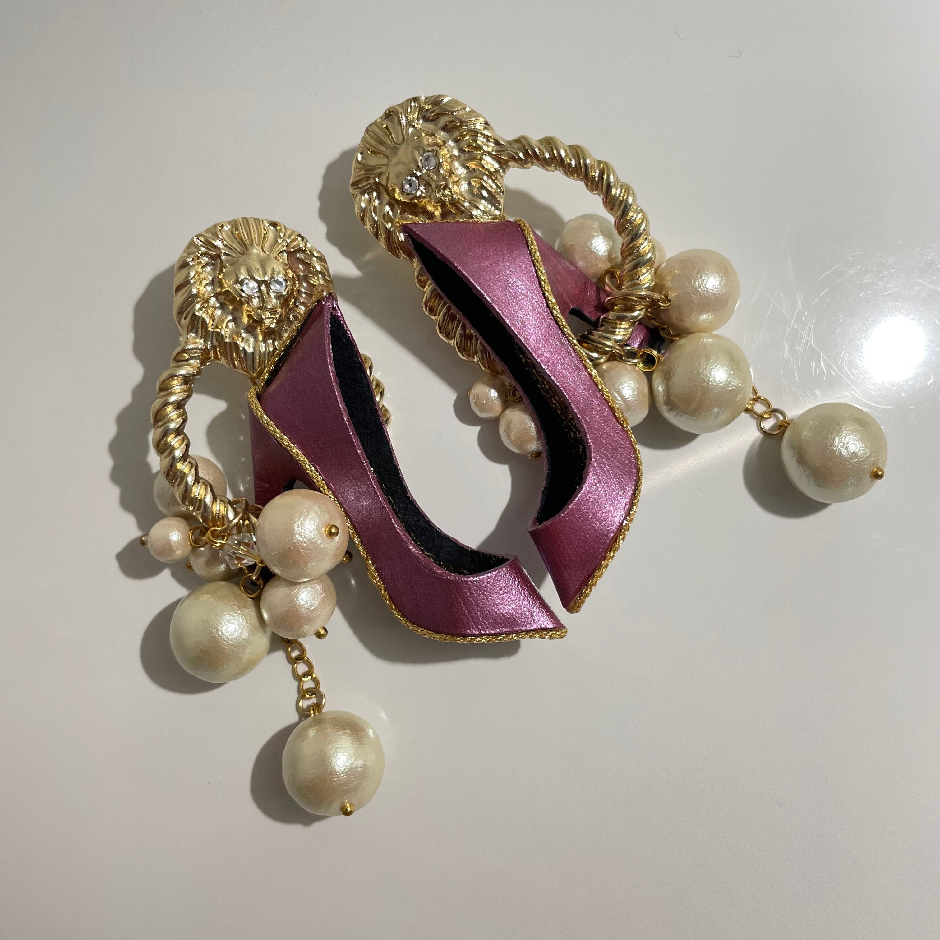 ライオン × ピンクパープルハイヒール❤️流れるパール ライオンピアス ハイヒールピアス NO.359