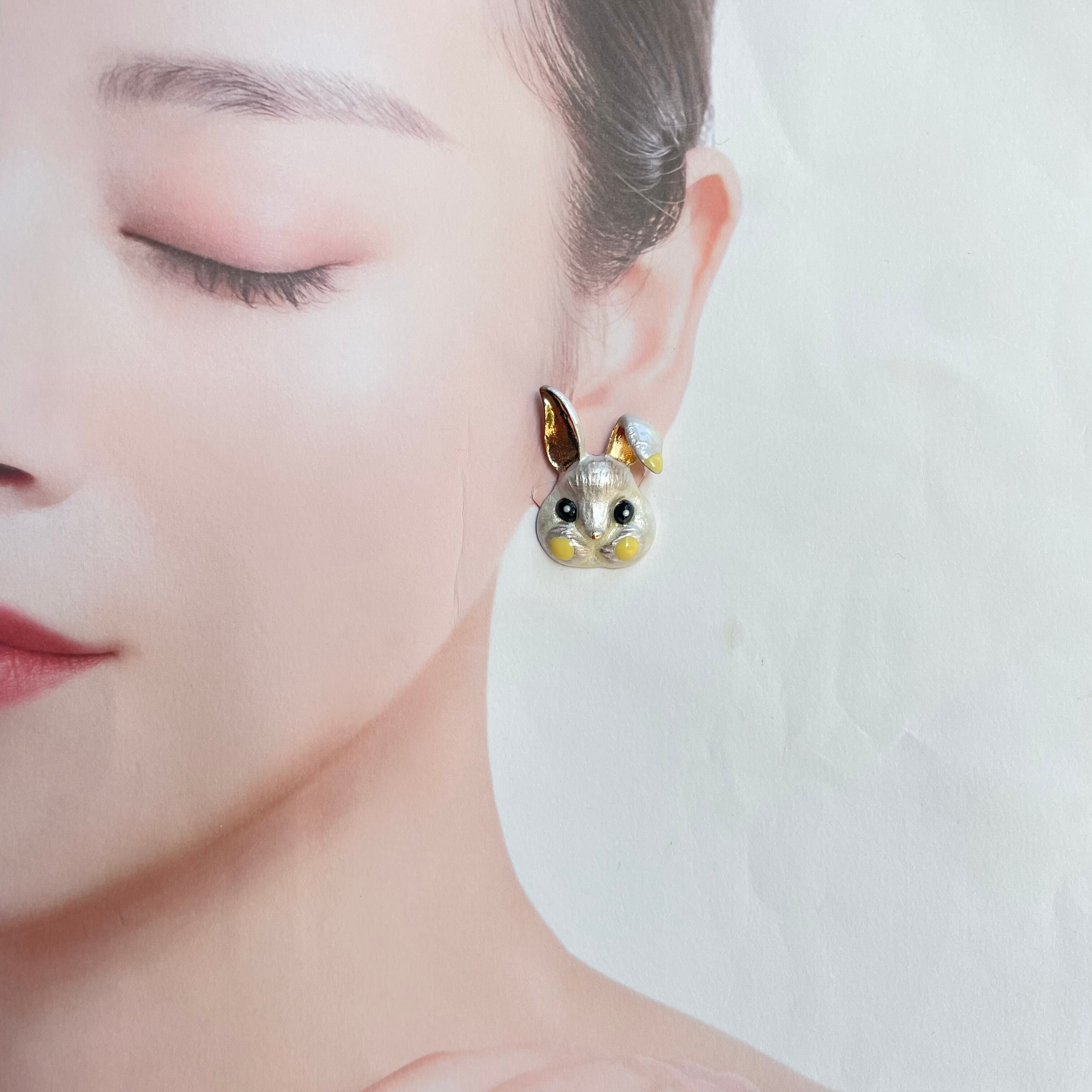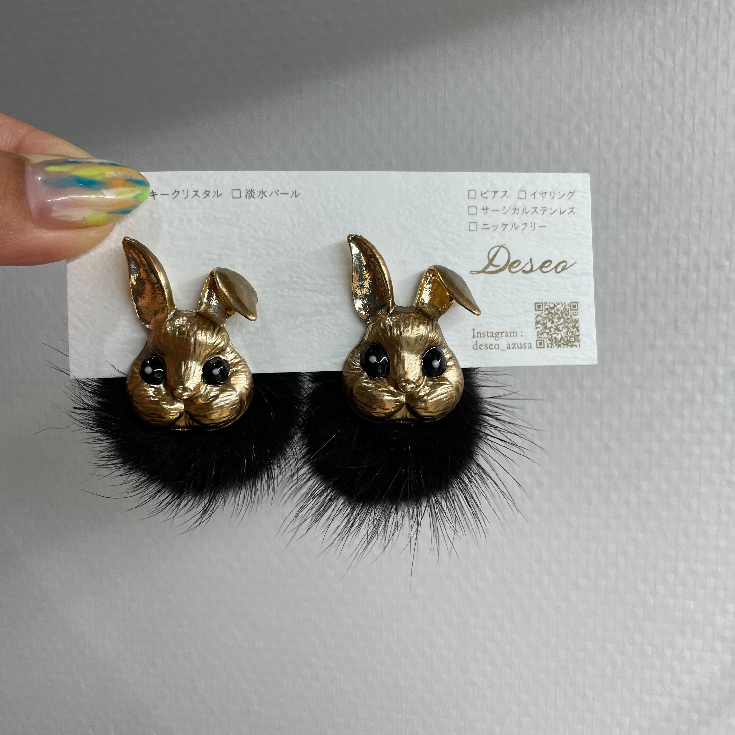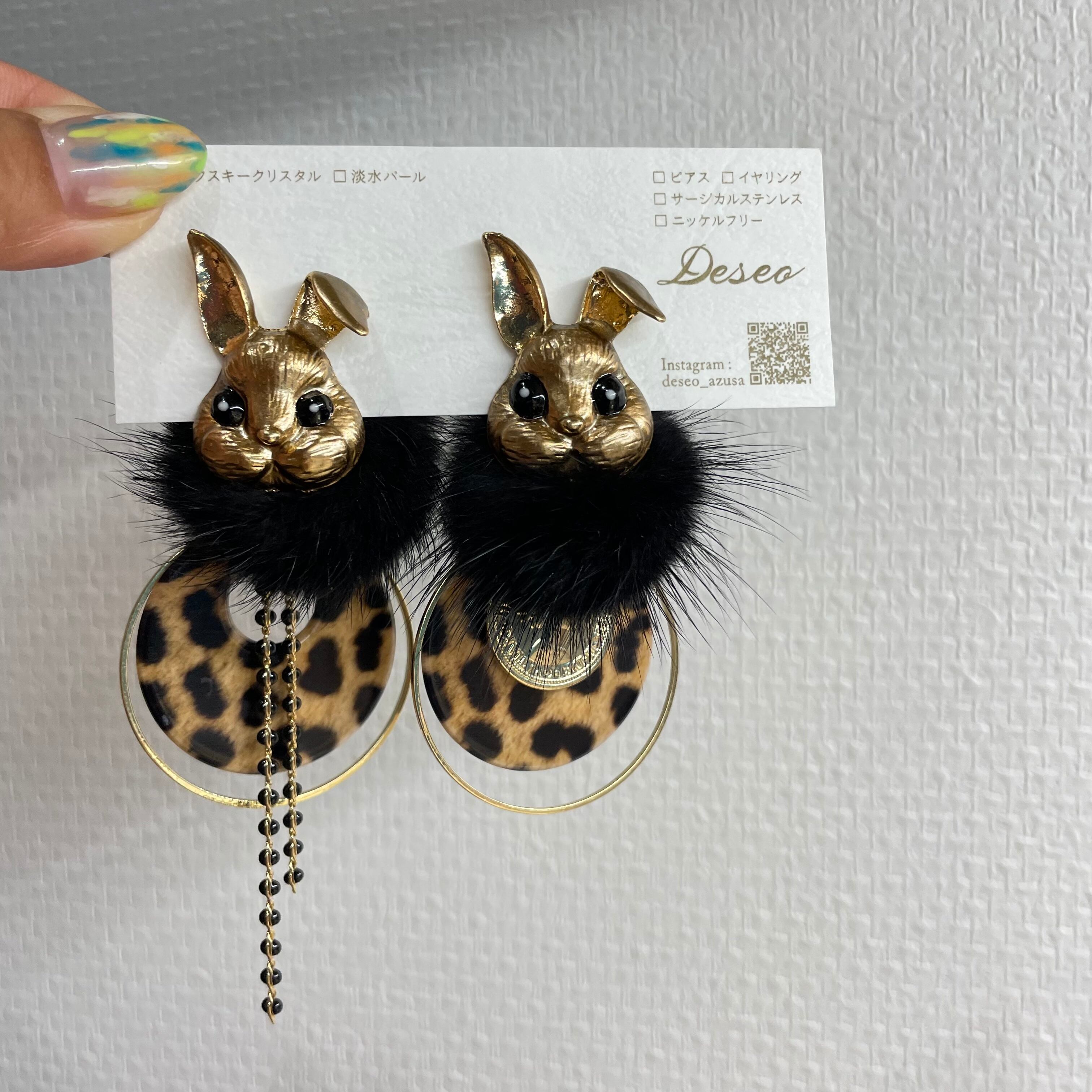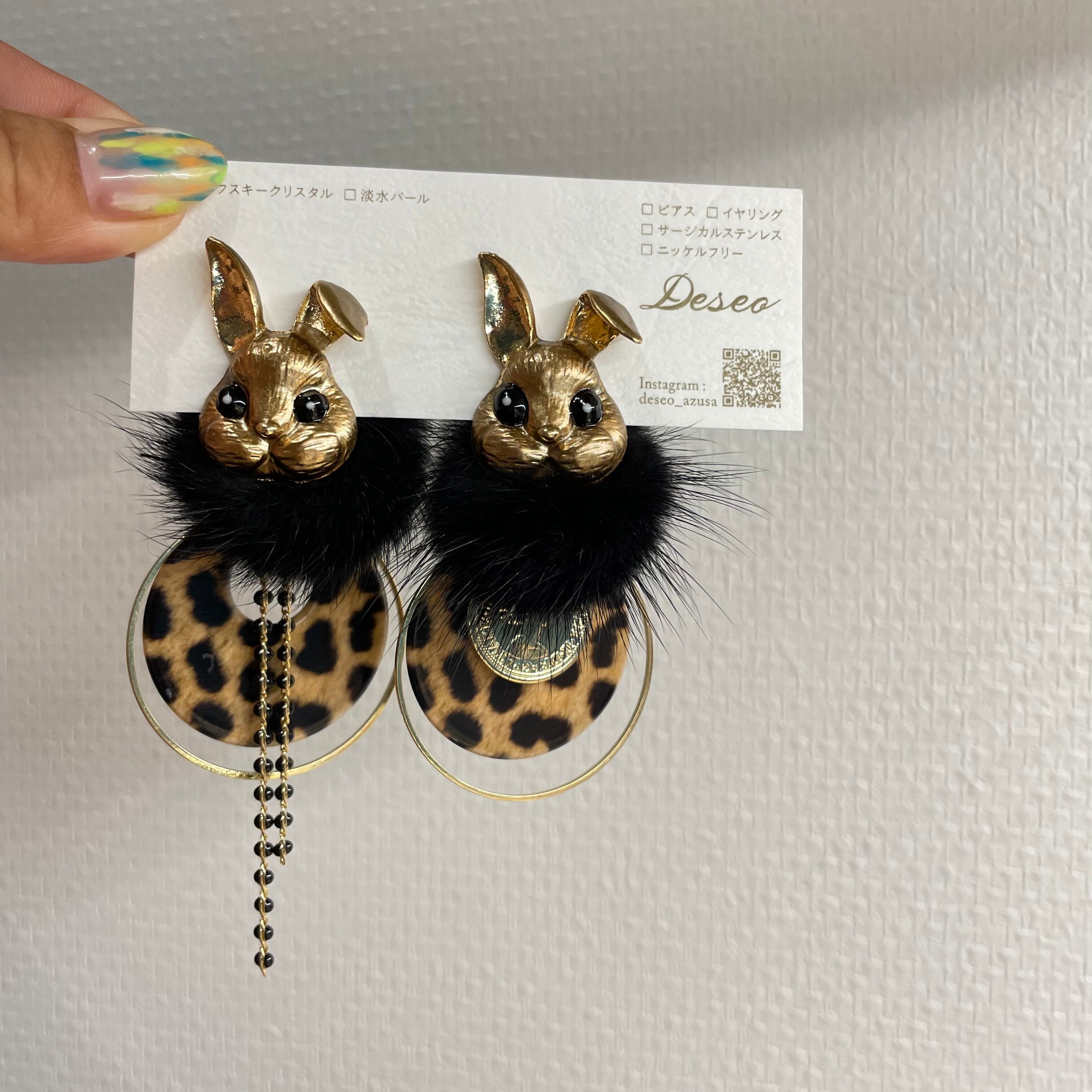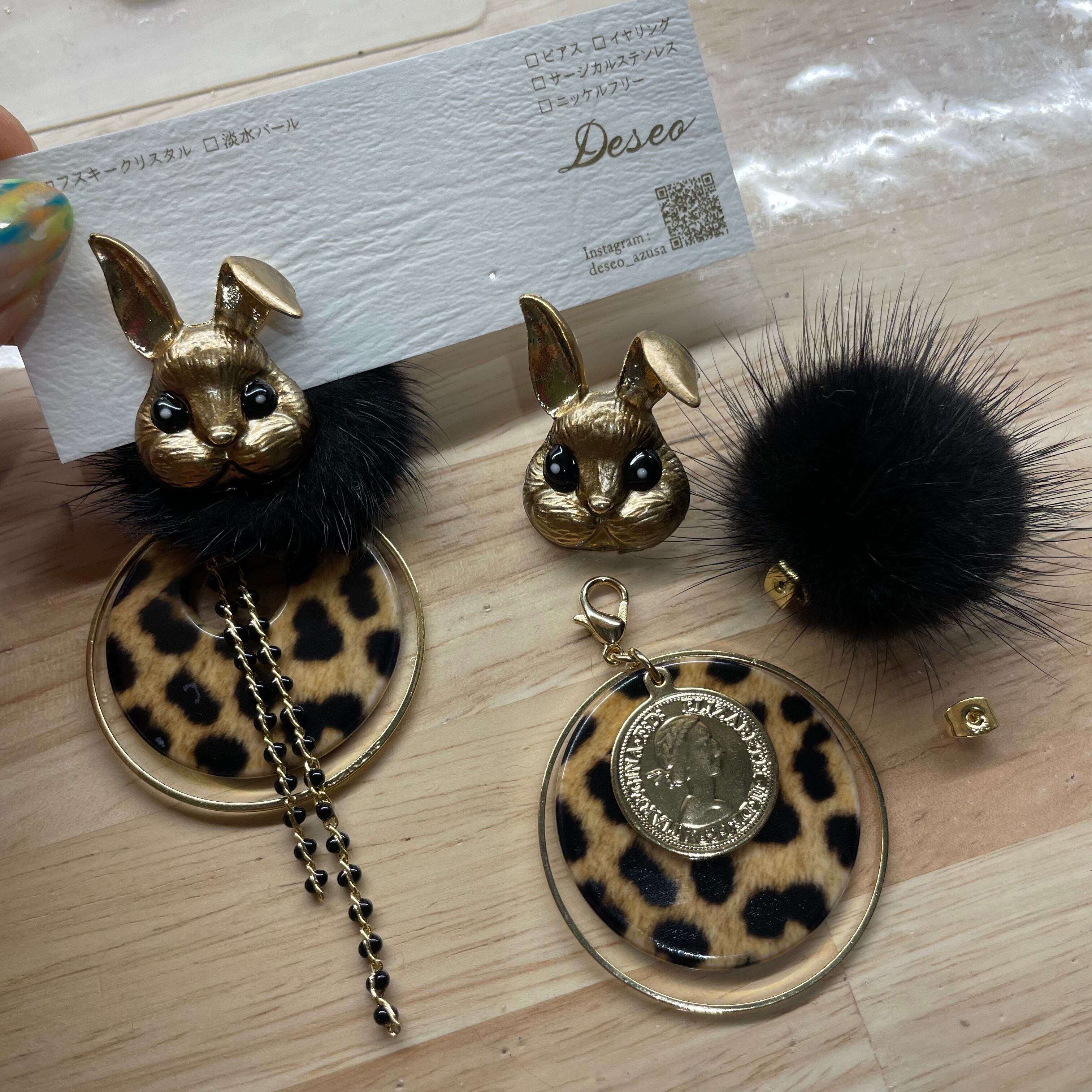 もふもふウサギ❤️GD×黒★レオパチャーム ウサギピアス ウサギイヤリング NO.375