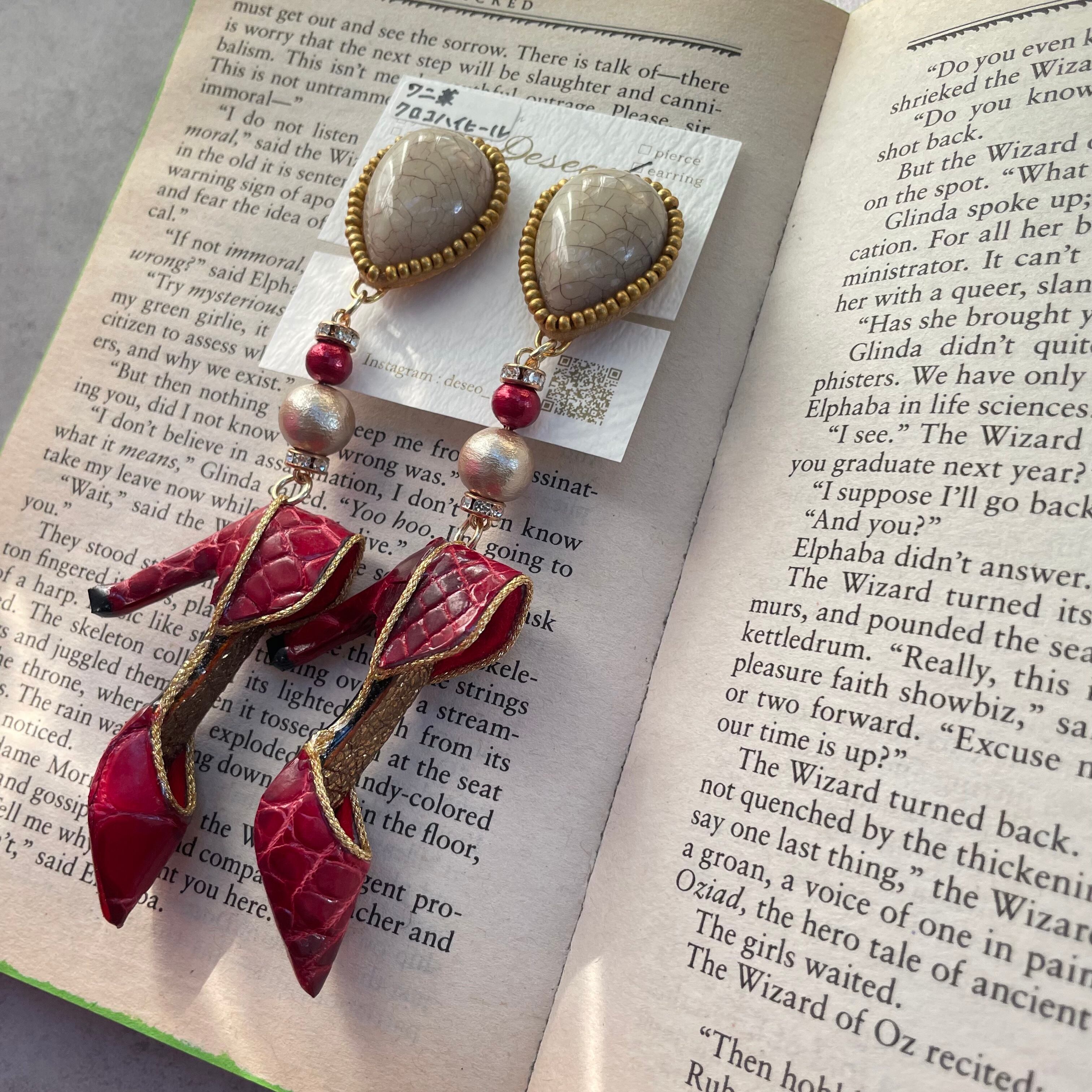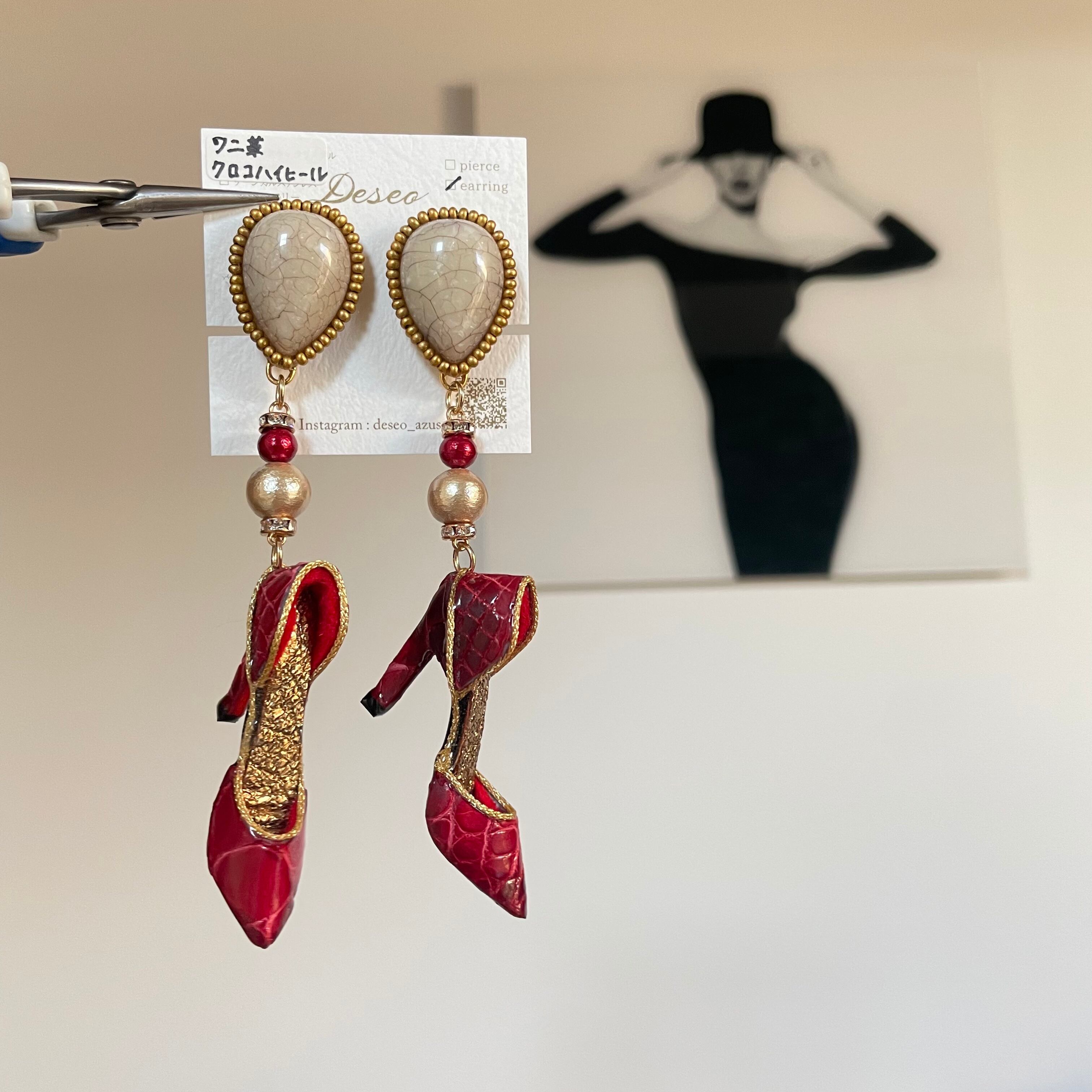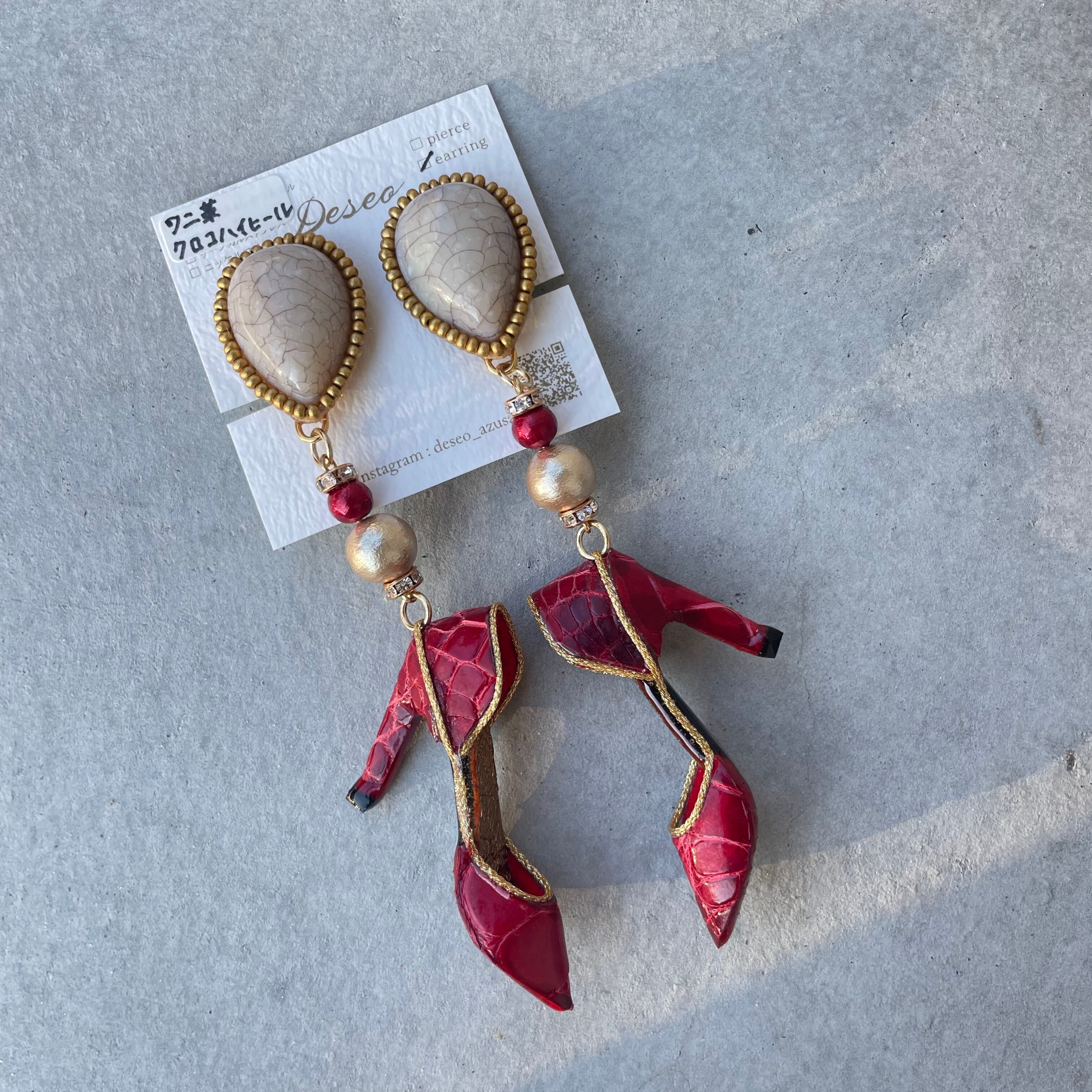 ボルドーワニ革★クロコハイヒール❤️ハイヒールピアス ハイヒールイヤリング NO.392
