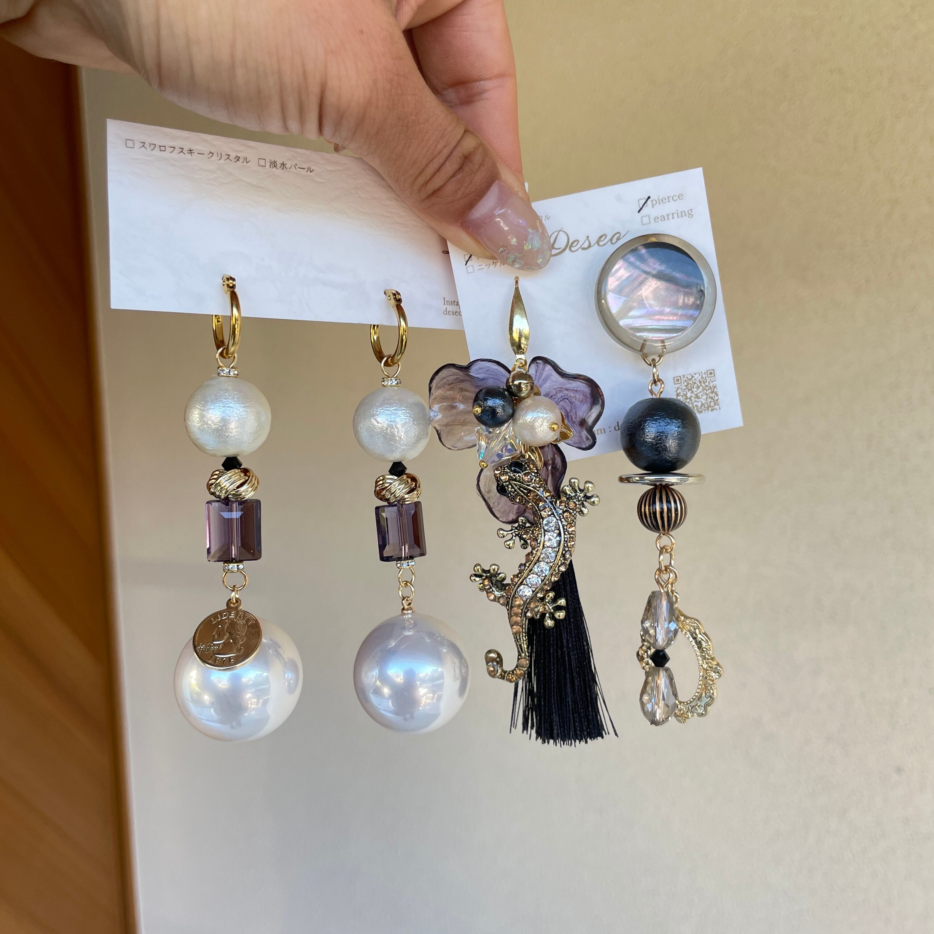 コットンパールとアクリルパールどちらも使用したダークパープルのクリスタルビーズの可愛いこちら