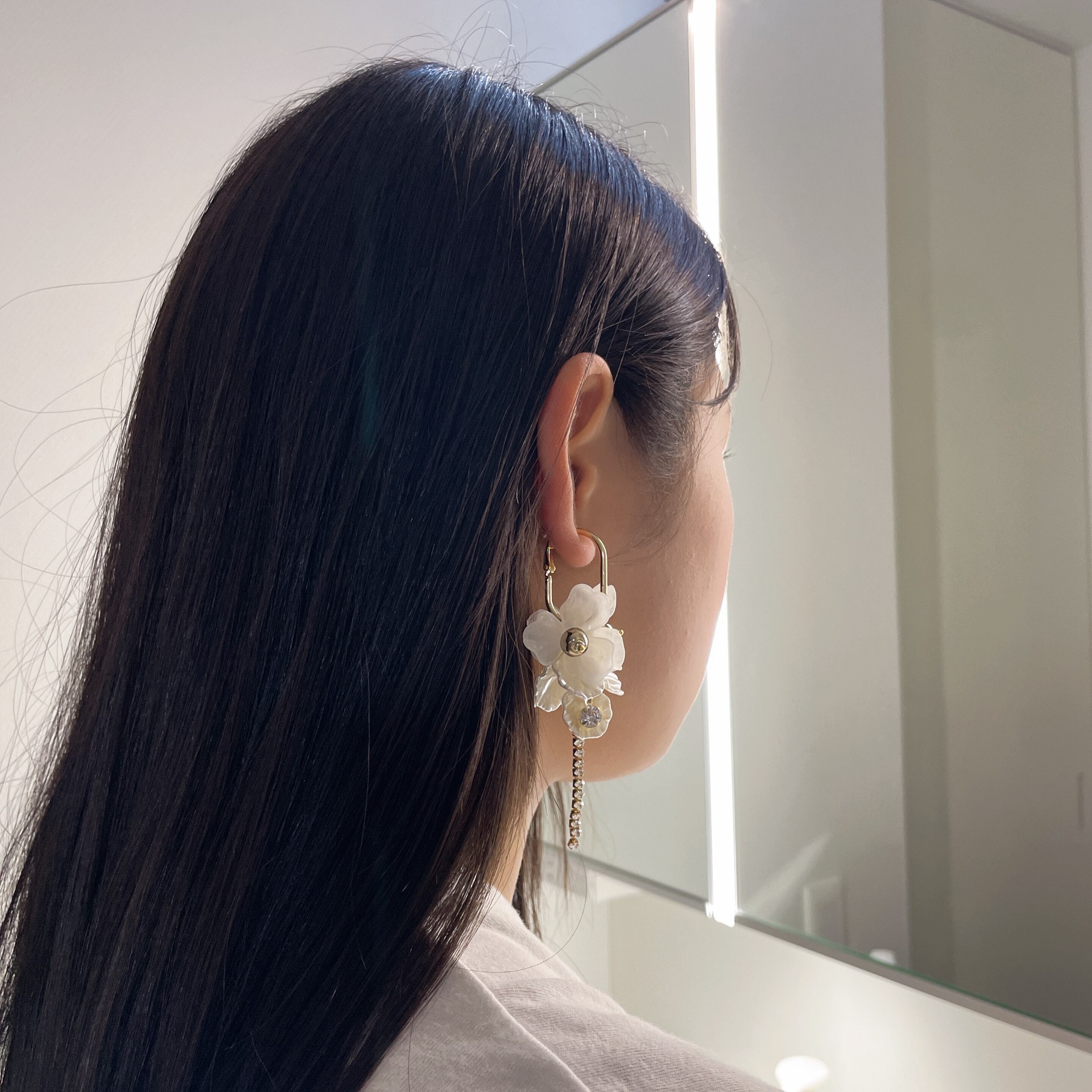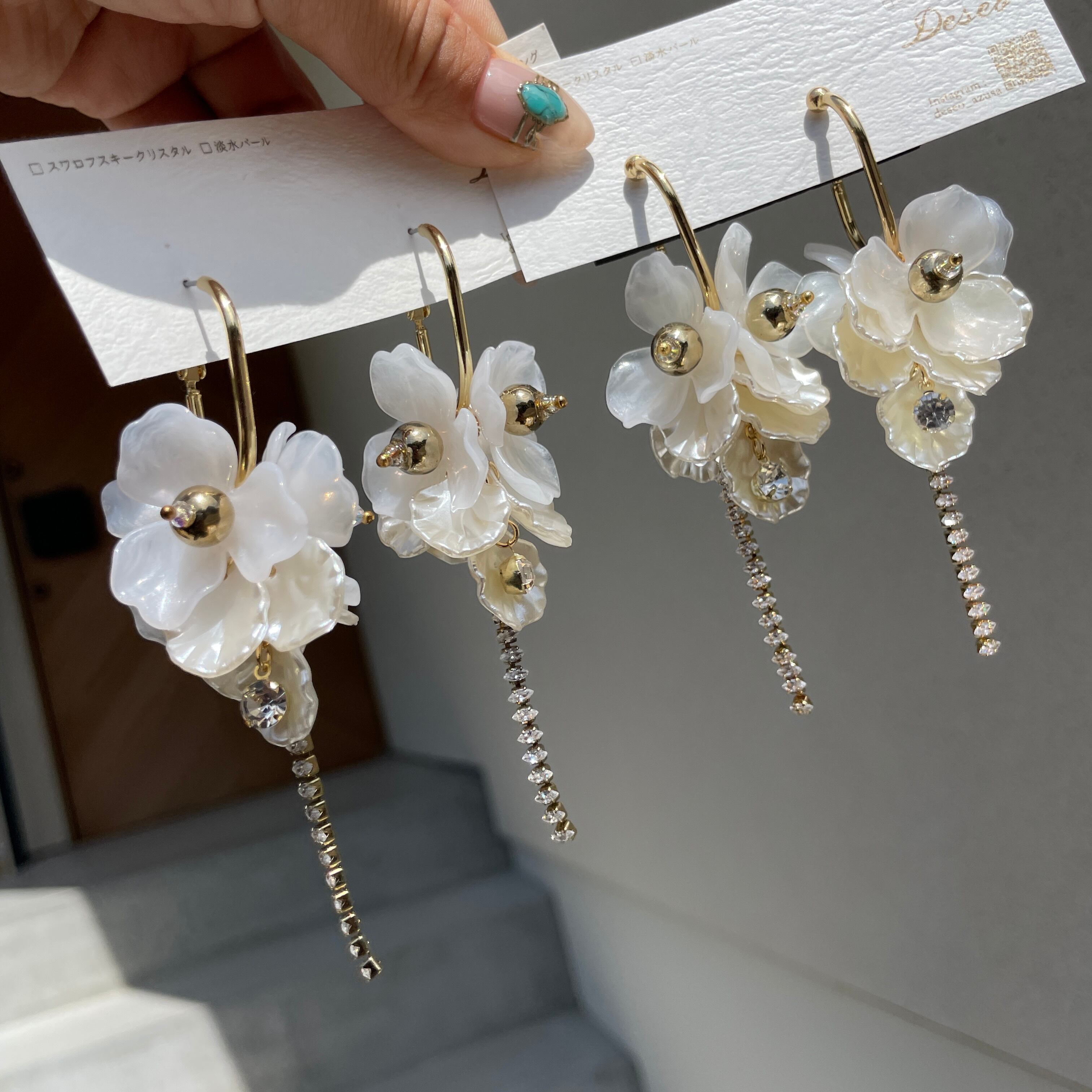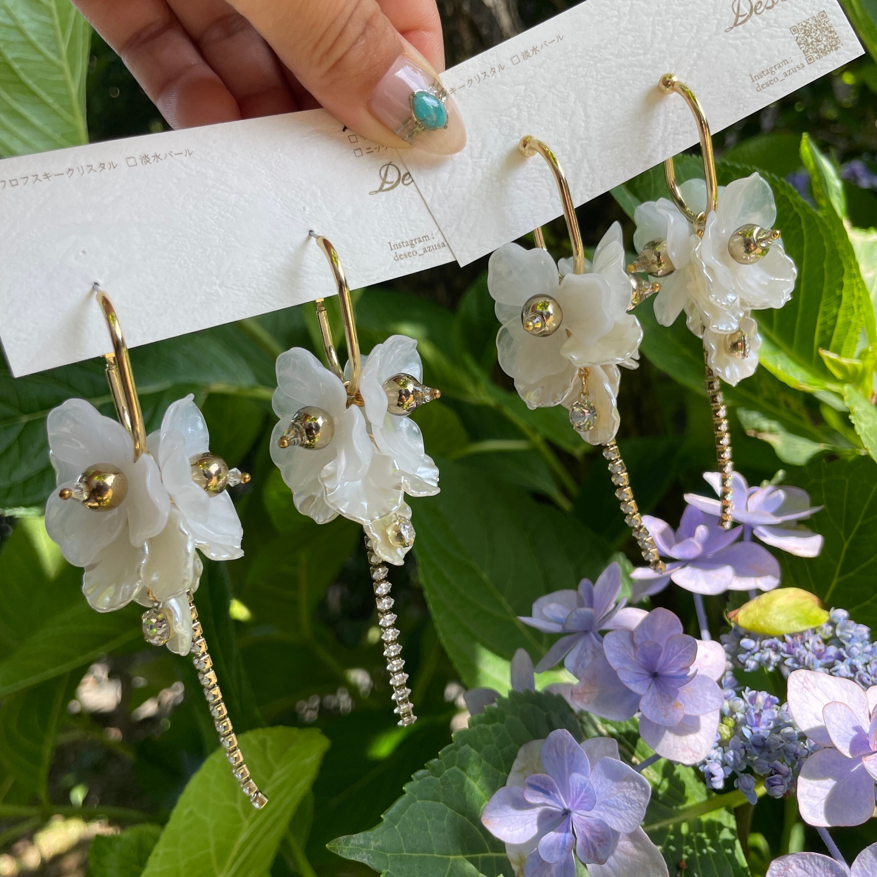 いつもより少しサイズの小さいお花パーツを使用してます。透け感のあるホワイトアクリルフラワー✨片方に3つ、どの角度から見ても、カワイイ❤️