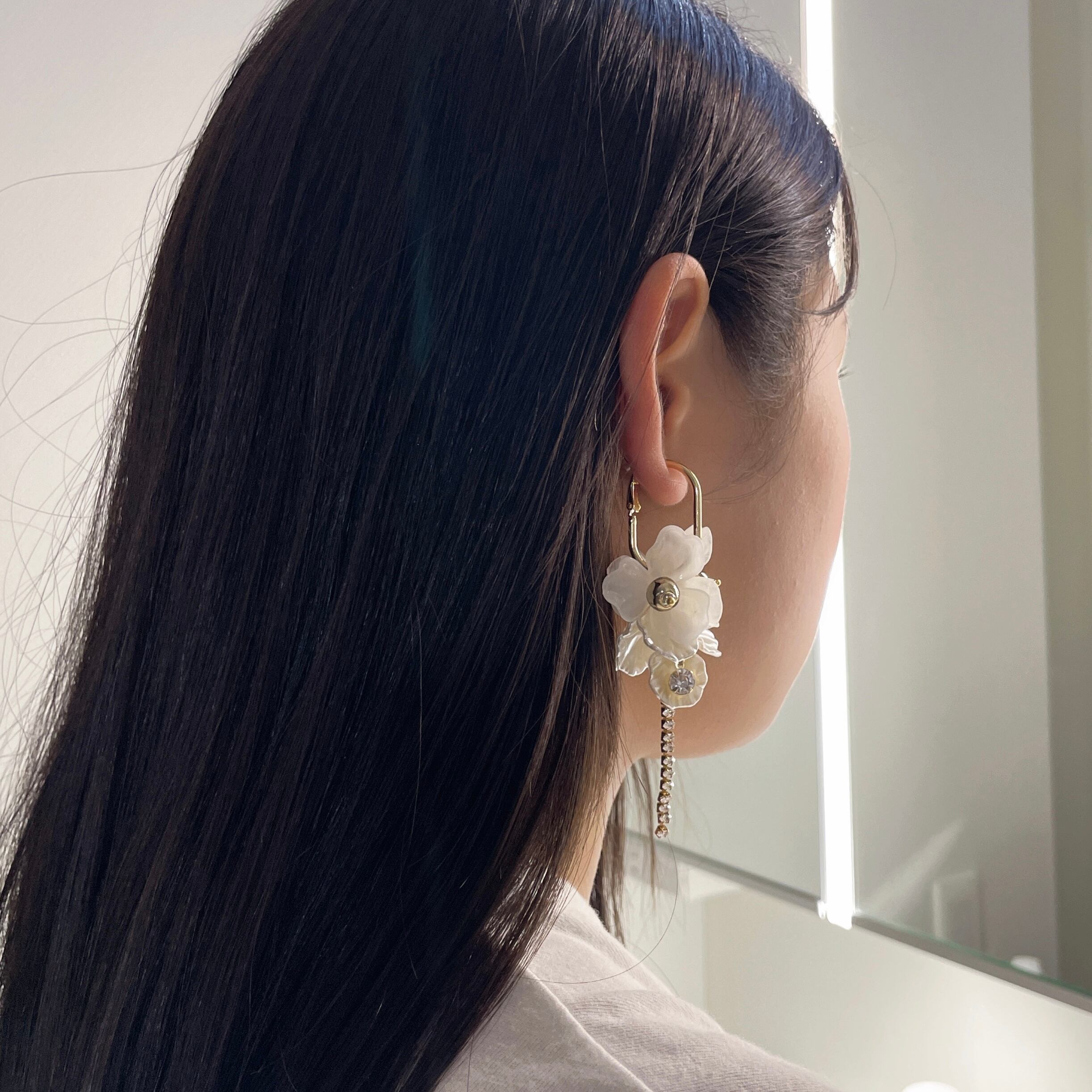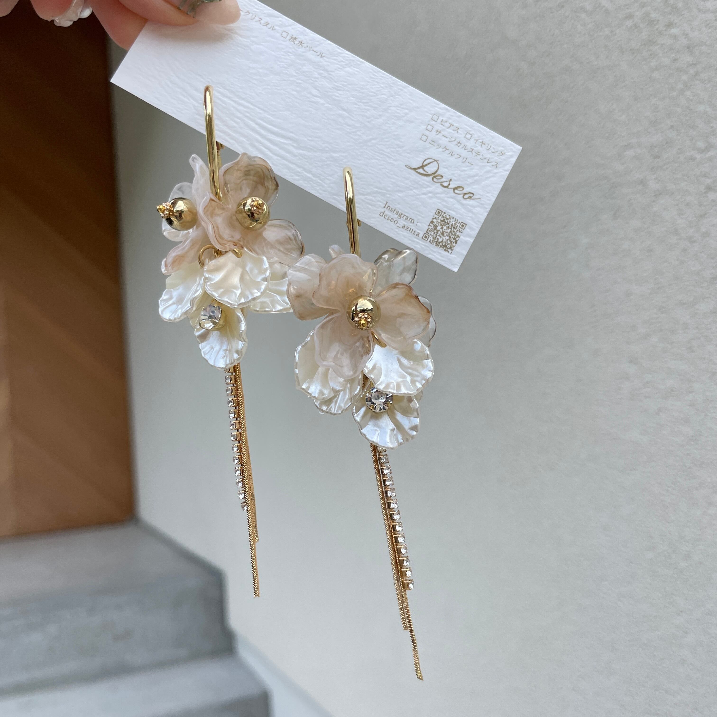 いつもより少しサイズの小さいお花パーツを使用してます。クリアベージュのアクリルフラワー✨片方に3つ、どの角度から見ても、カワイイ❤️
