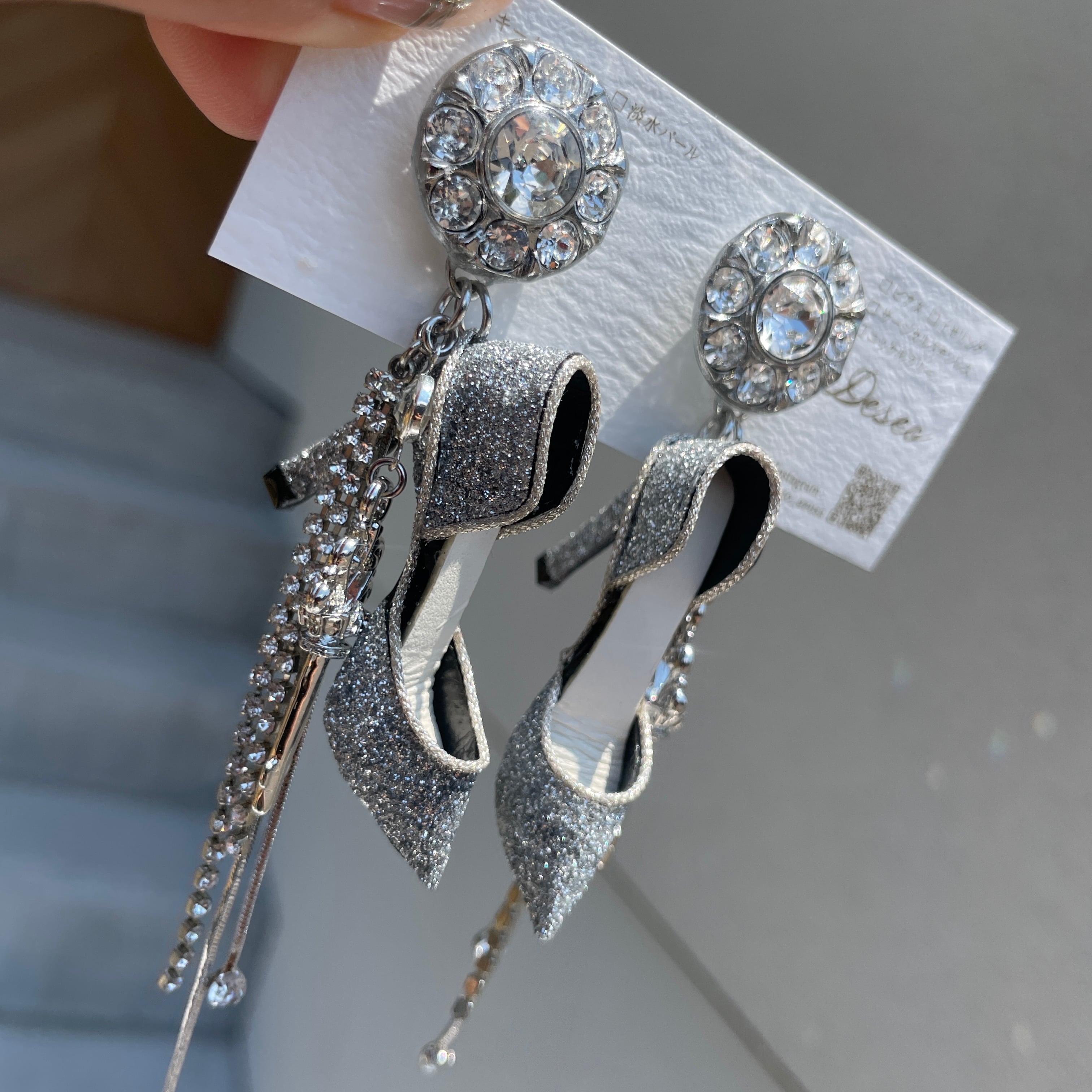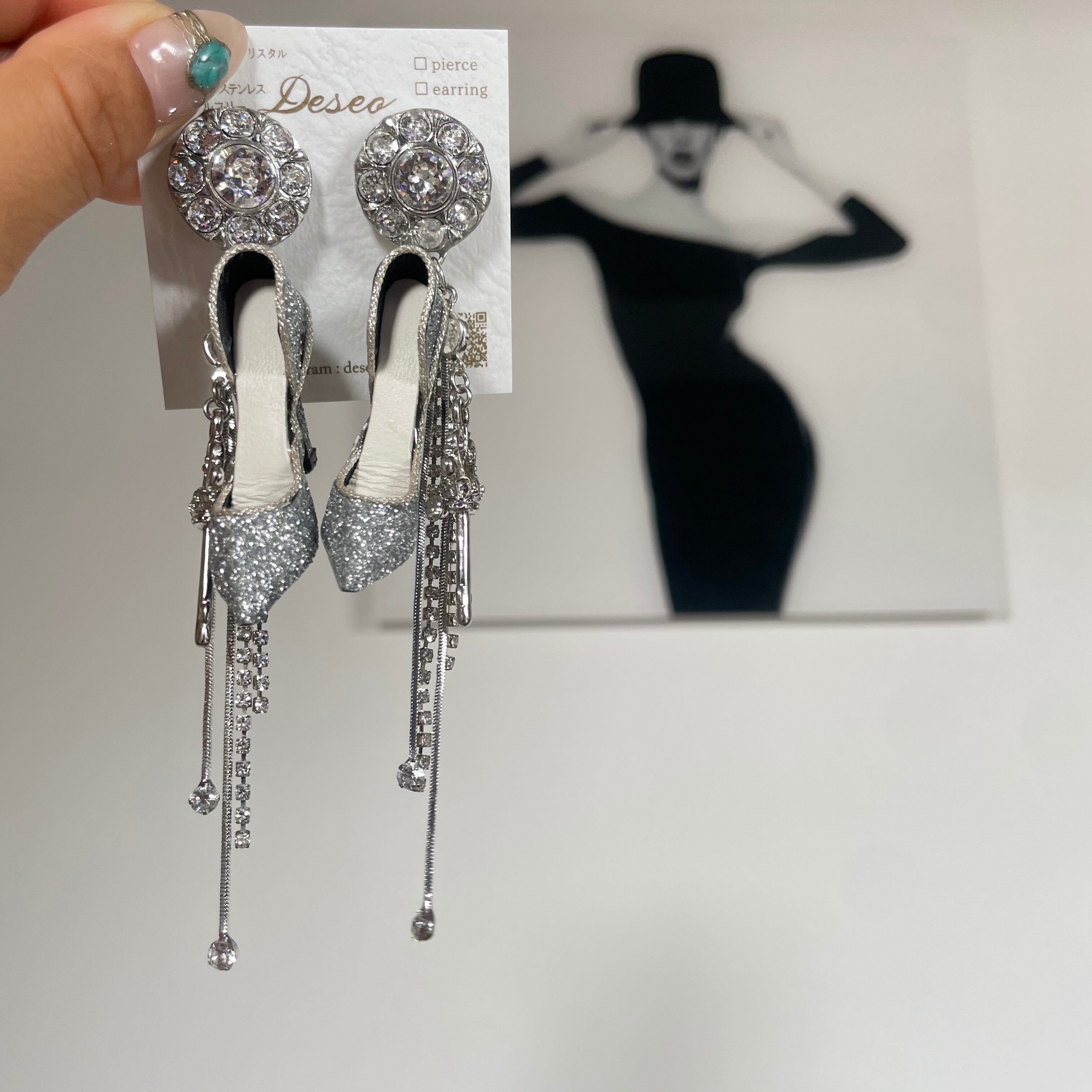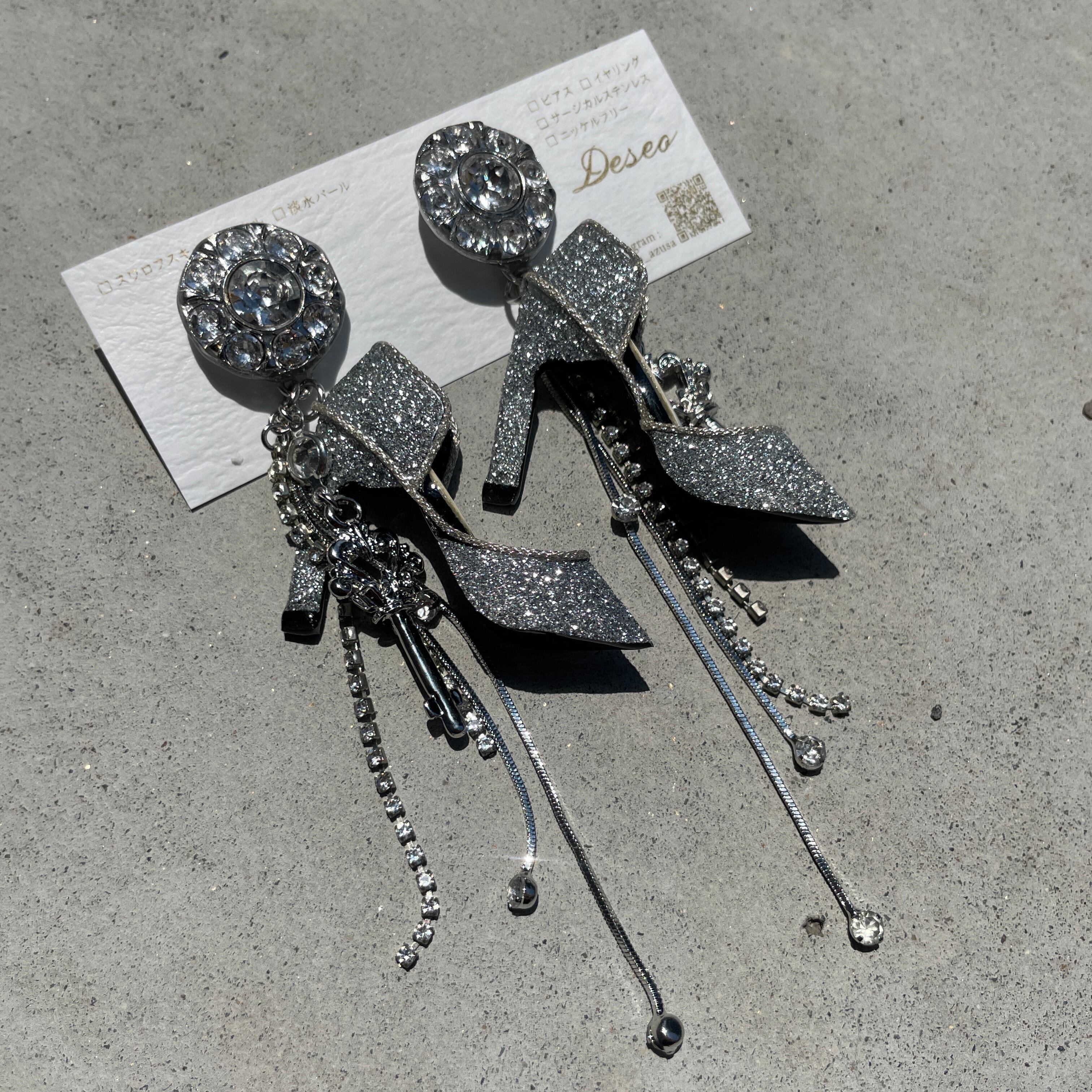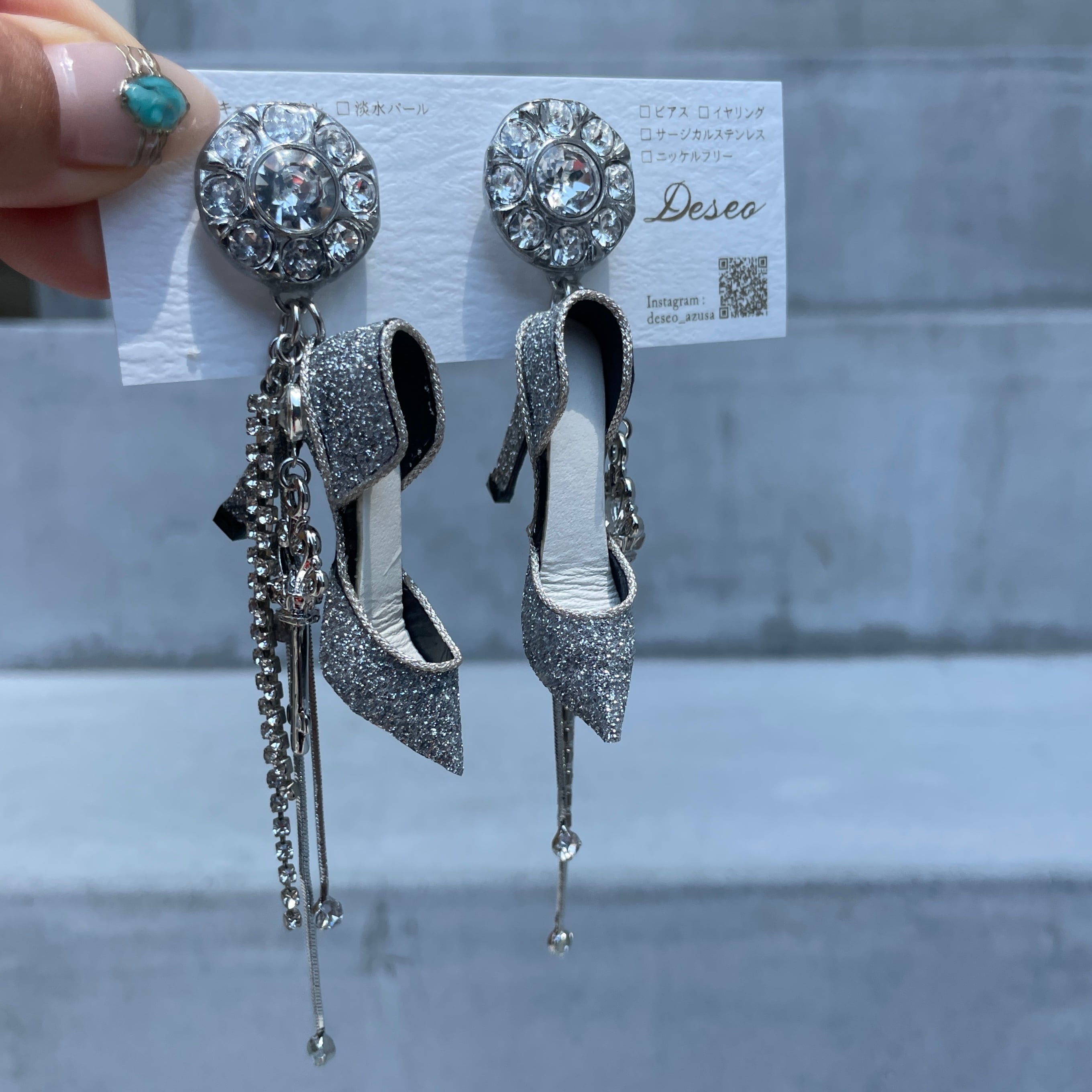 スワロフスキーボタン✨シルバーラメハイヒール❤️ハイヒールピアス NO.619