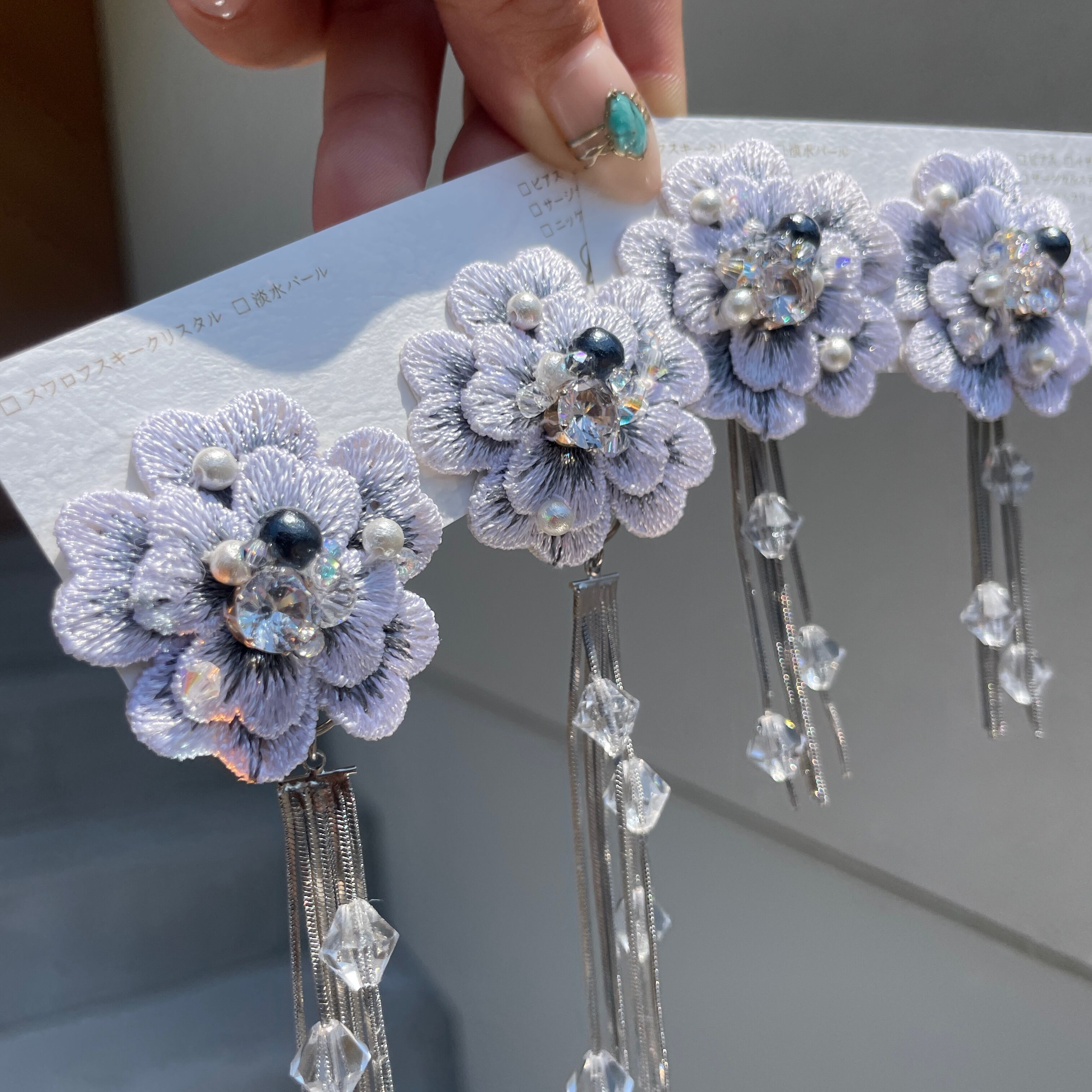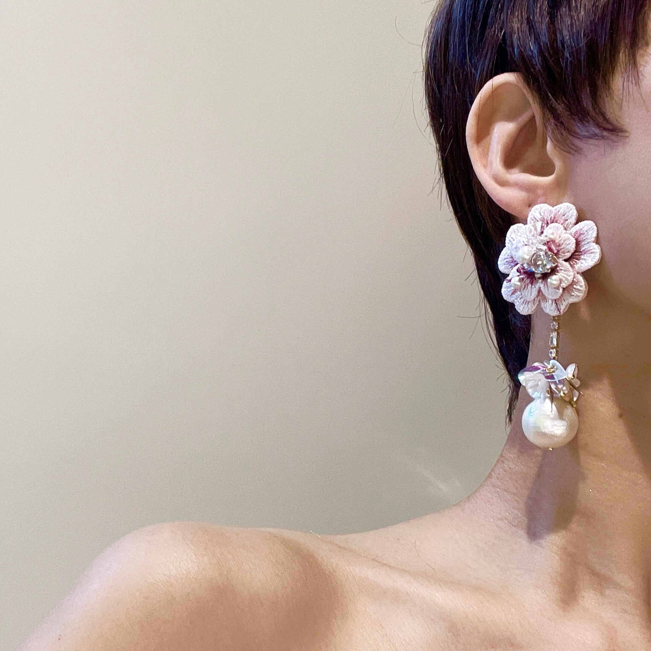 こちらはピンクのお花刺繍モチーフにスワロフスキービーズやパールなどキラキラを縫い付けました✨