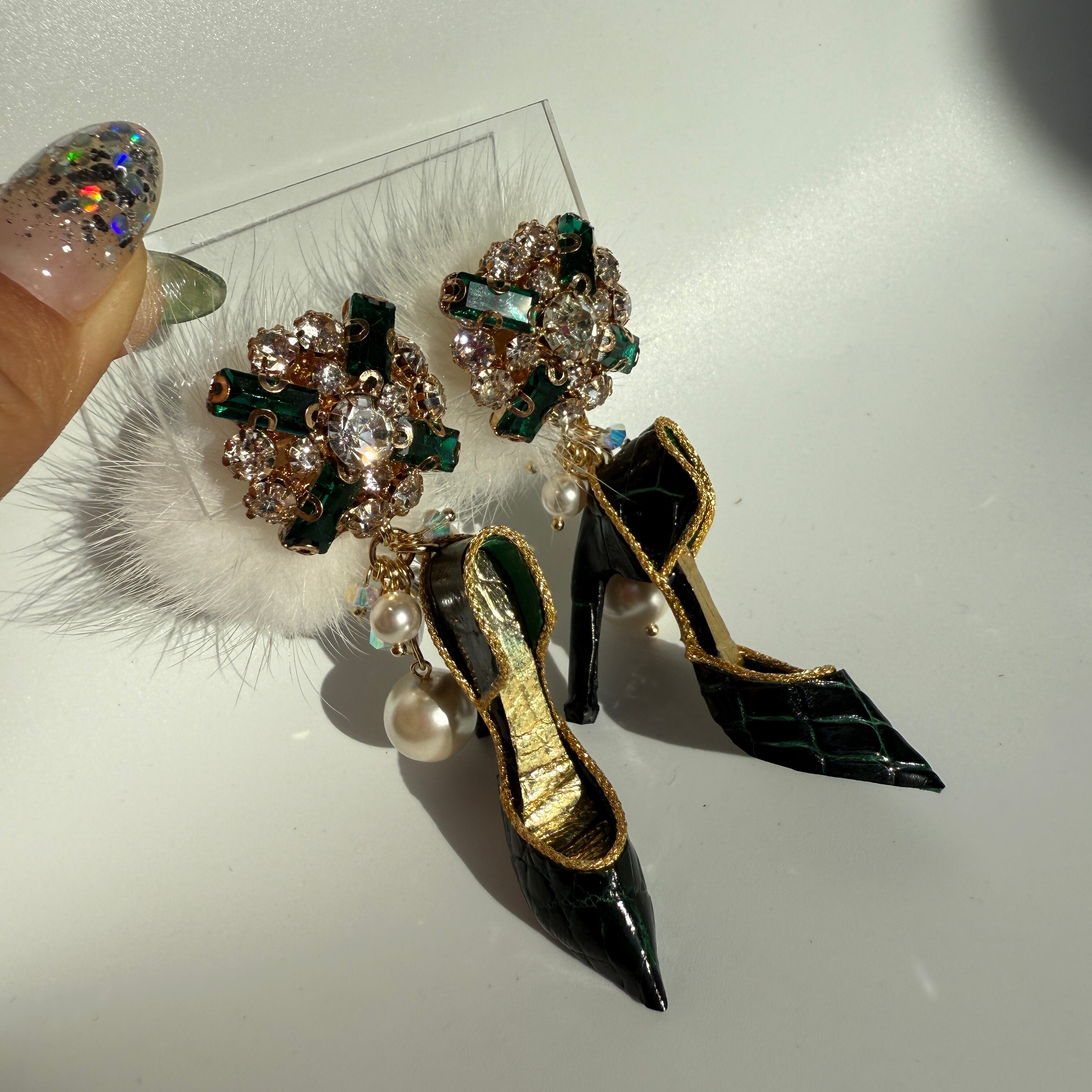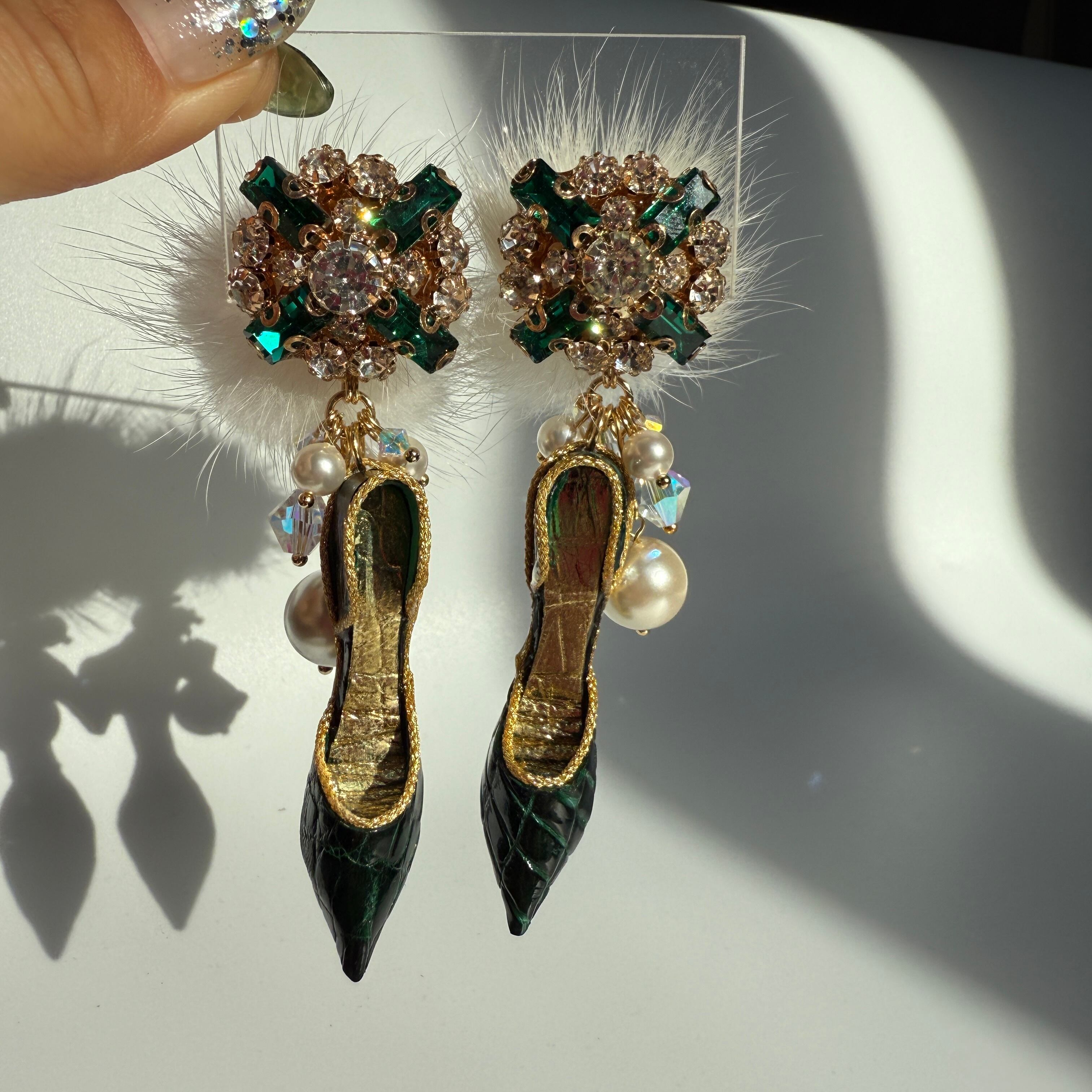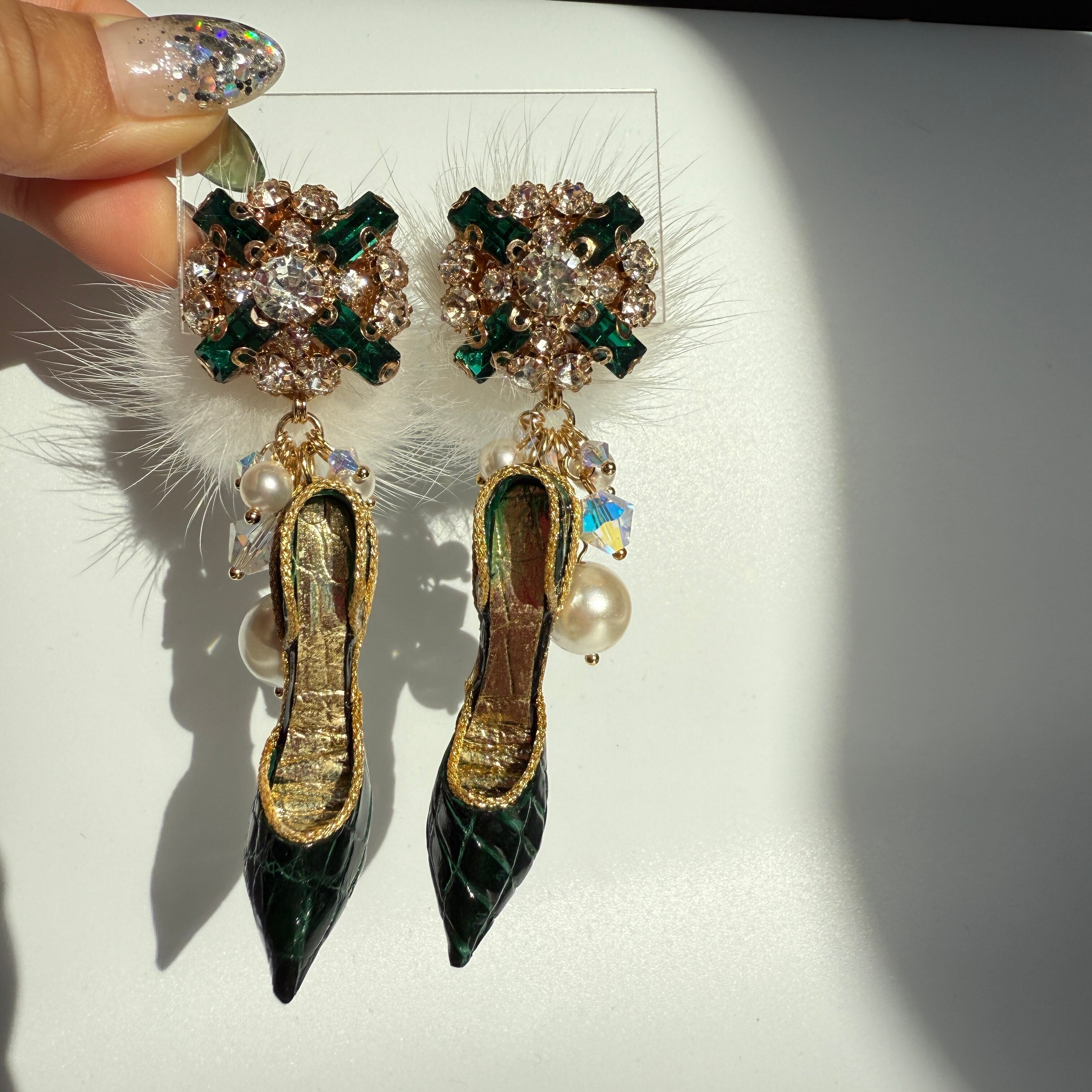Green★クロコハイヒール❤️ミンクファーキャッチ✨ハイヒールピアス ハイヒールイヤリング NO.716